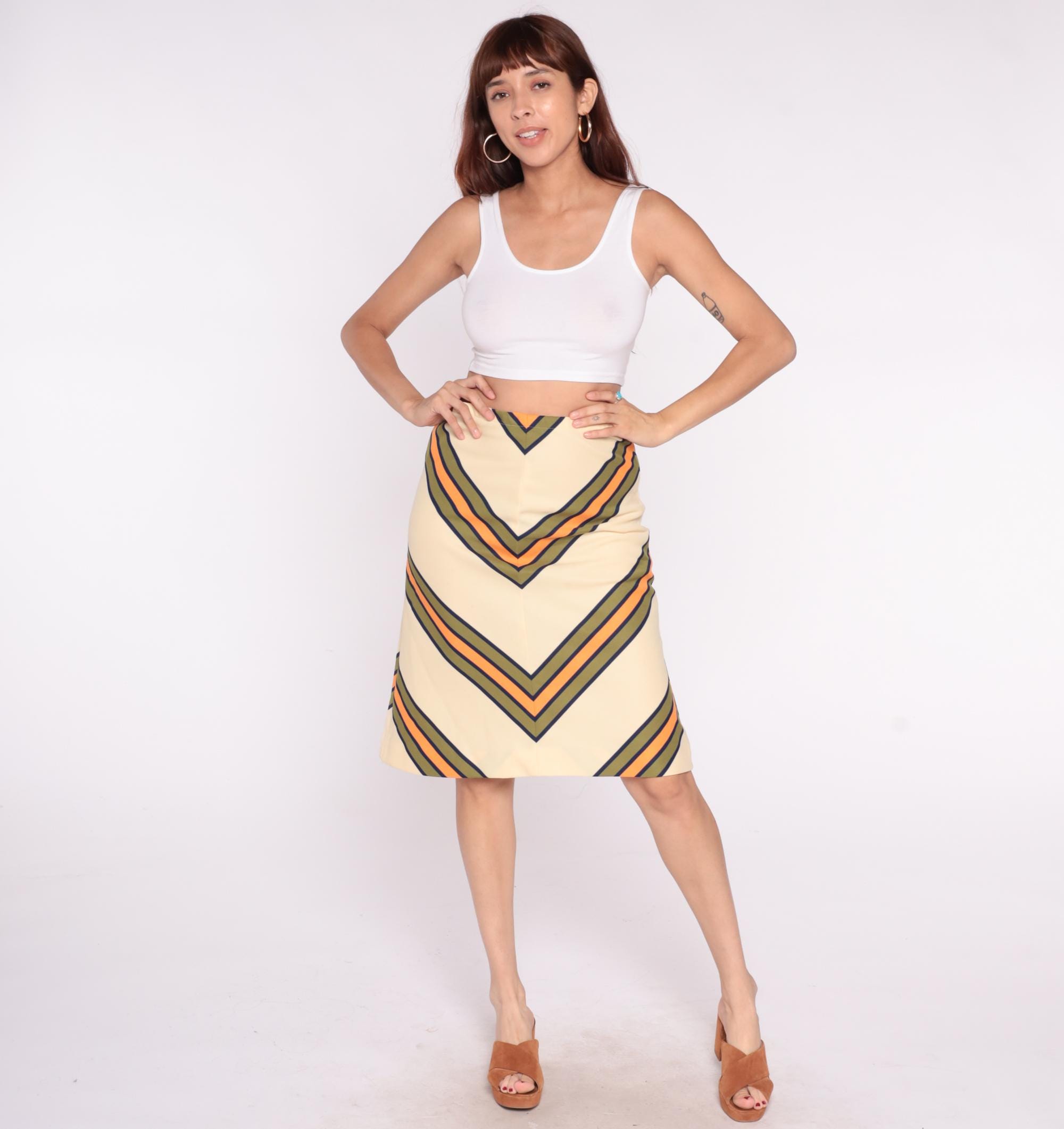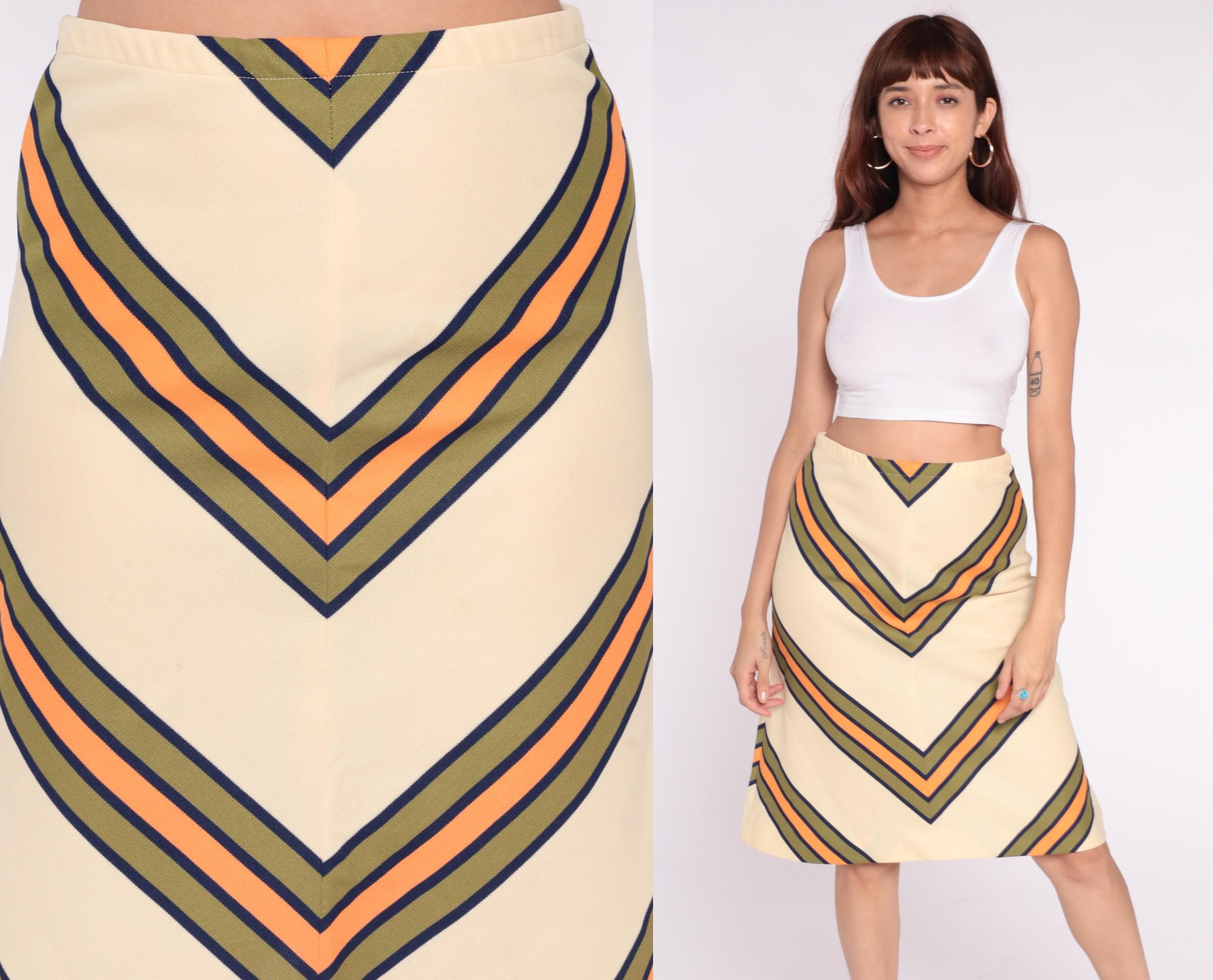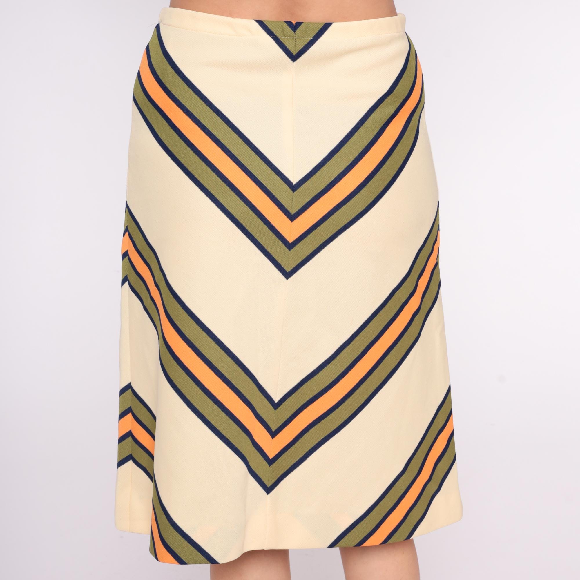 70s cream A-line skirt with chevron stripe pattern in navy, orange, and olive green. Diagonal stripes form repeated V-shapes across the fabric. Fitted waistband and knee-length hem.