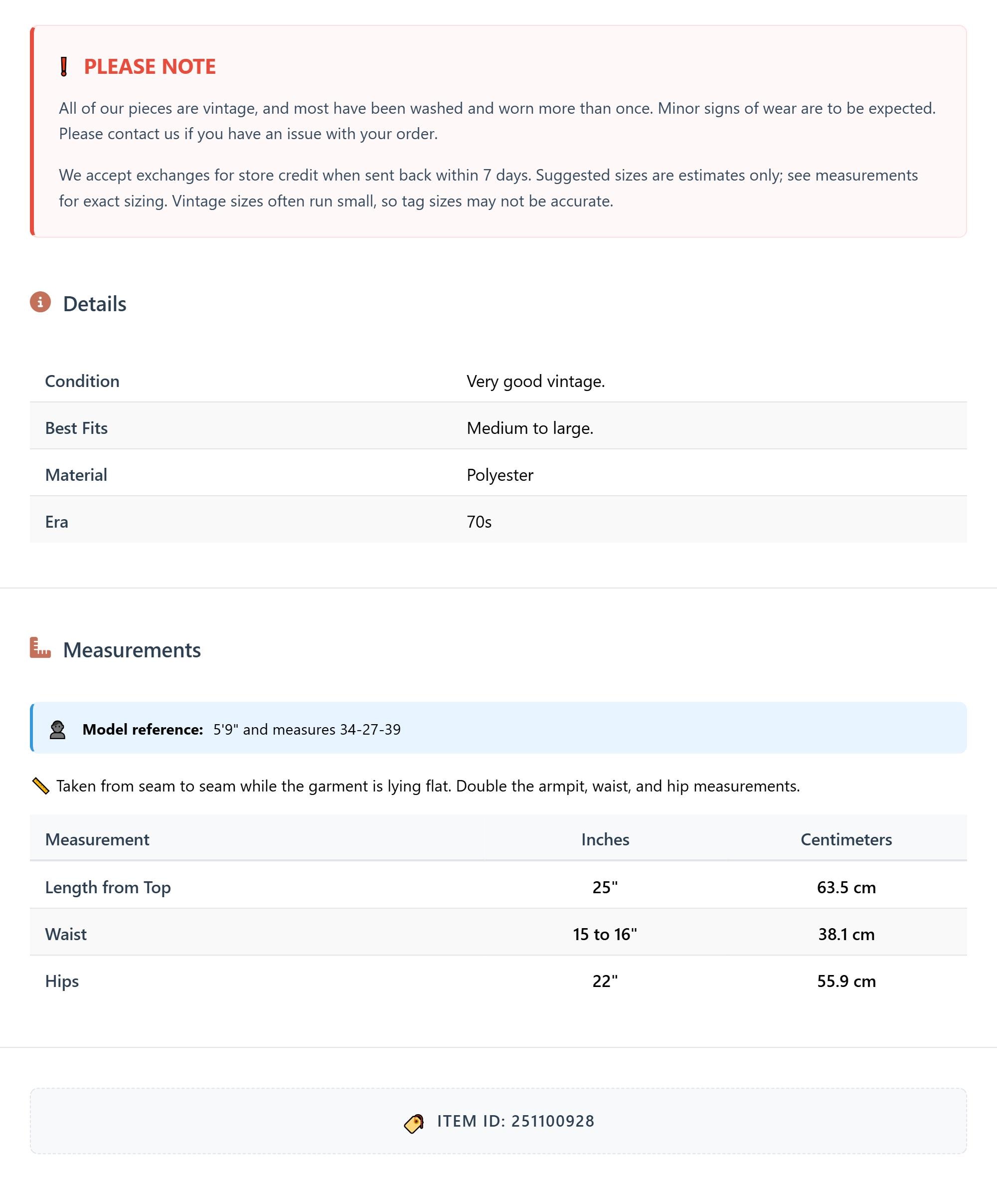 Suggested sizes are estimates only; see measurements for exact sizing. Vintage sizes often run small, so tag sizes may not be accurate.