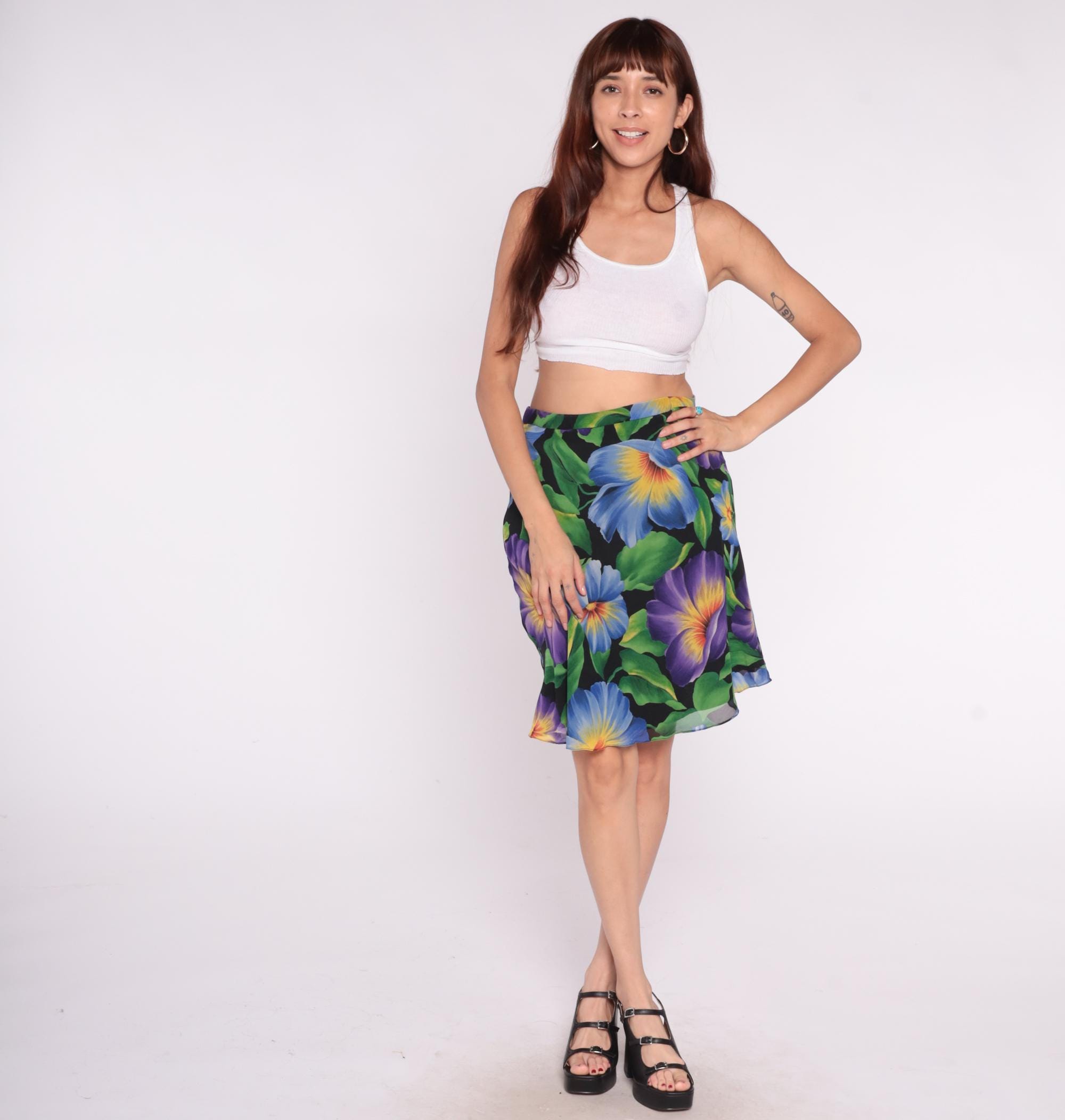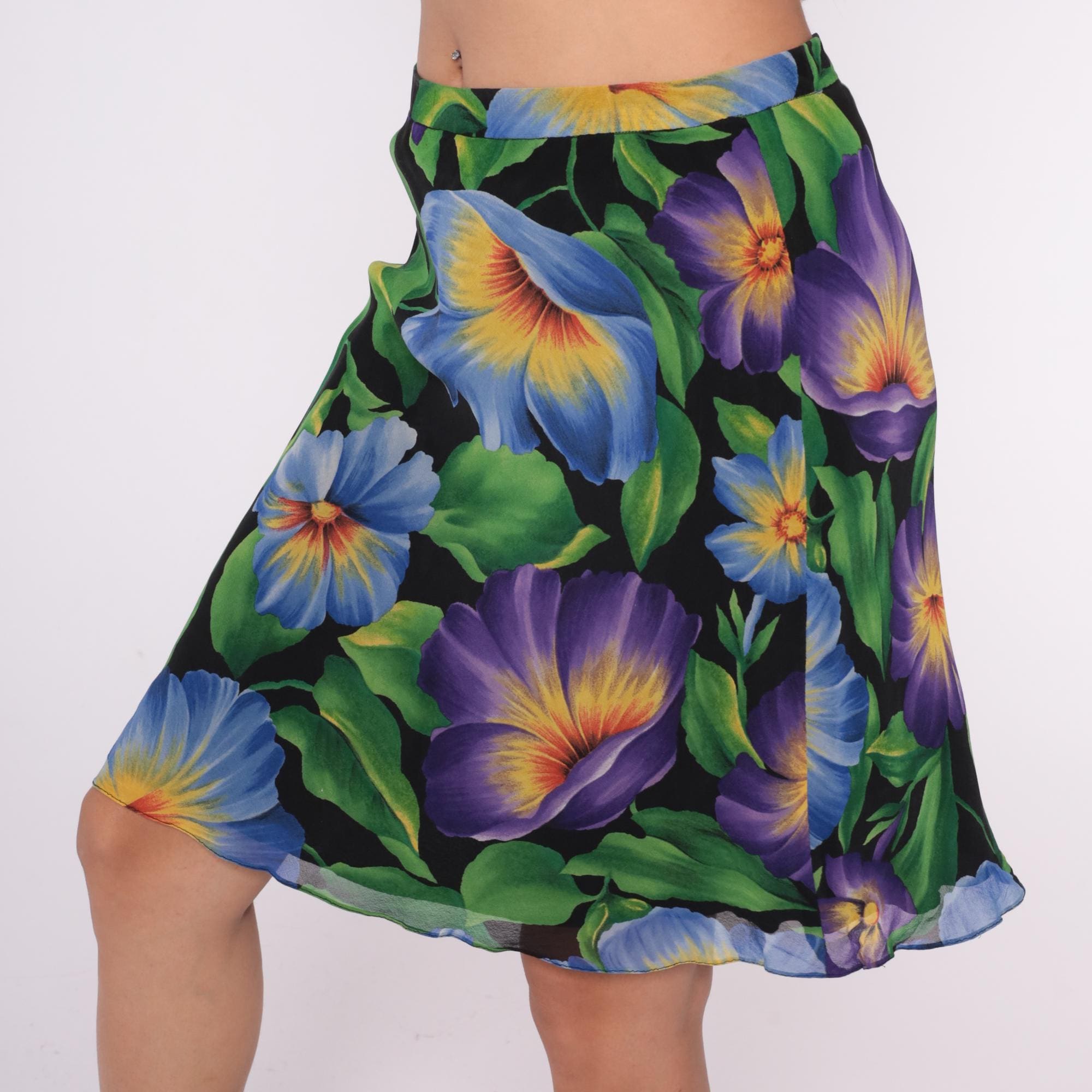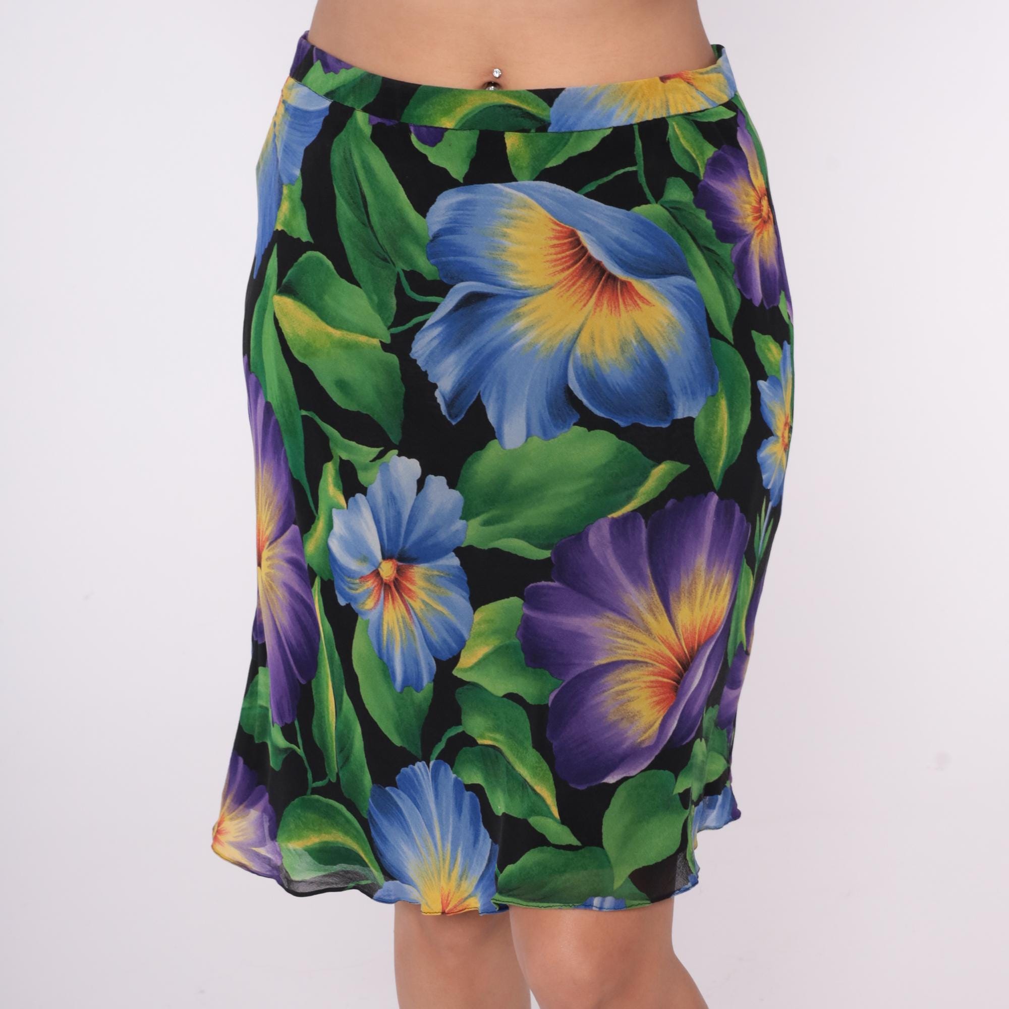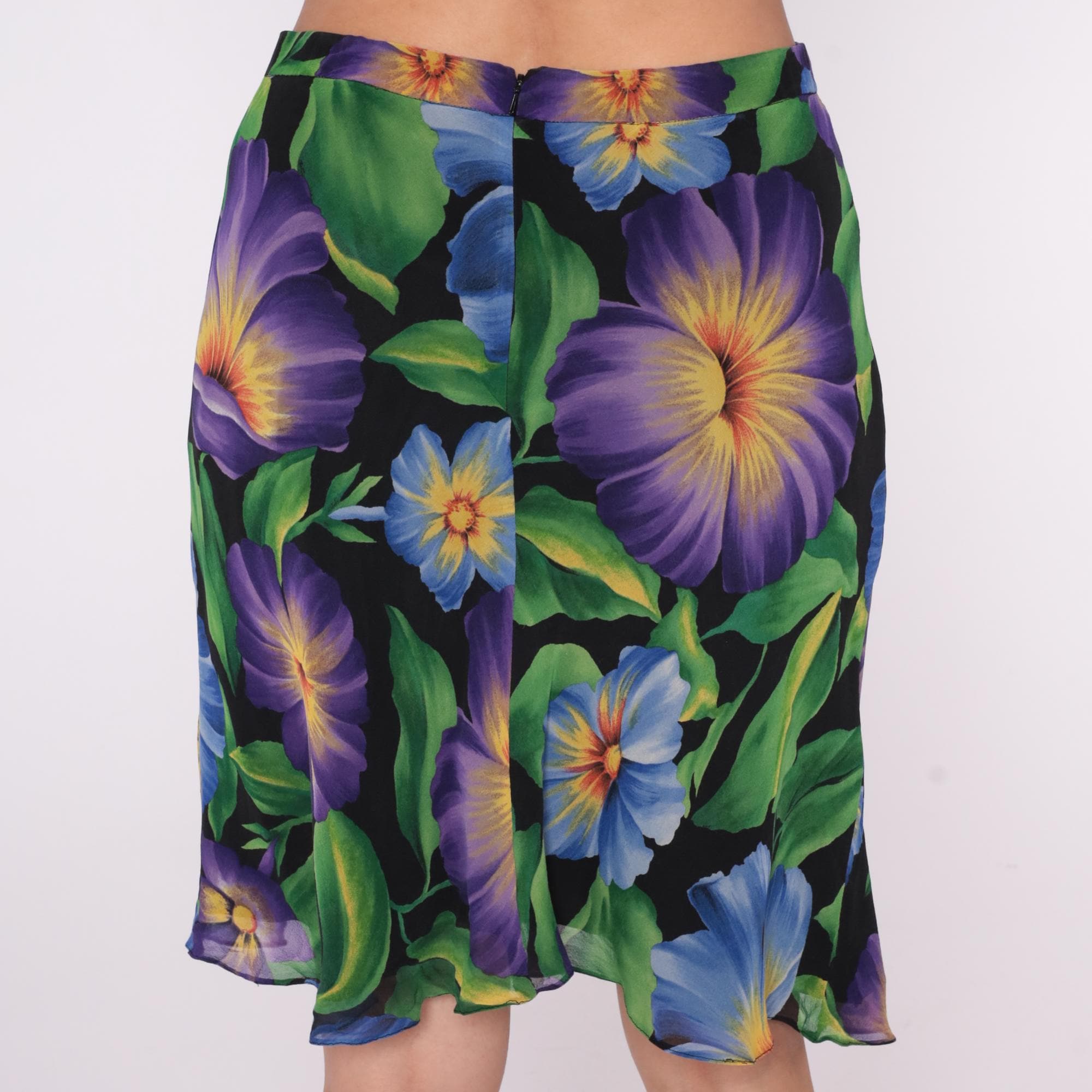 90s floral silk skirt from Liz Claiborne with large purple and blue flowers, green leaves on black background. Bias cut construction, side zip closure, knee-length silhouette. Yellow and orange gradient centers on flowers throughout print.