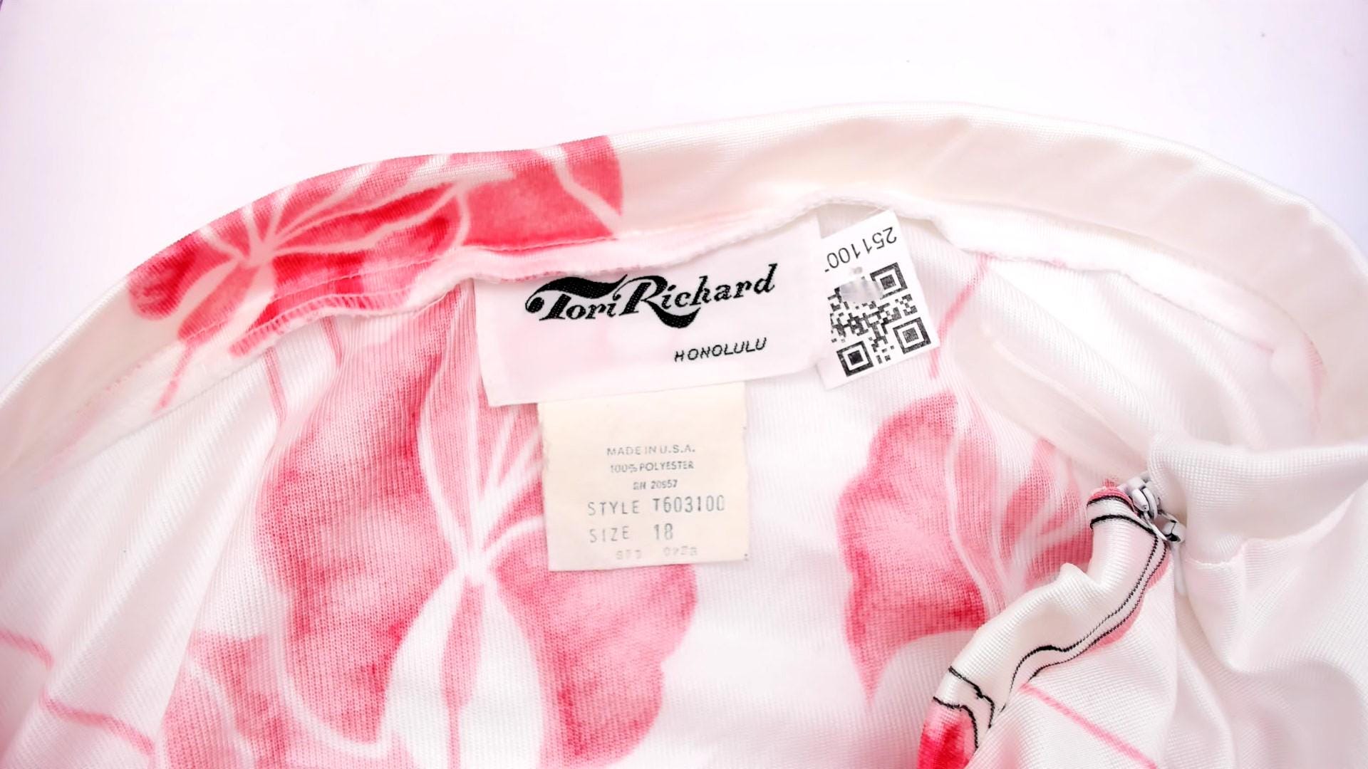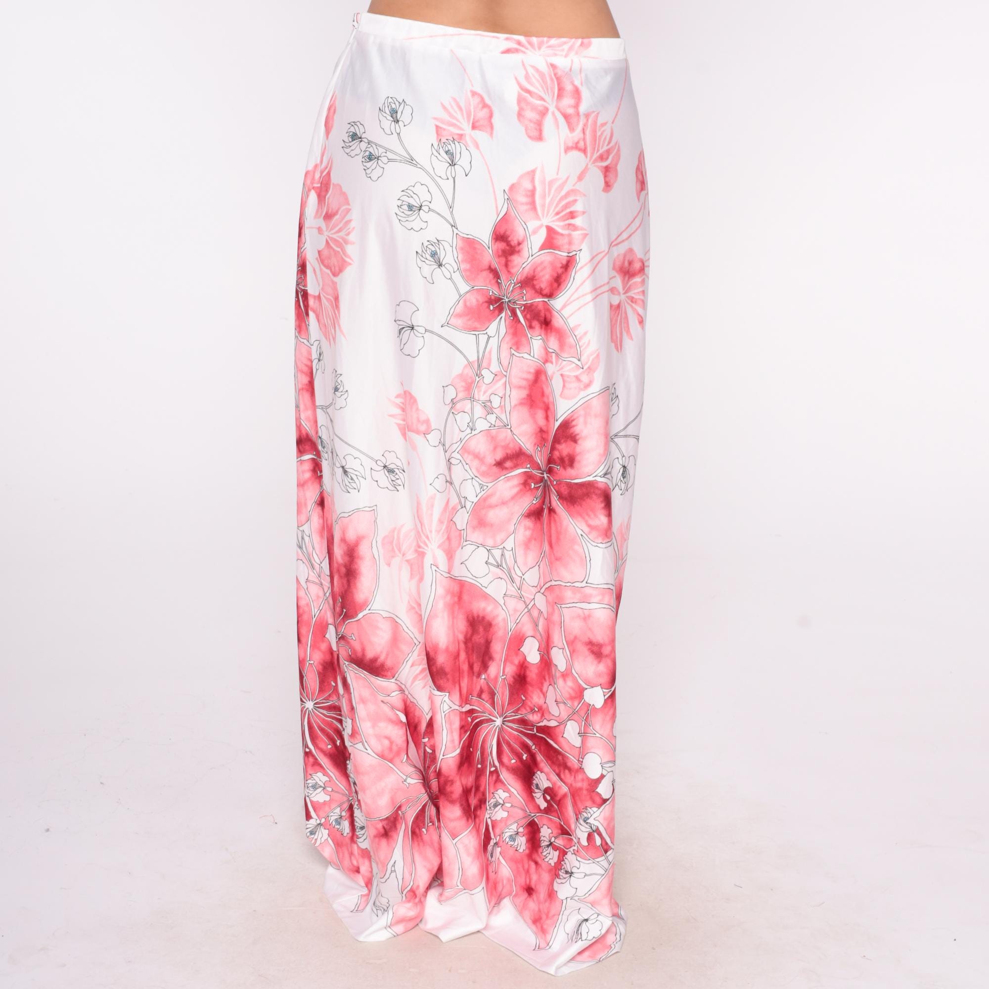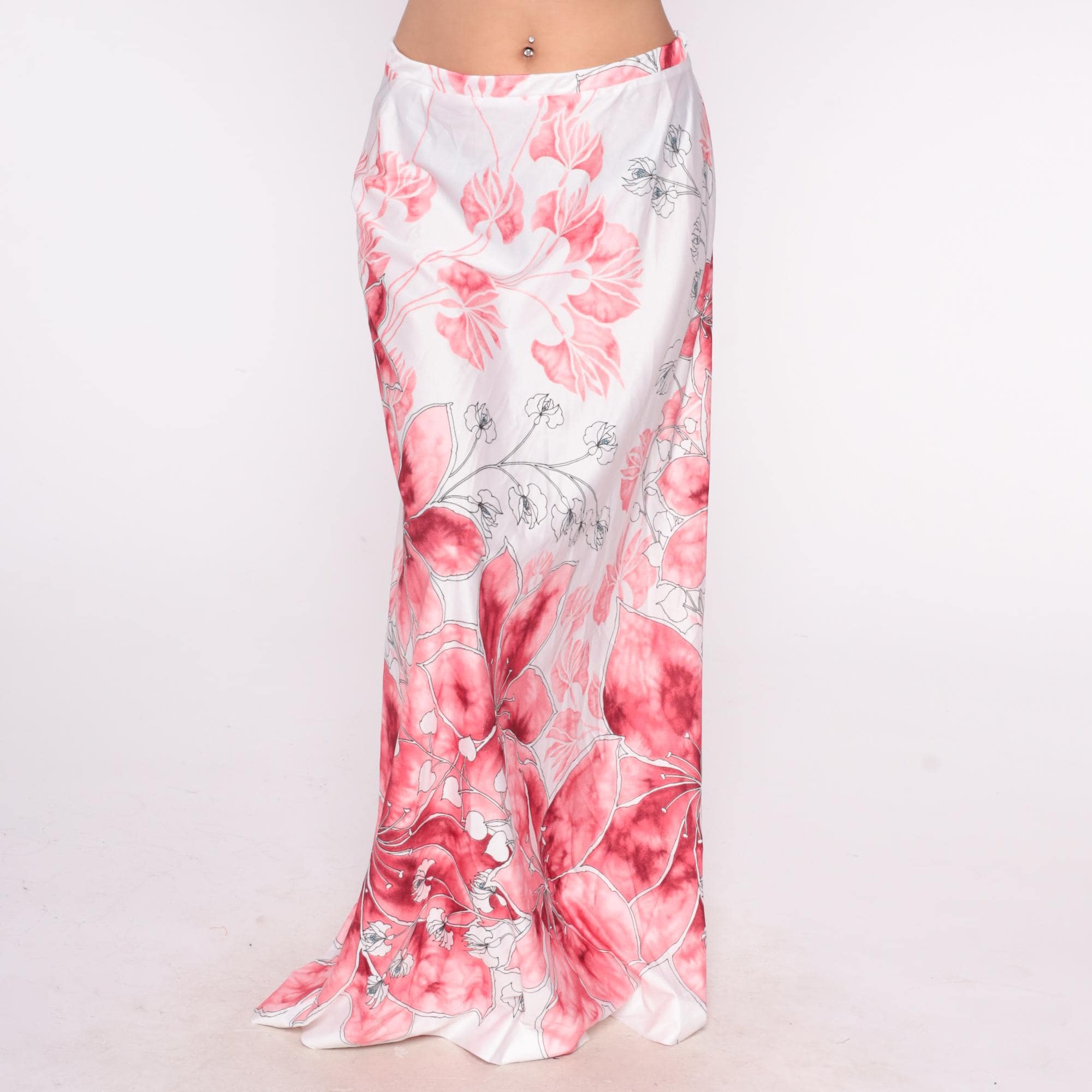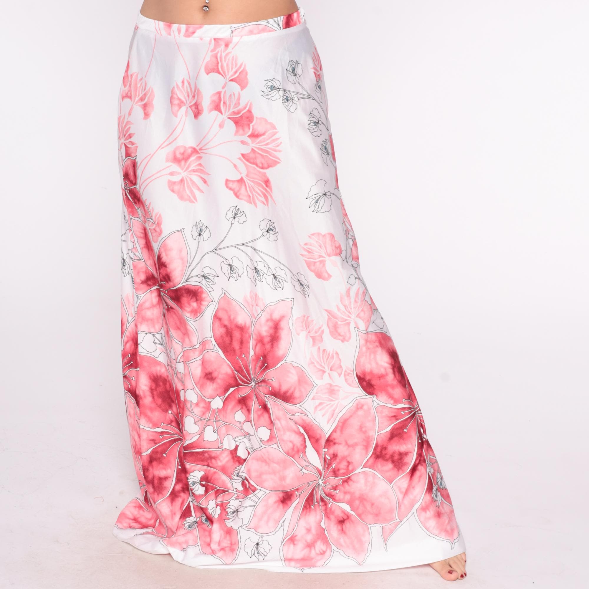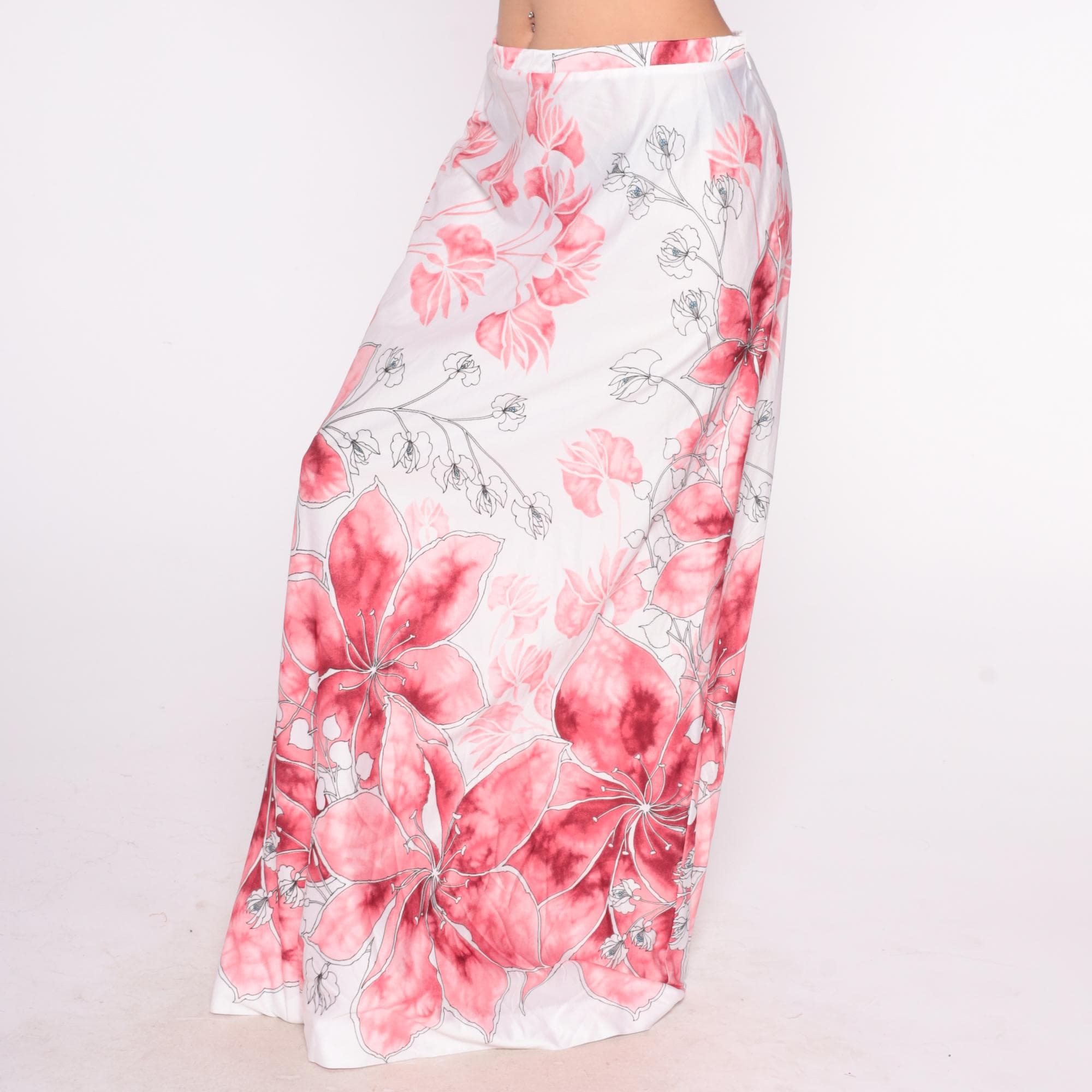 80s pink floral maxi skirt from Tori Richard with watercolor-style pattern of large coral and pink flowers and gray outlined blooms across white fabric. Side zipper closure, floor-length silhouette with floral design concentrated at the hem and fading toward the waist.