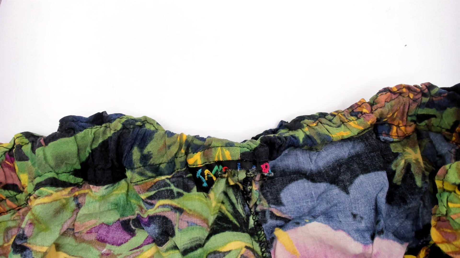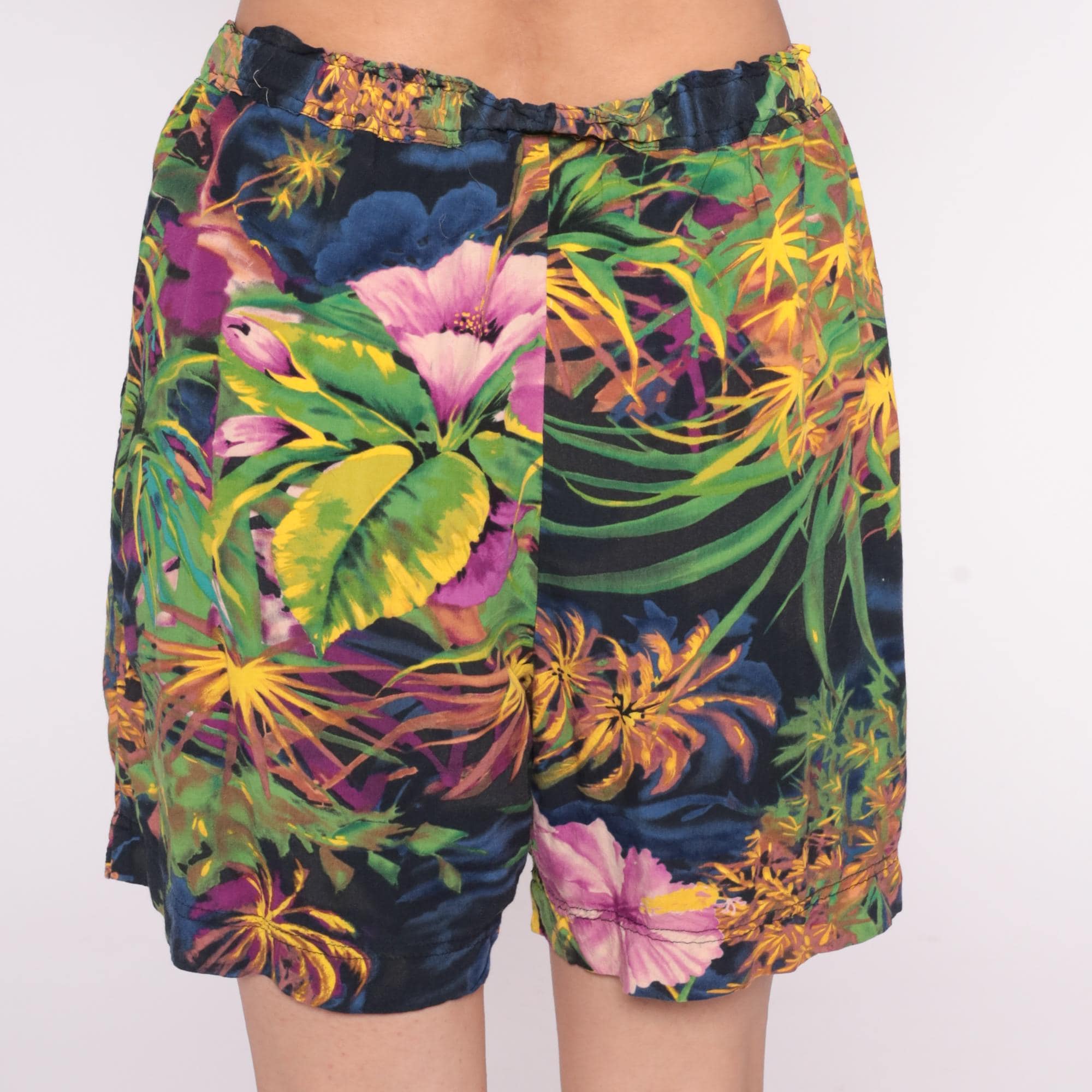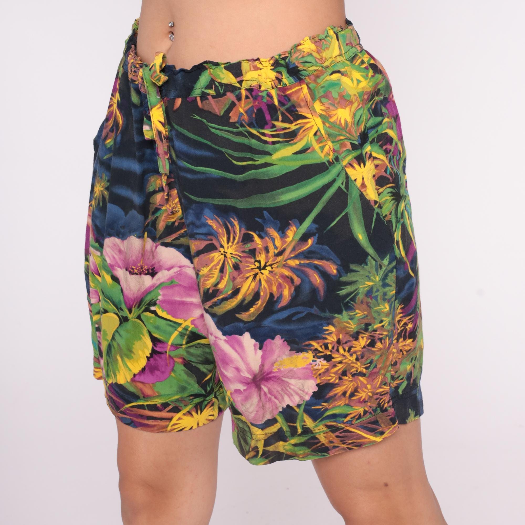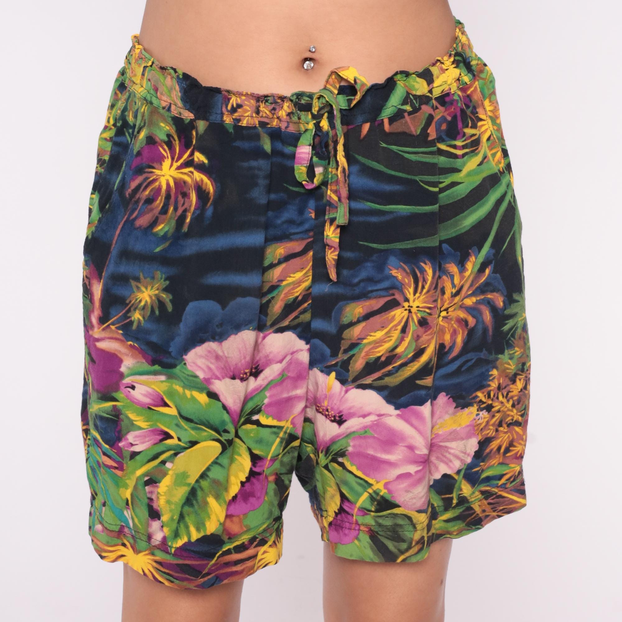 Y2K Hawaiian shorts from Jams World in black rayon with tropical print. Pink hibiscus flowers, orange and yellow palm trees, and green leaves across the fabric. Drawstring waist with matching fabric tie, relaxed fit with side seam pockets.