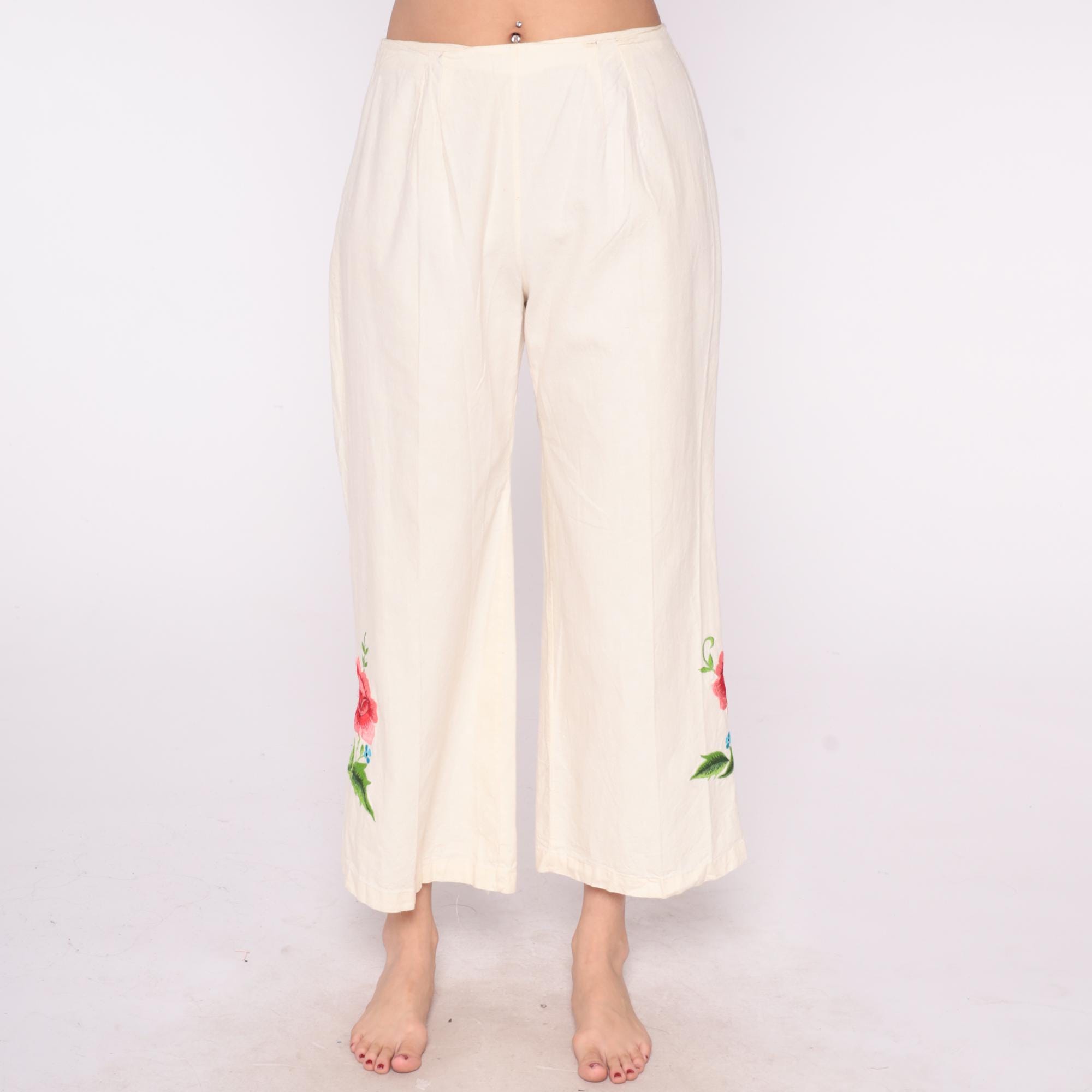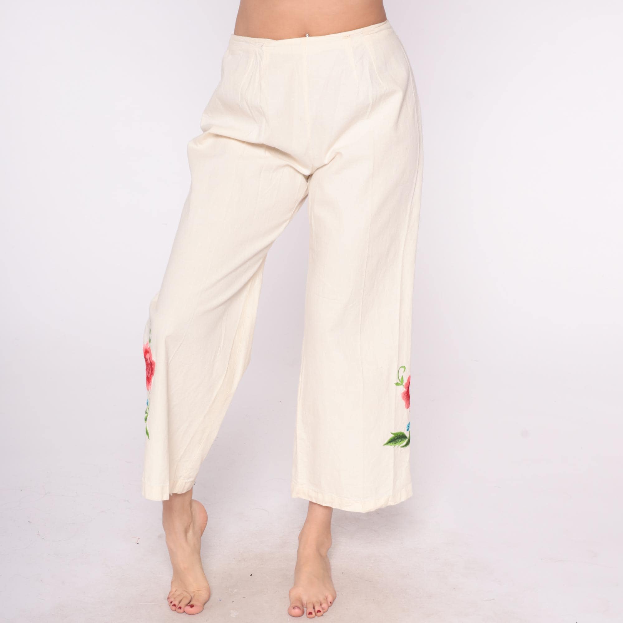 80s cream wide-leg pants with embroidered floral design at the hem, pink poppies with green leaves and blue accent flowers on each leg. High-waisted with pleated front and back zipper closure.