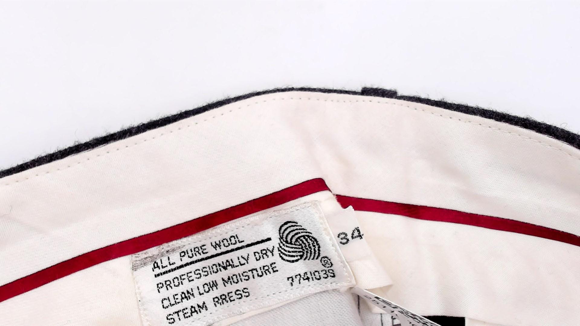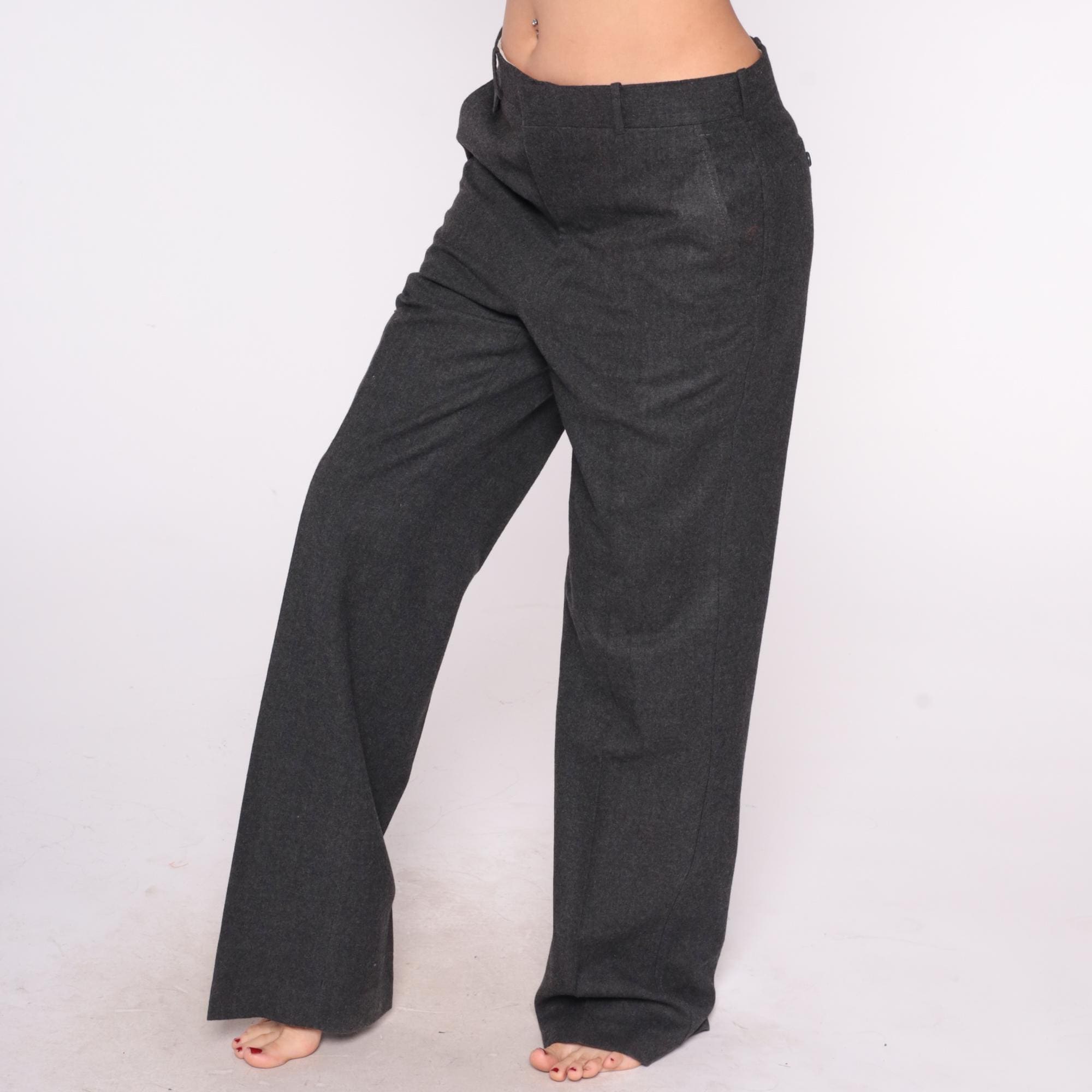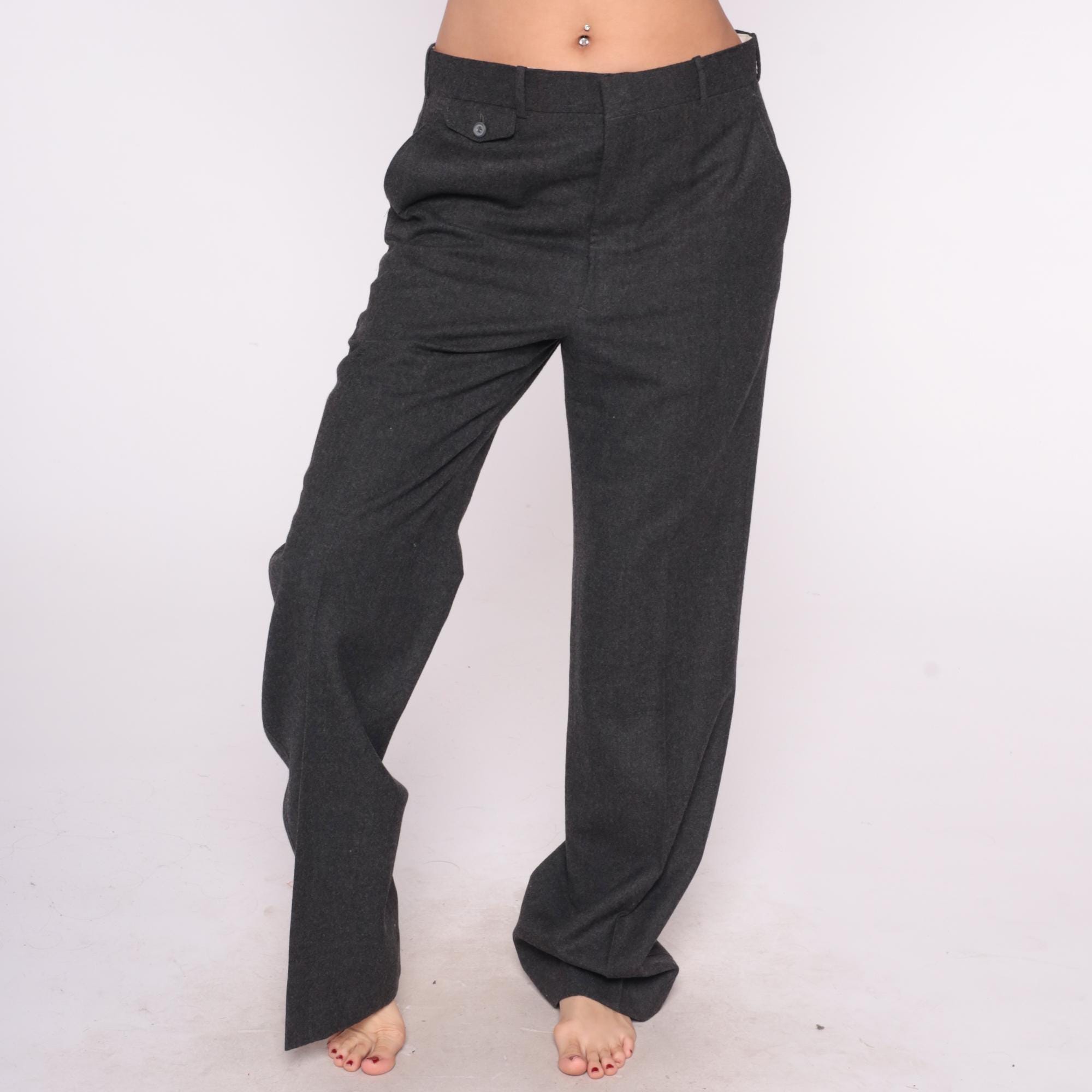 80s charcoal gray straight leg trousers from Presswick & Moore with front button and zip fly closure. Side seam pockets, back welt pockets with button details, belt loops at waist.