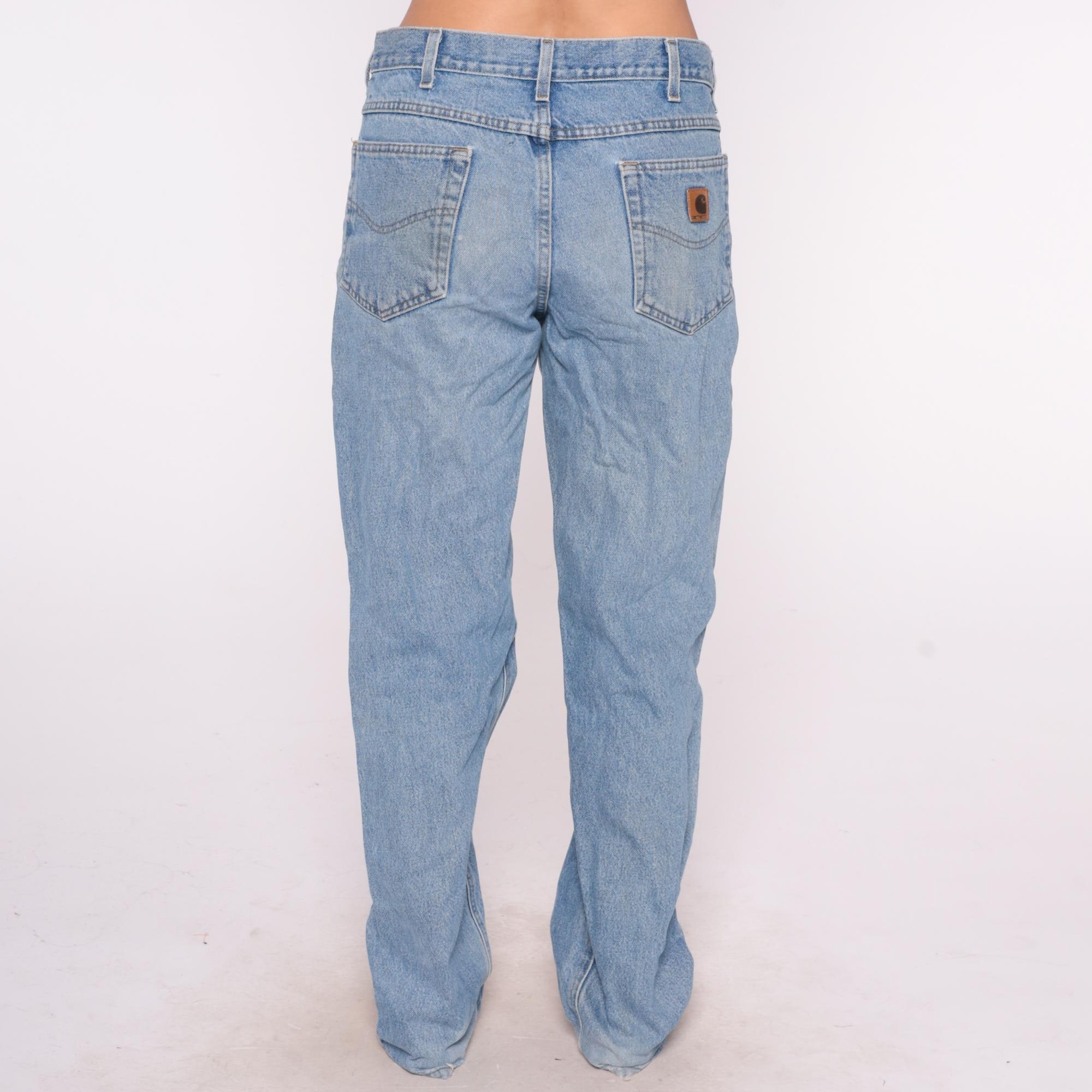 90s light blue Carhartt denim jeans with straight leg cut and button fly closure. Faded wash with paint spots and distressed areas throughout, brown leather logo patch on back right pocket.