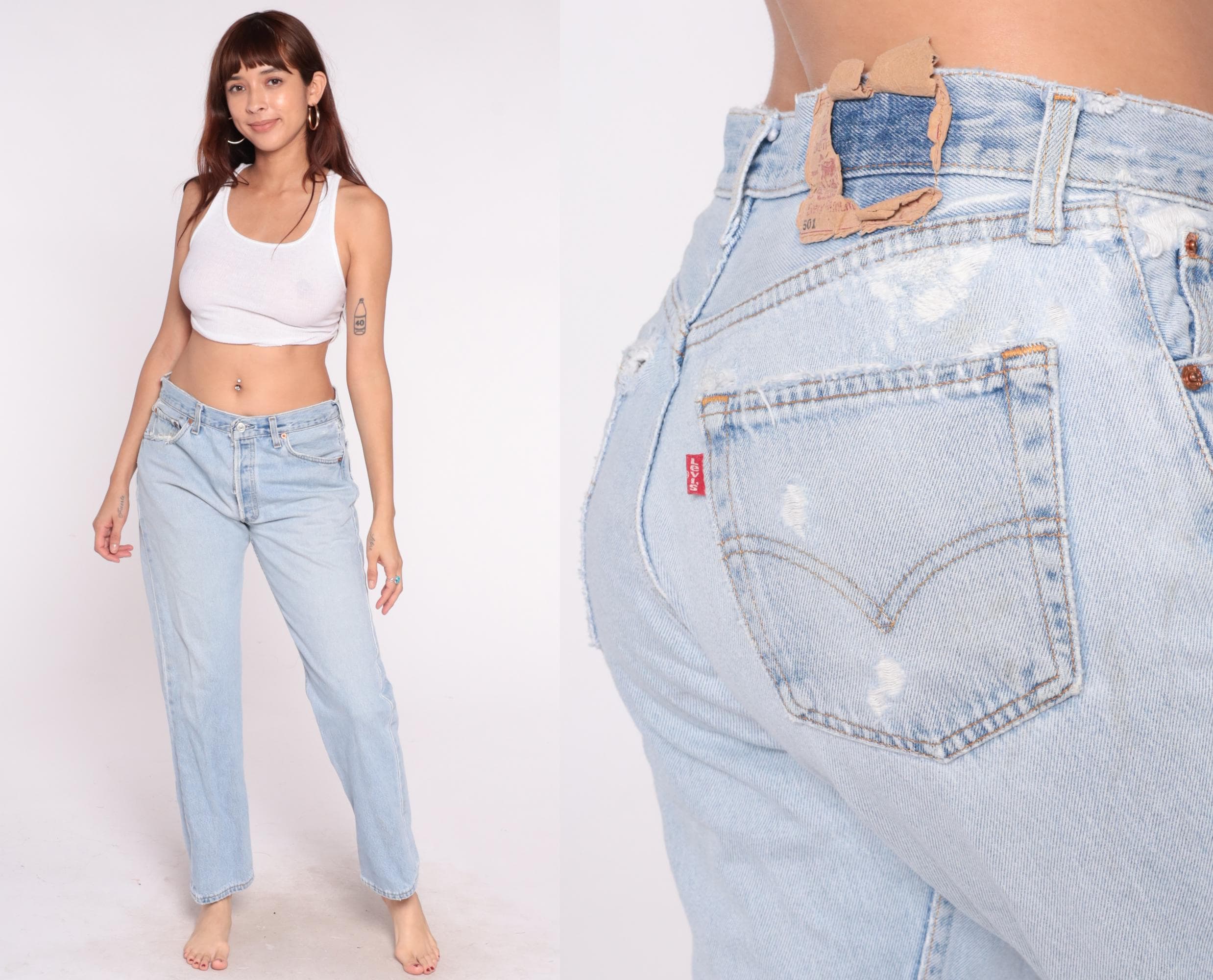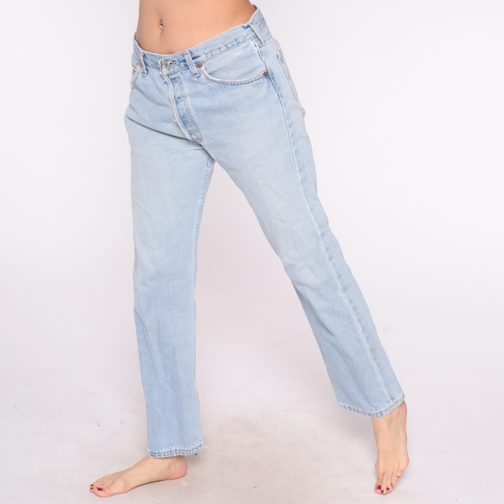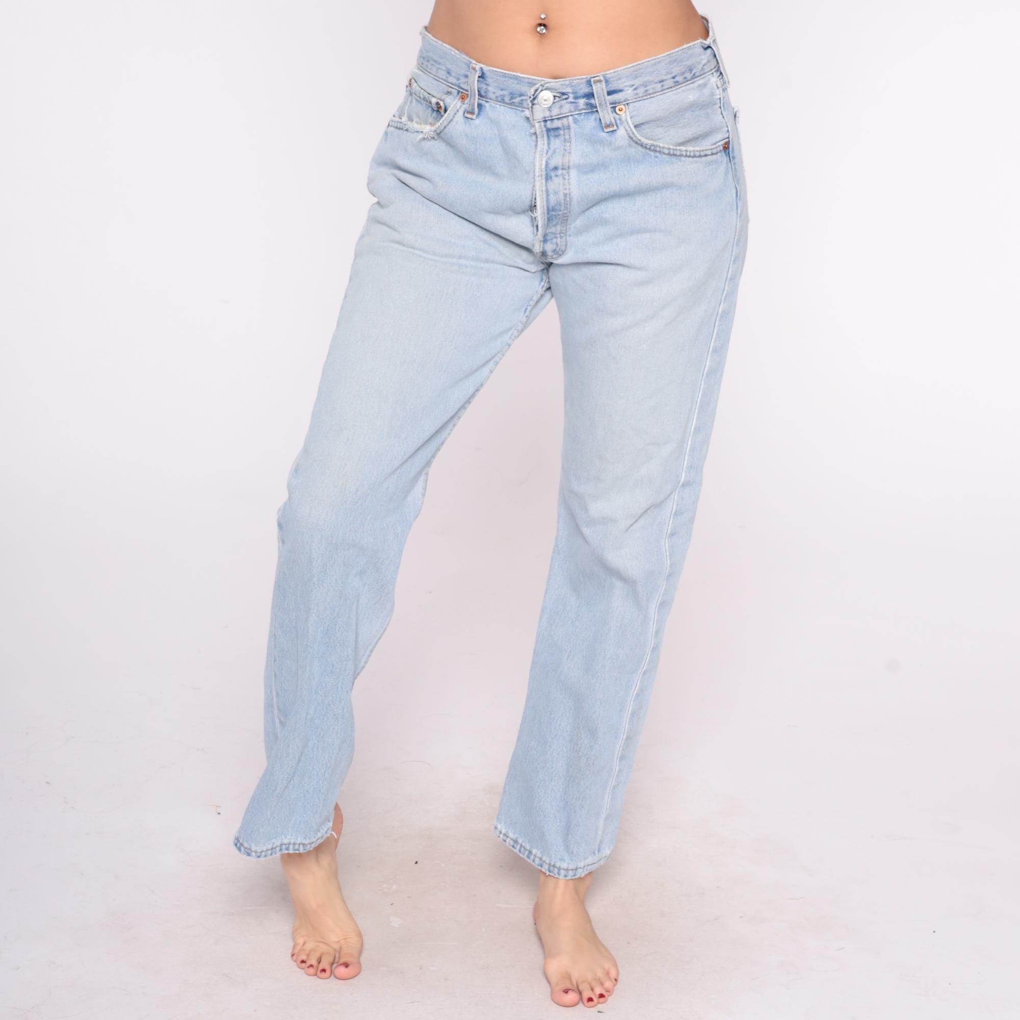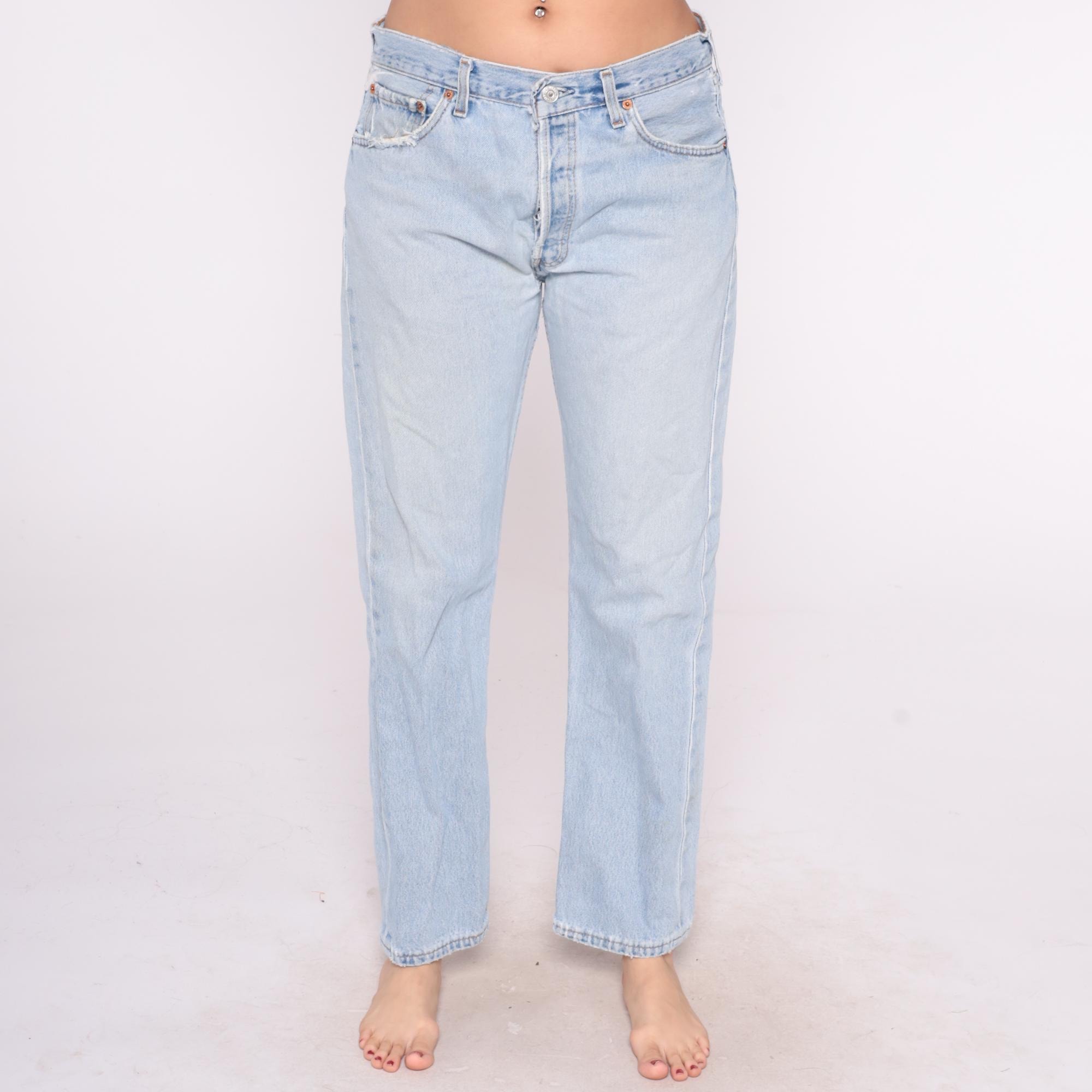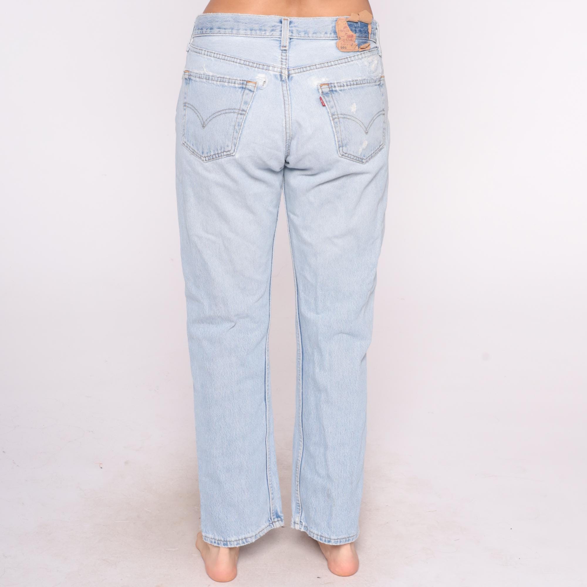 90s light blue Levi's 501 jeans with button fly closure and straight leg. High-waisted fit with five-pocket styling and distressed details throughout.