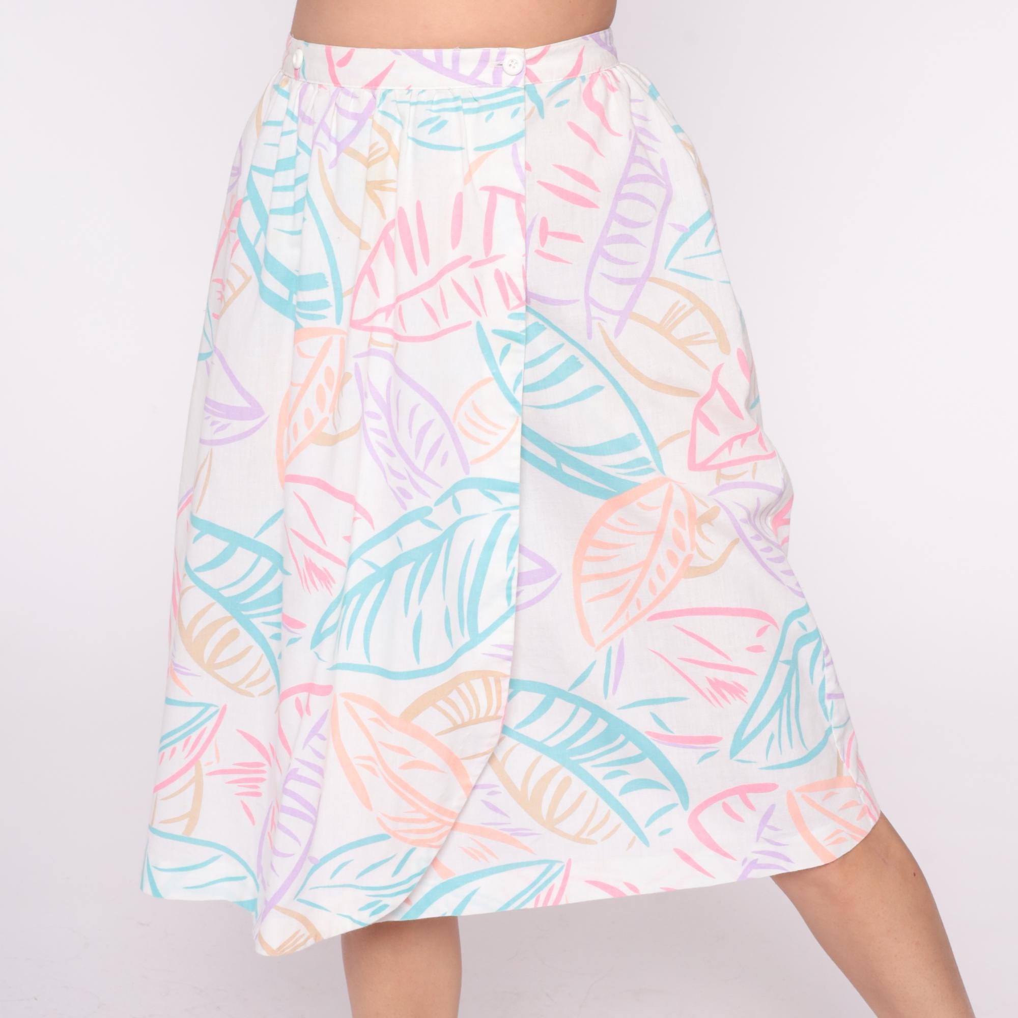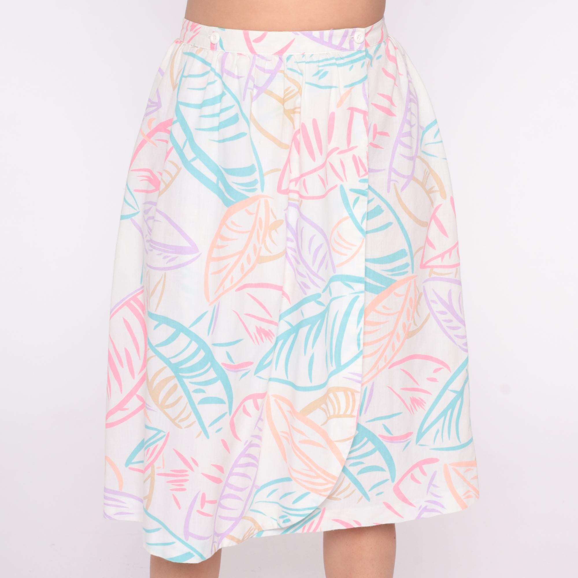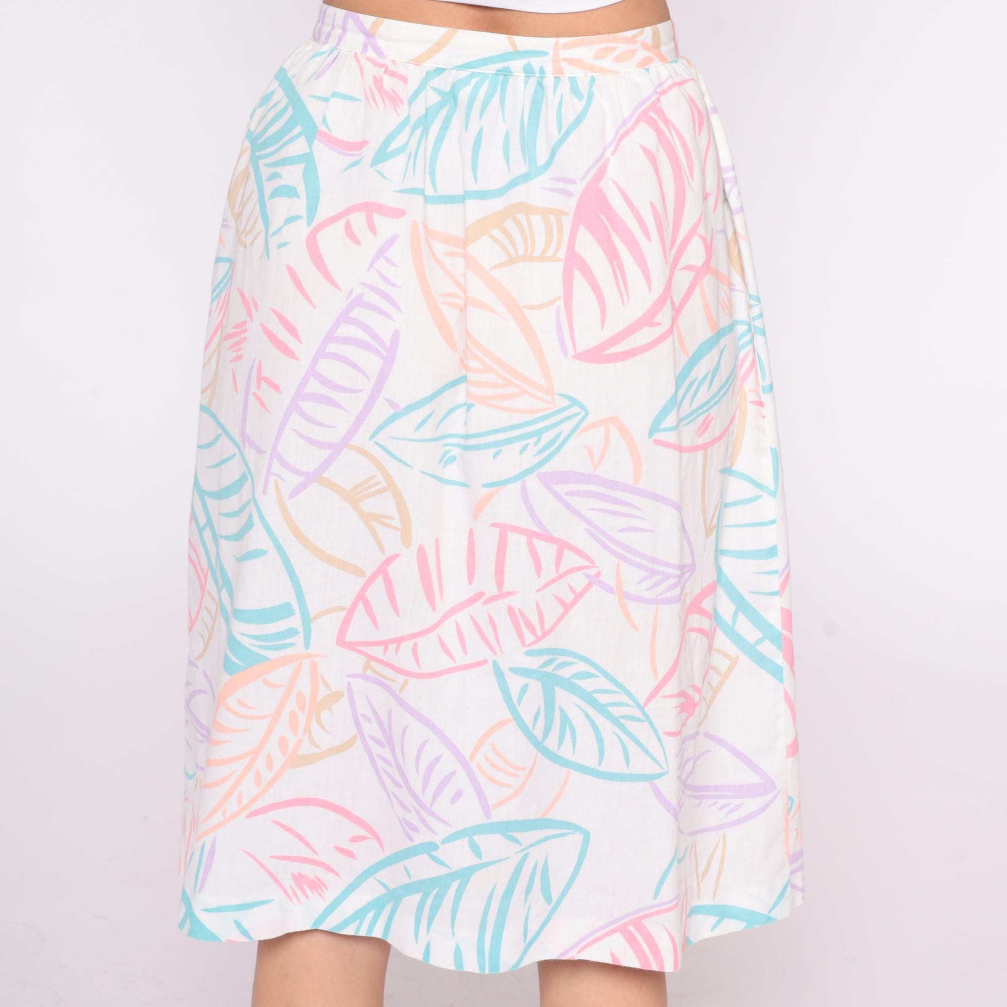 80s white skirt with tropical leaf print in pastel pink, lavender, turquoise, and peach from salem. A-line silhouette.