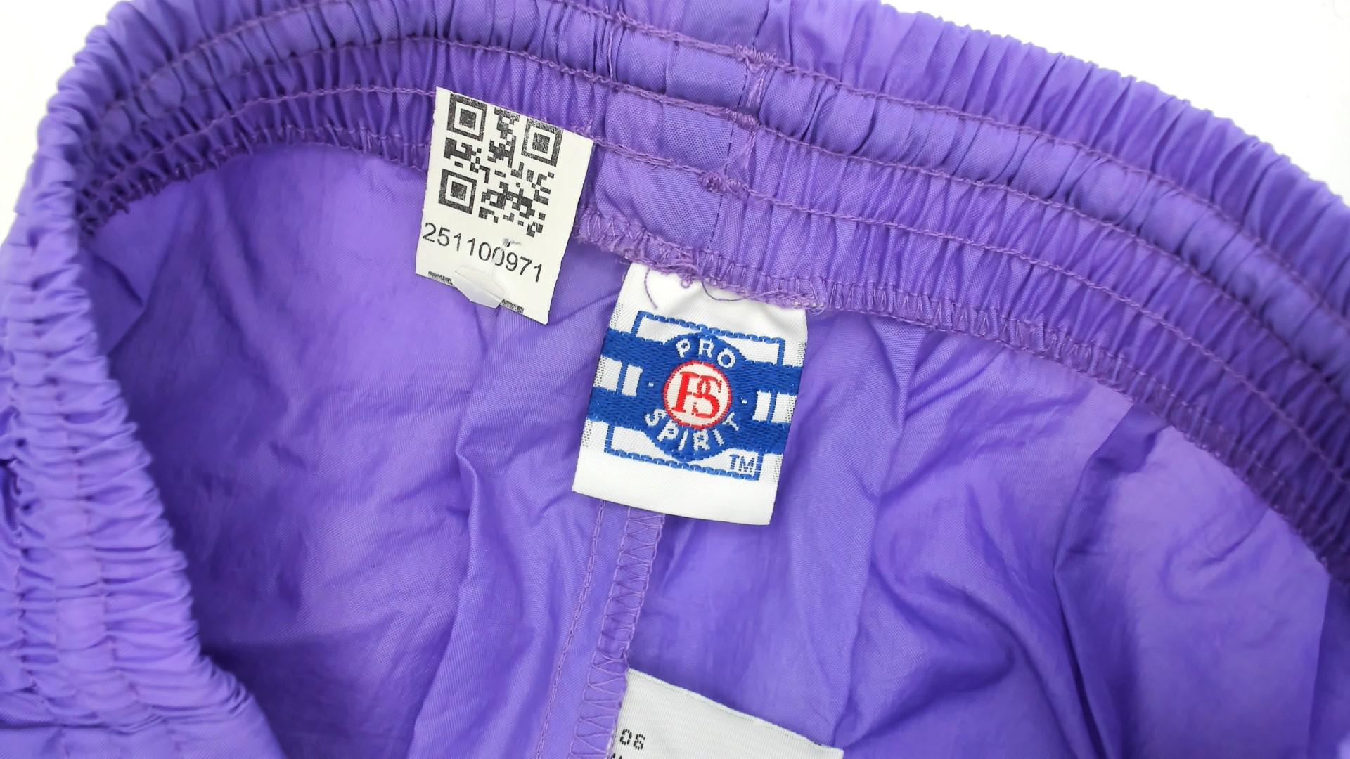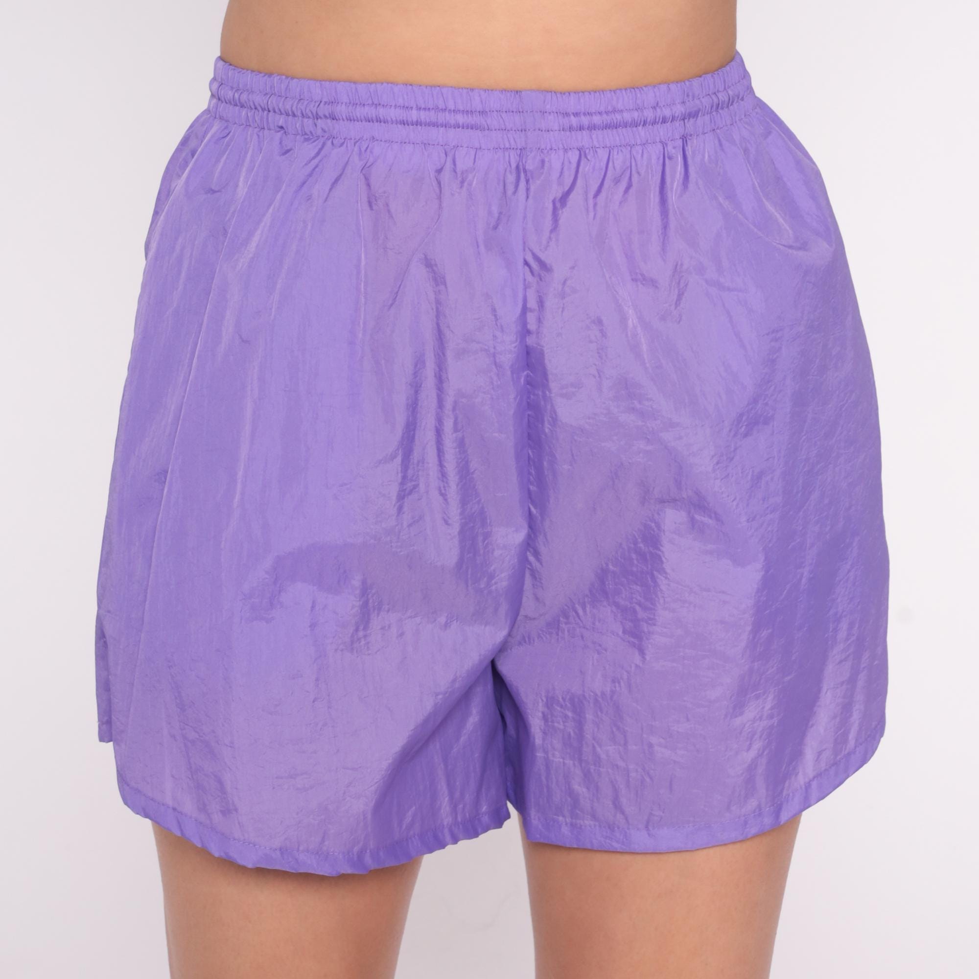 Purple athletic shorts from the 1980s with elastic waistband and short inseam.