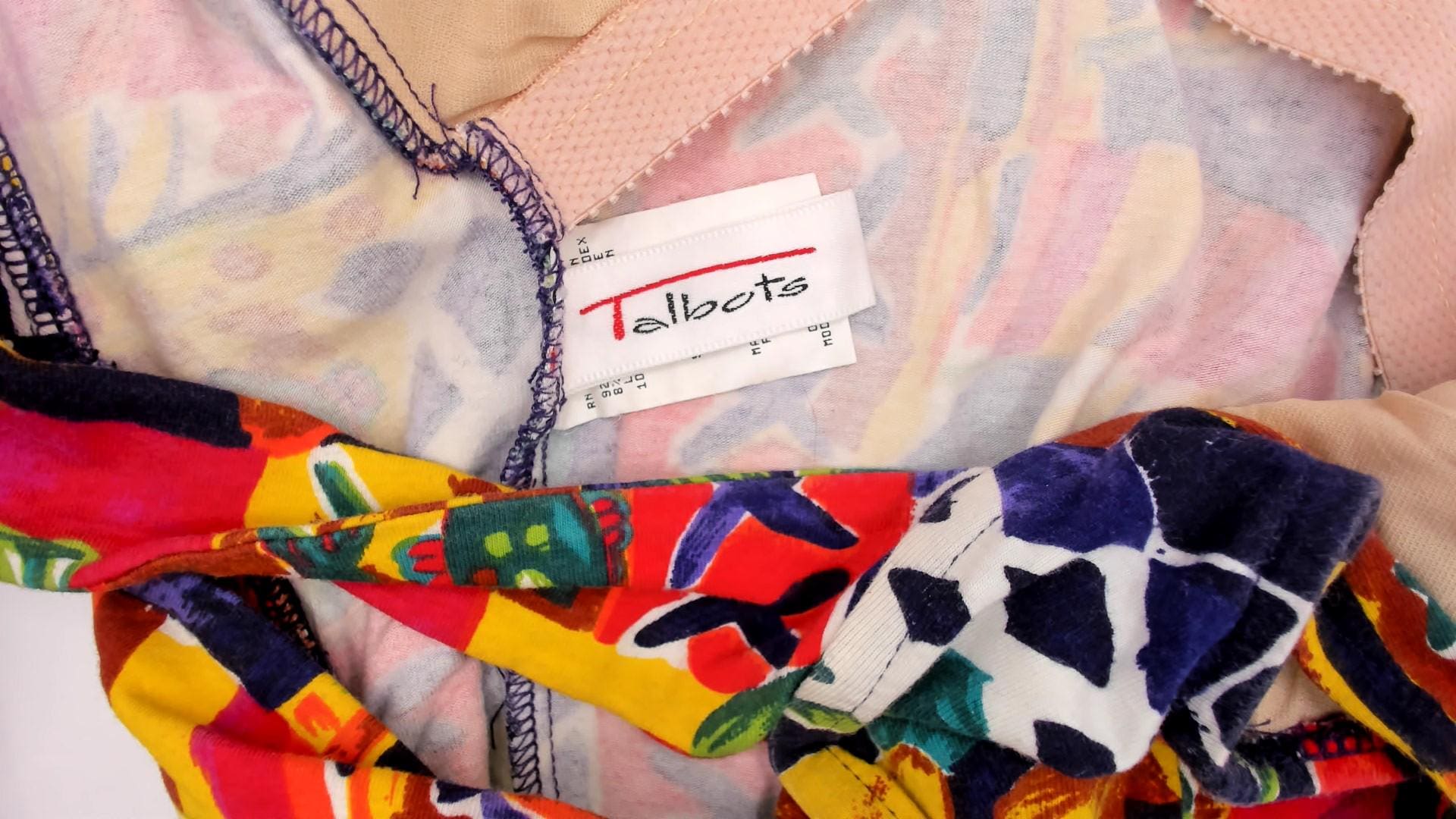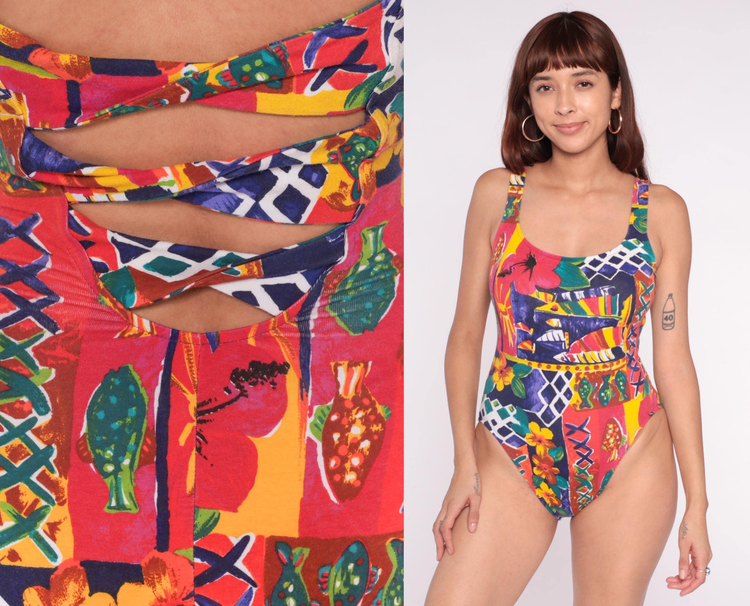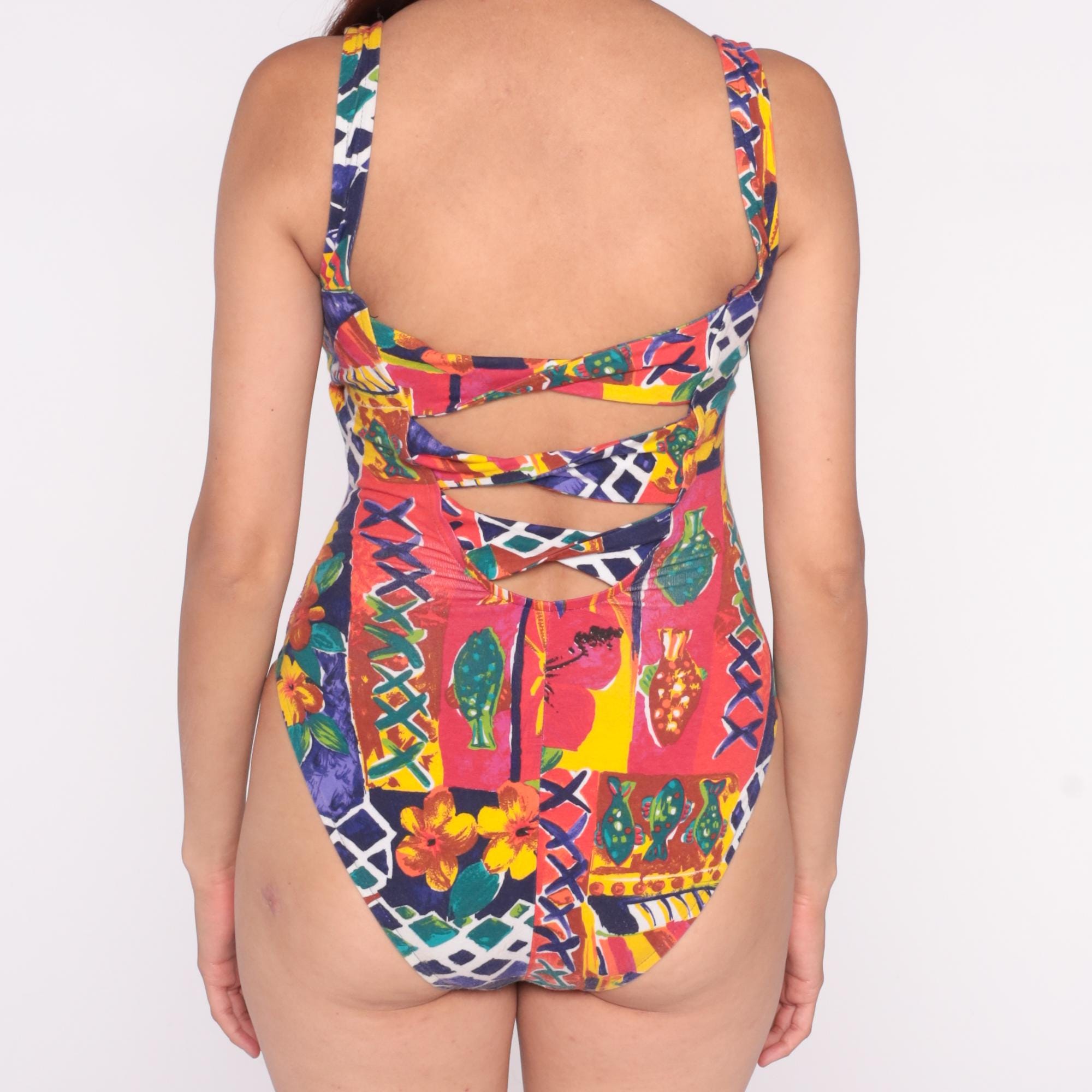 90s multicolor one-piece swimsuit from Talbots with tropical print featuring fish, geometric patterns, and flowers in red, pink, purple, yellow, teal, and orange. Scooped neckline, tank straps, high-cut leg openings, and three horizontal cutout bands across the back.