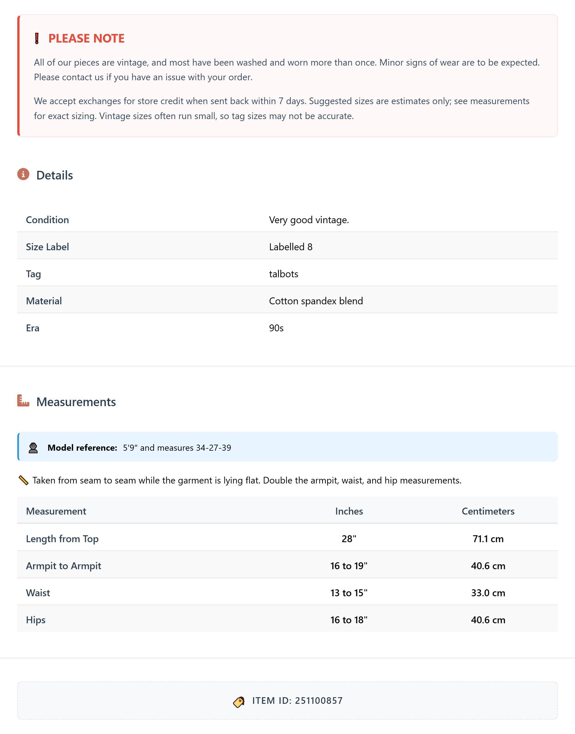 Measurements are taken laying flat and should be doubled where applicable. The "best fits" size is just an estimate, and vintage sizing can vary from modern sizing. Please use measurements to ensure proper fit. The best thing to do is measure a similar item of your own, and compare. When an item has stretch, we will list the unstretched dimensions with the stretched measurement afterwards.