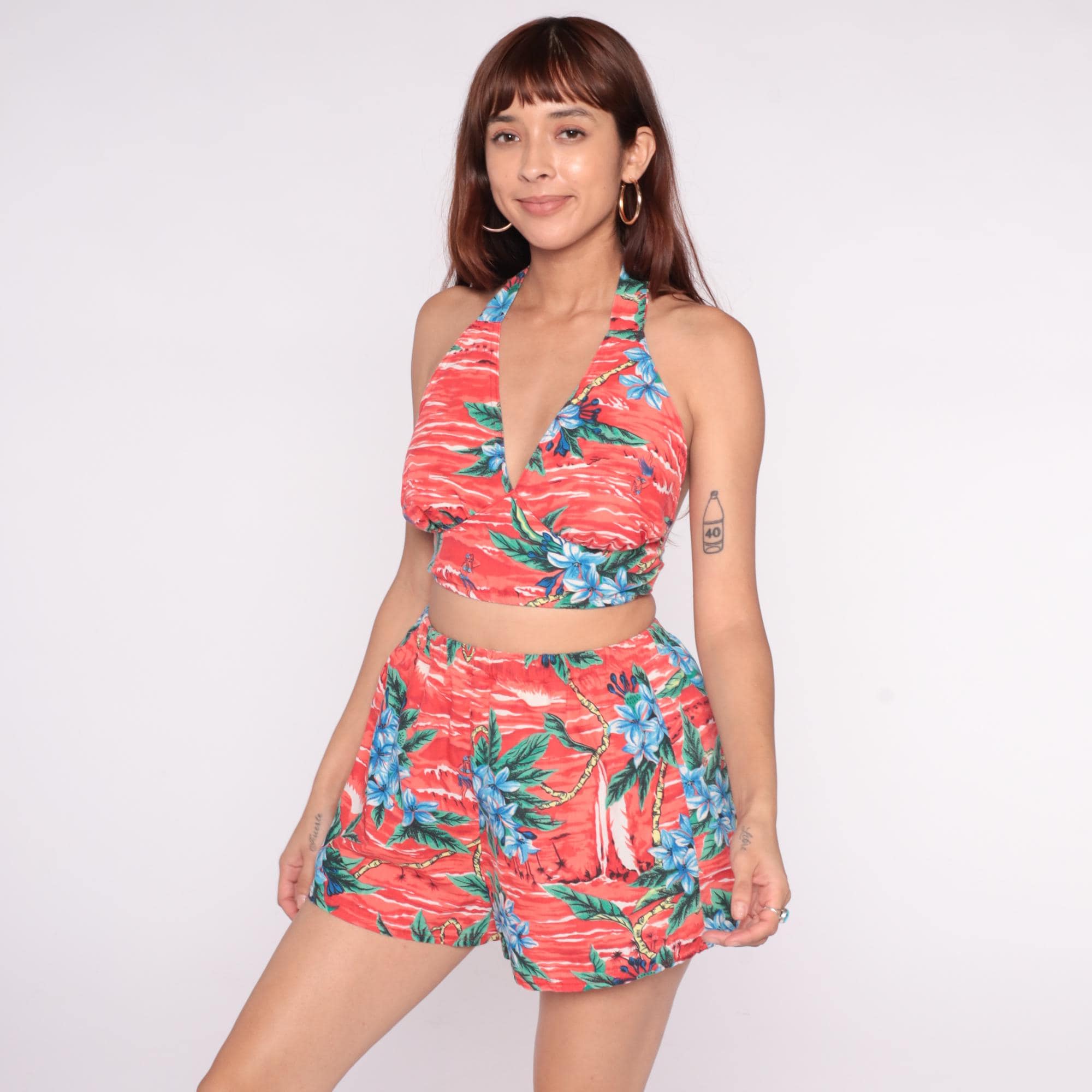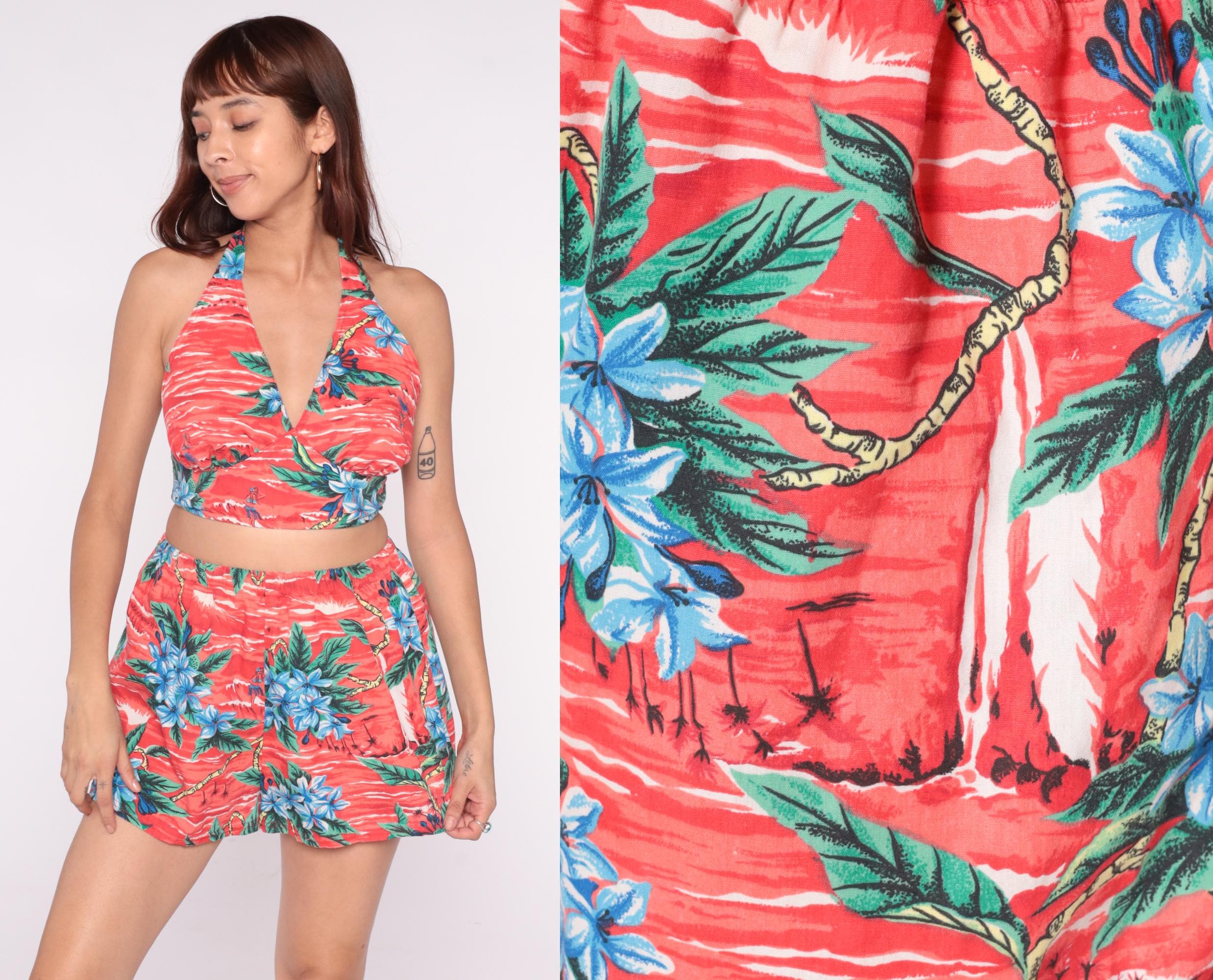 90s two-piece swimsuit set in pink coral with tropical Hawaiian print featuring blue flowers, green palm leaves, and yellow rope chain details across the fabric. Halter bikini top with wrap-around neck tie and back closure. High-waisted swim shorts with elastic waistband.