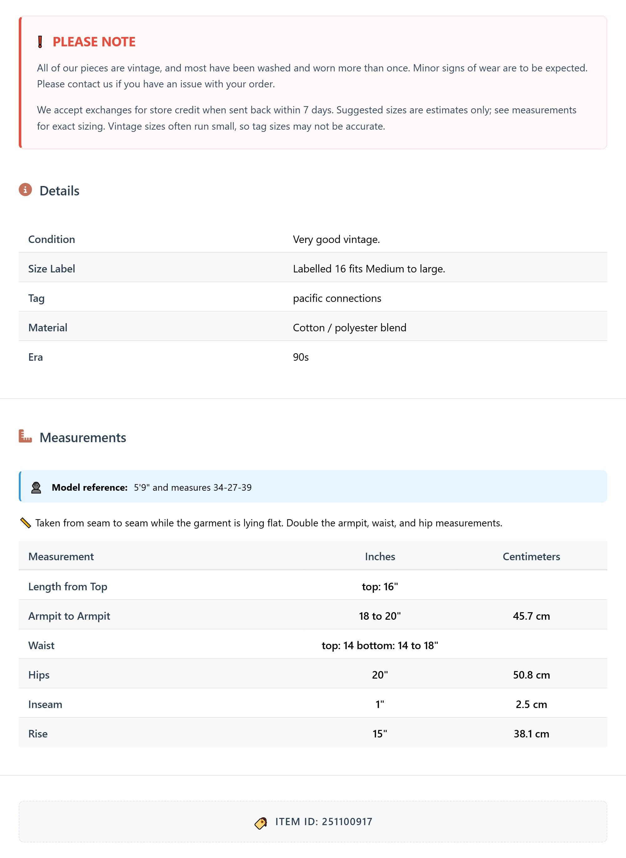All of our pieces are vintage, and most have been washed and worn more than once. Minor signs of wear are to be expected. Please contact us if you have an issue with your order. We accept exchanges for store credit when sent back within 7 days.