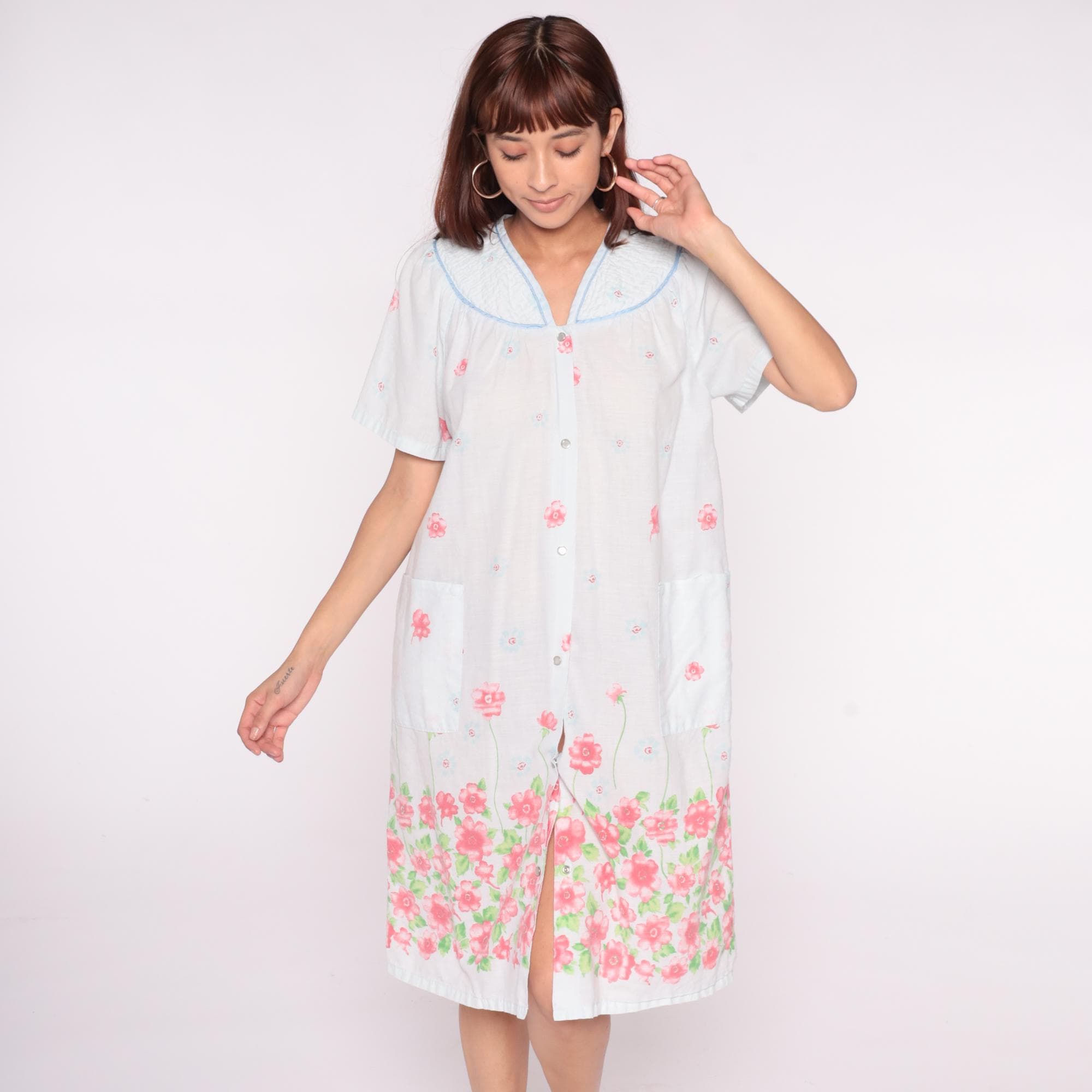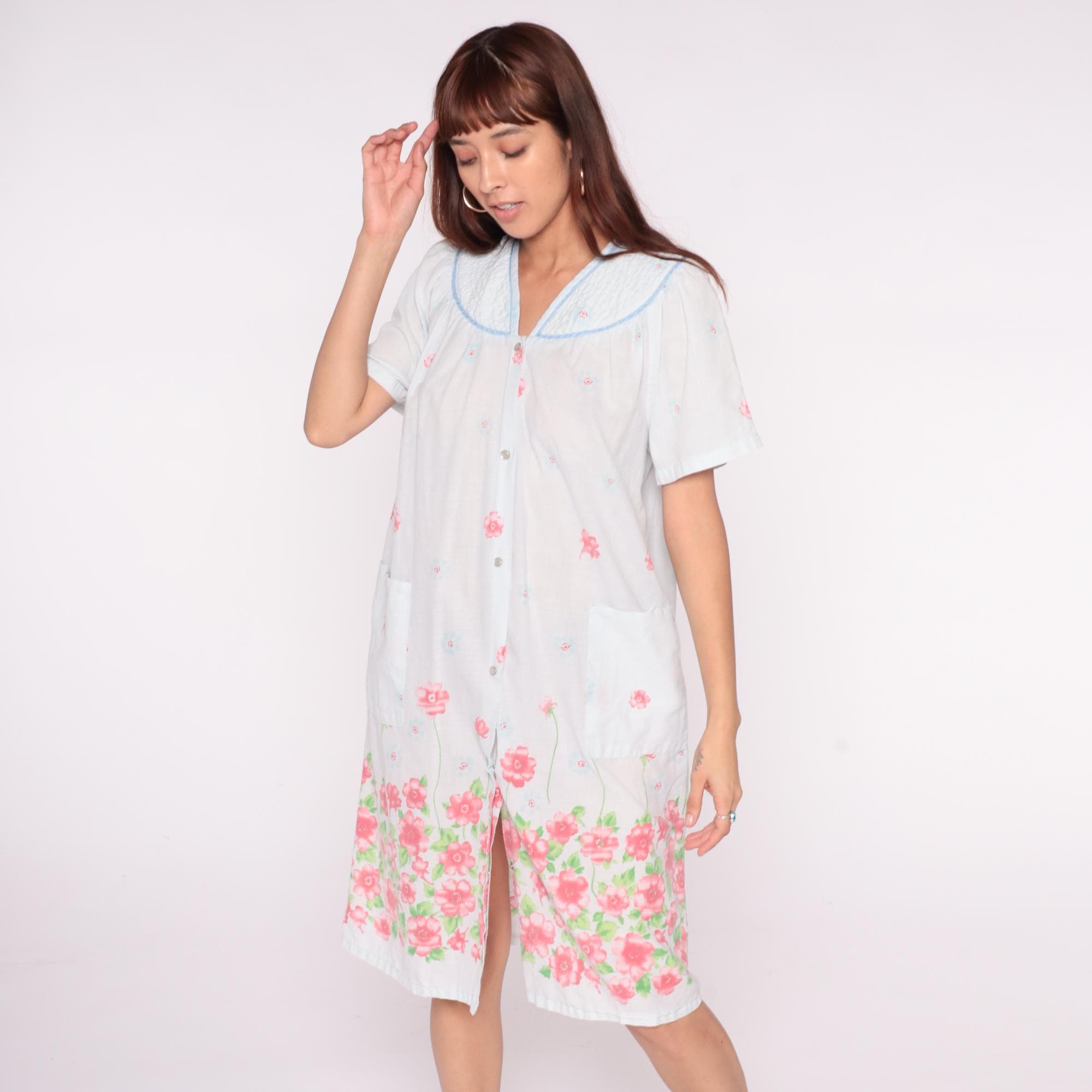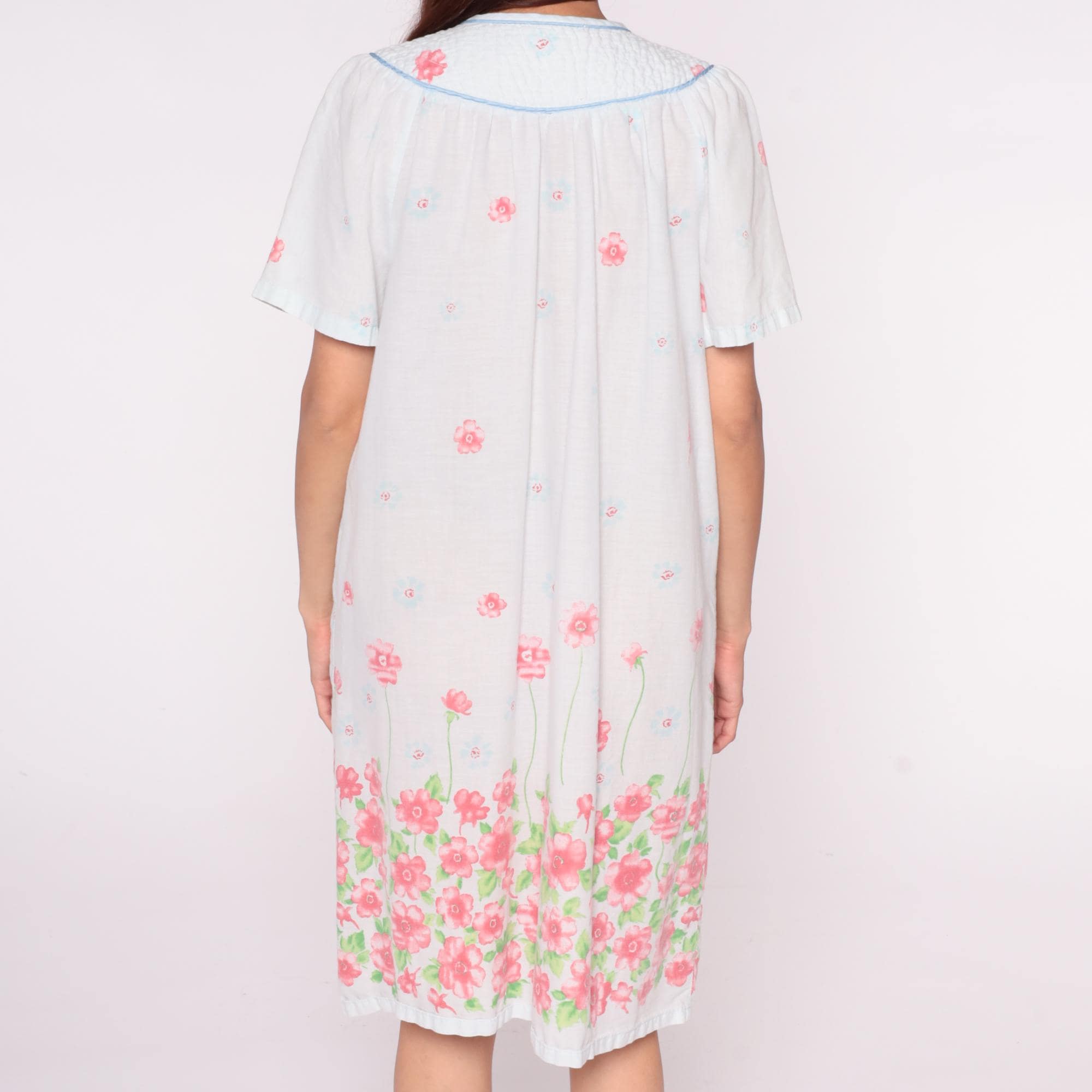 90s white floral nightgown from emily stacy with pink flower border print at hem and scattered blooms across fabric. Smocked yoke detail with blue piping trim on collar and V-neckline, button front closure.