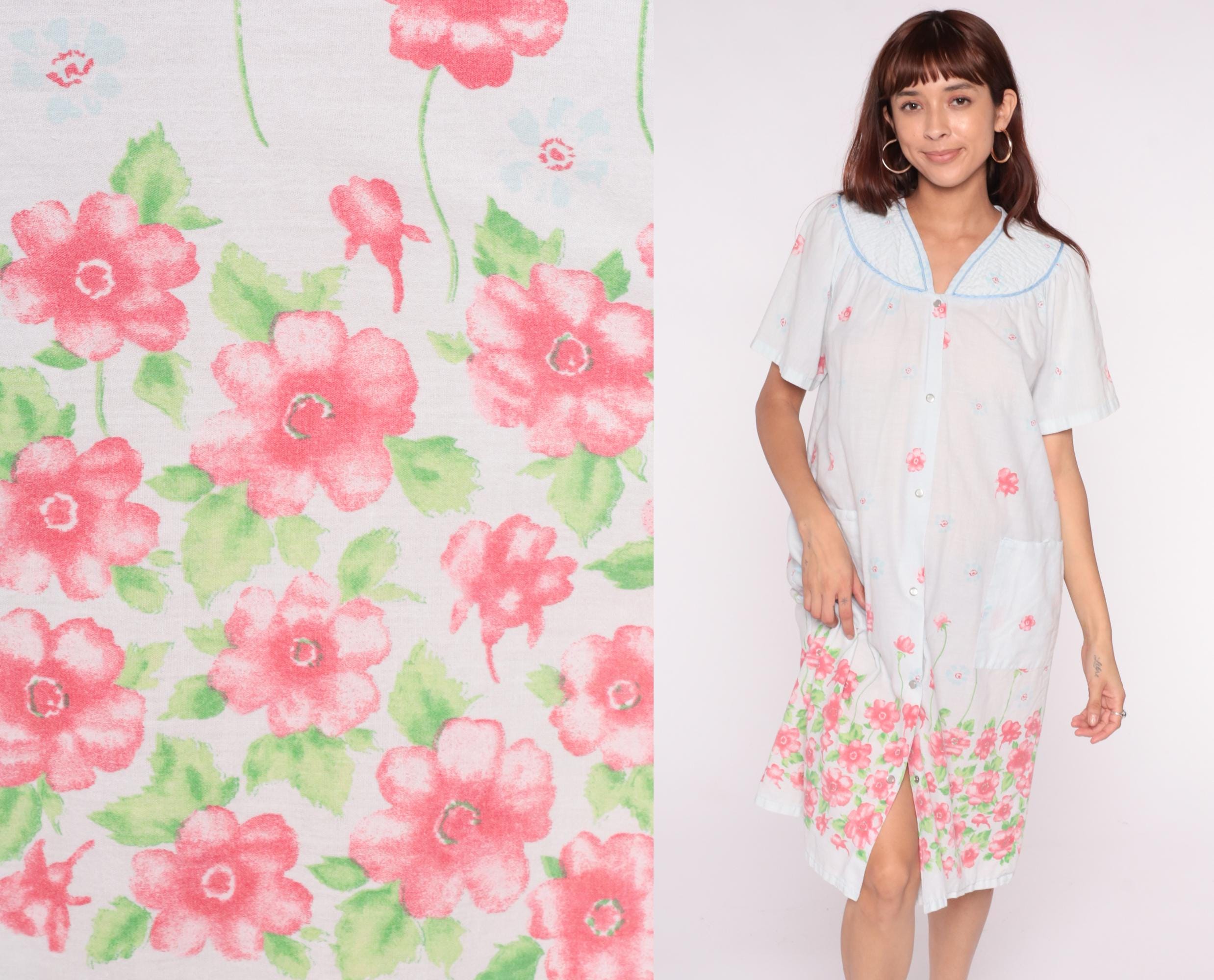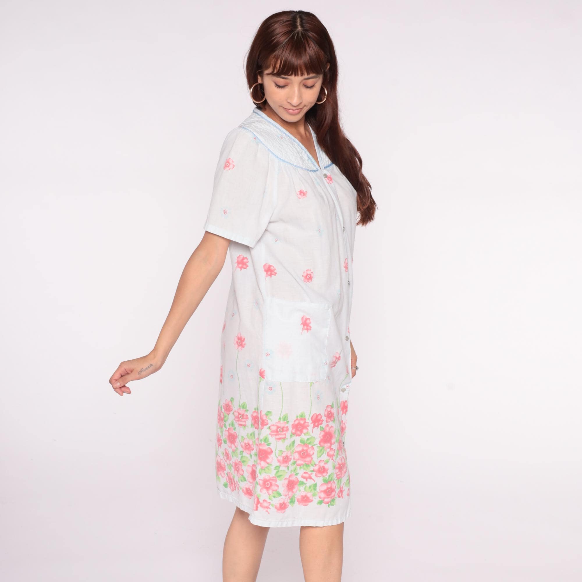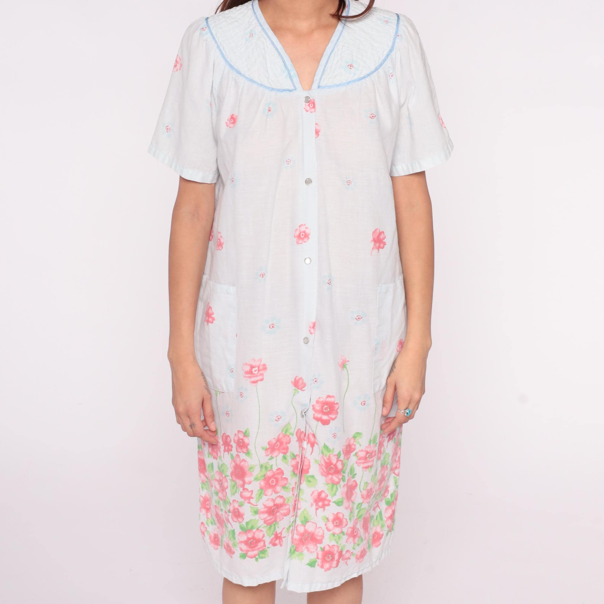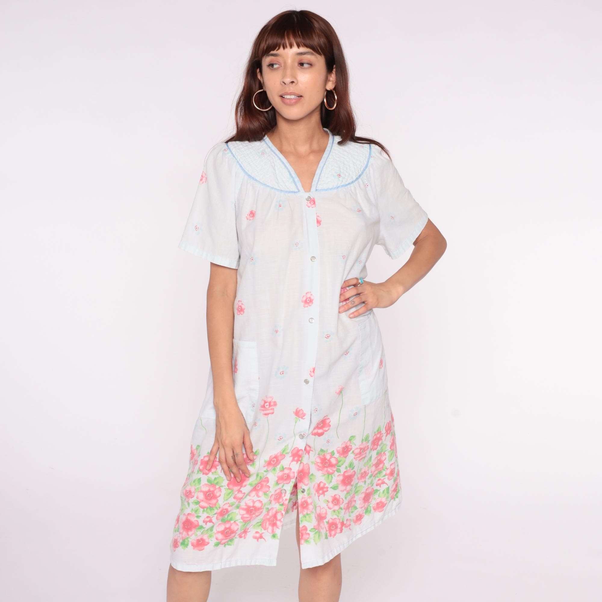 90s white floral nightgown from emily stacy with pink flower border print at hem and scattered blooms across fabric. Smocked yoke detail with blue piping trim on collar and V-neckline, button front closure.