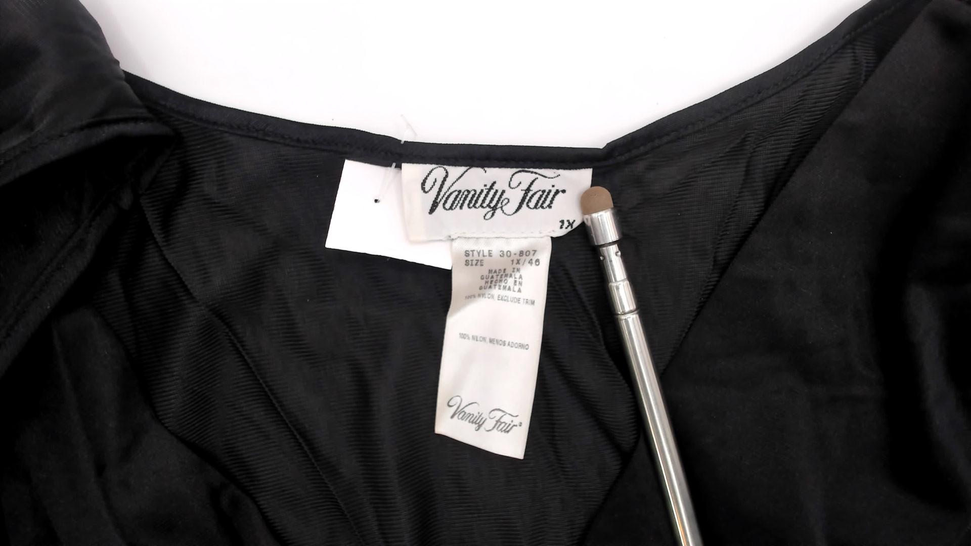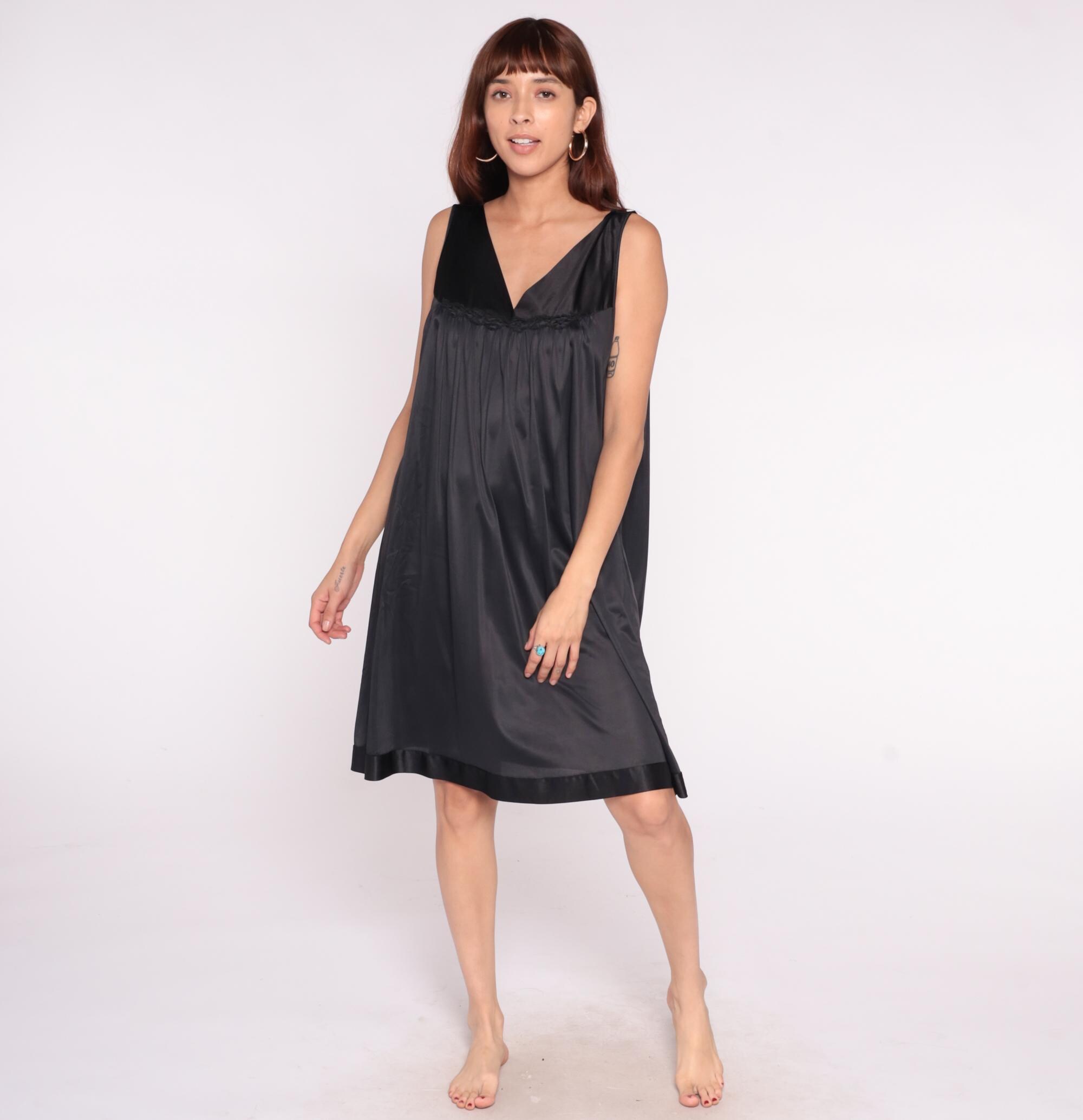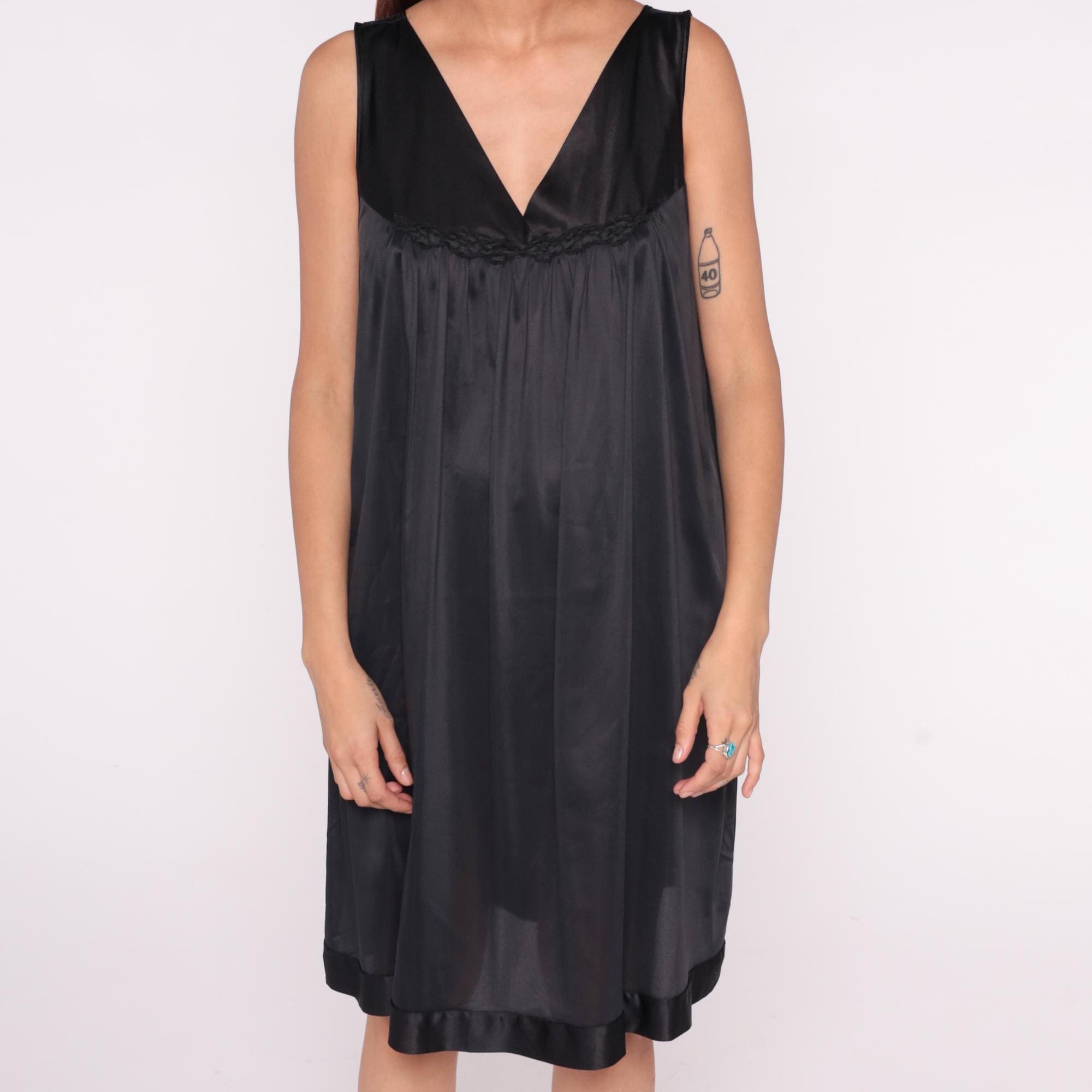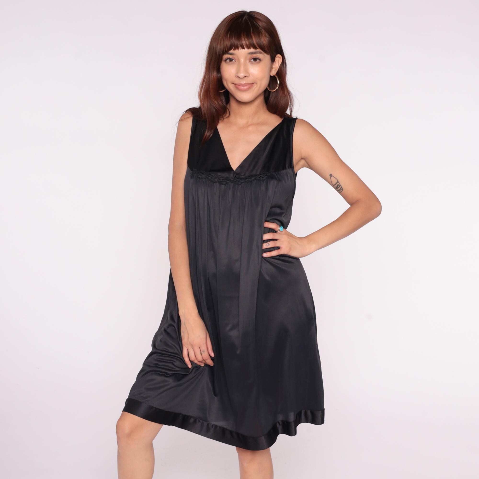 90s black slip dress from Vanity Fair with deep V-neckline and thin shoulder straps. Empire waist with braided trim detail under the bust, straight silhouette below.
