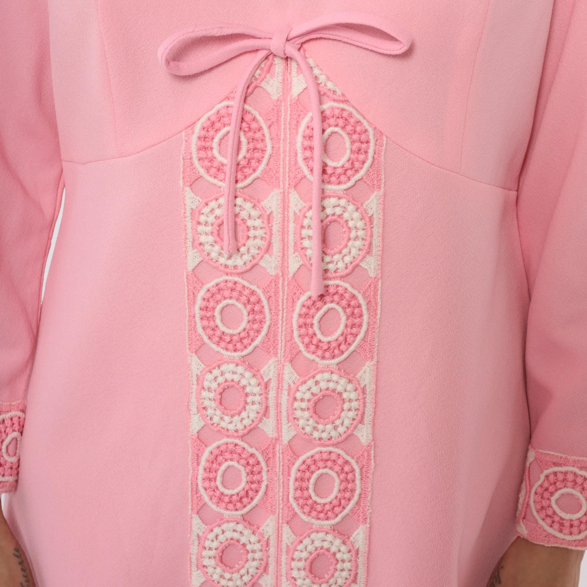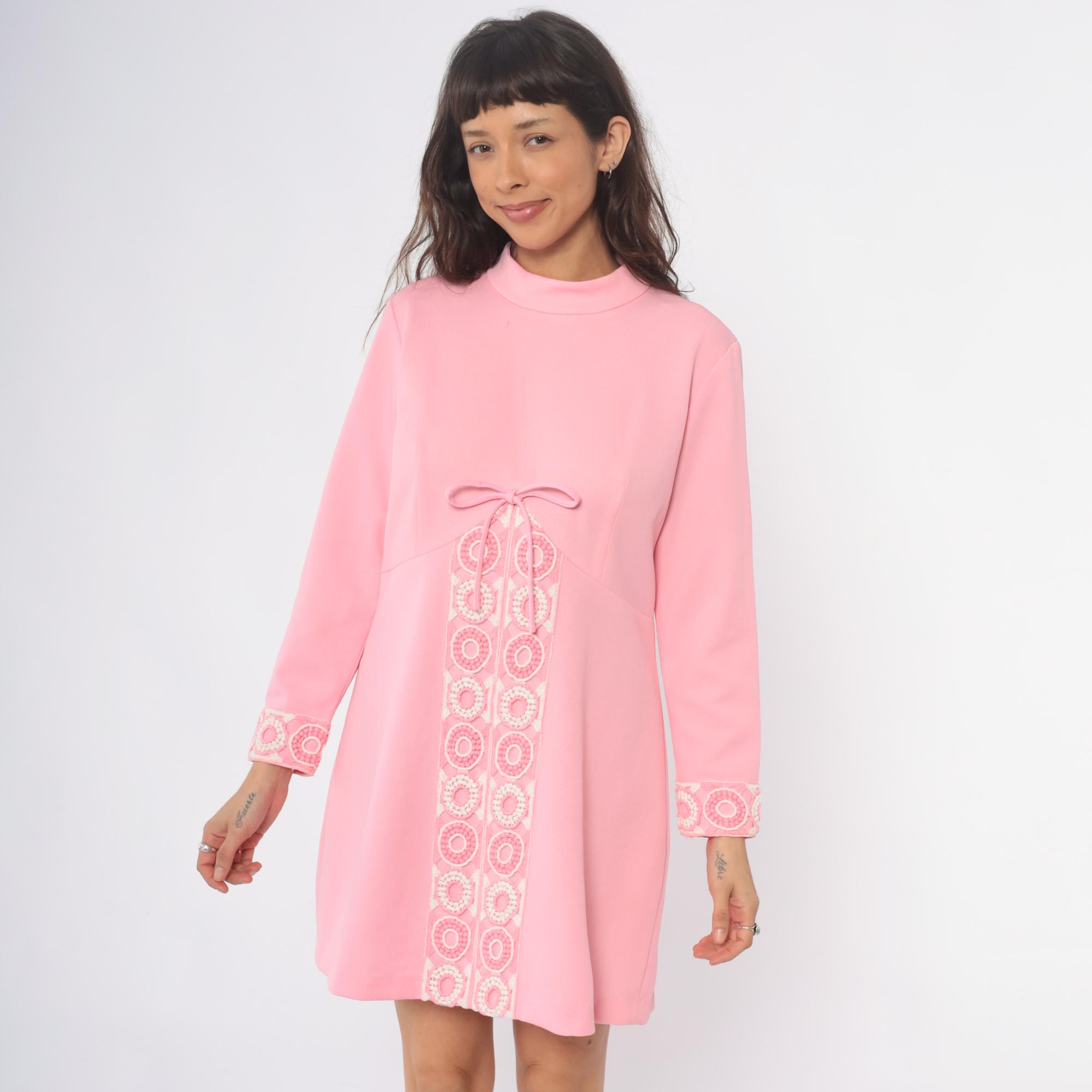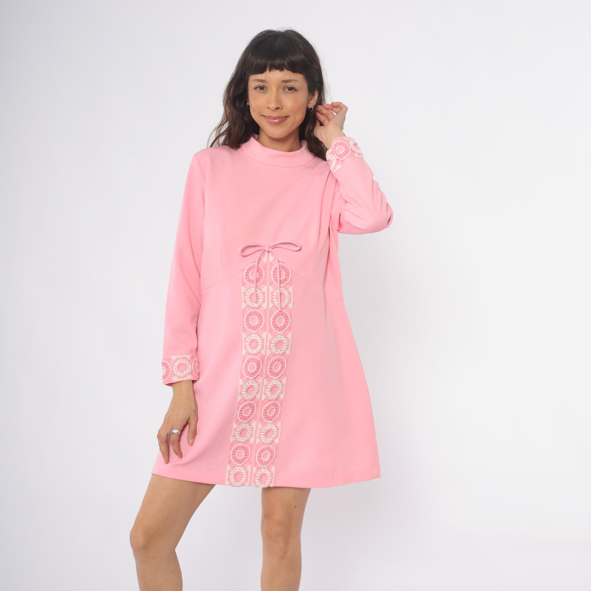 70s pink mini dress with mock neck and long sleeves. White circular embroidered medallions down the center front panel with matching embroidered trim at the cuffs, decorative bow detail at the center front waist. Shift dress silhouette with back zipper closure.