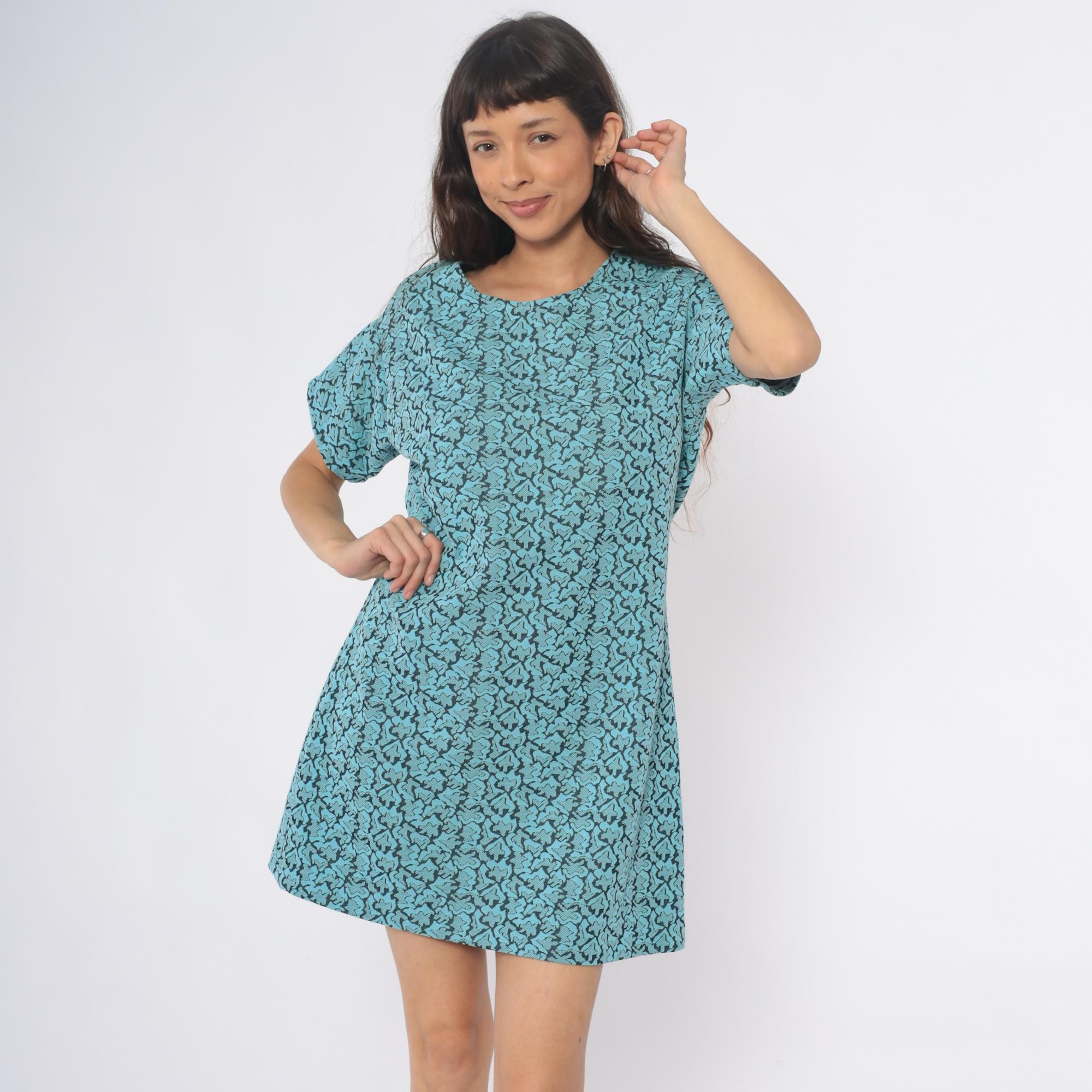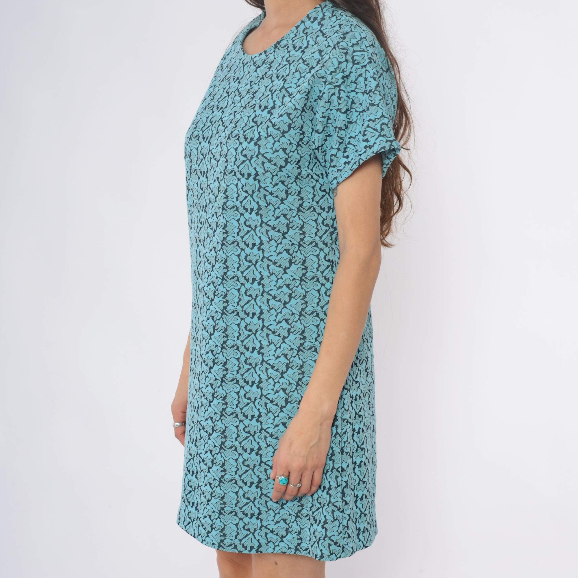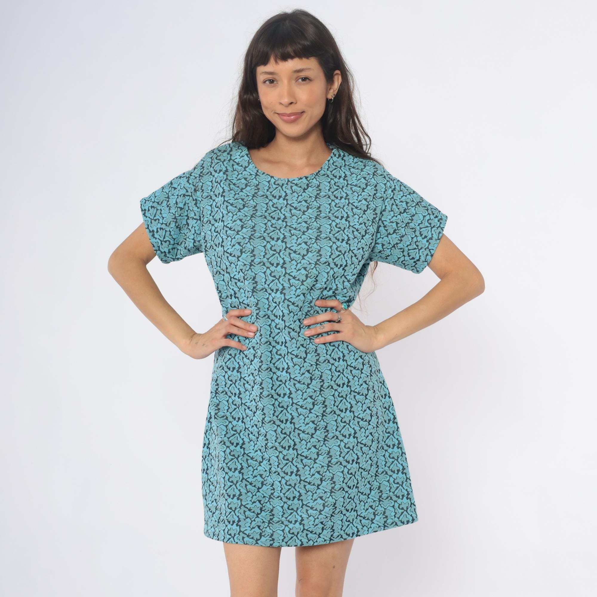 60s turquoise shift dress with black abstract swirl pattern throughout. Scoop neckline, short sleeves, straight silhouette.