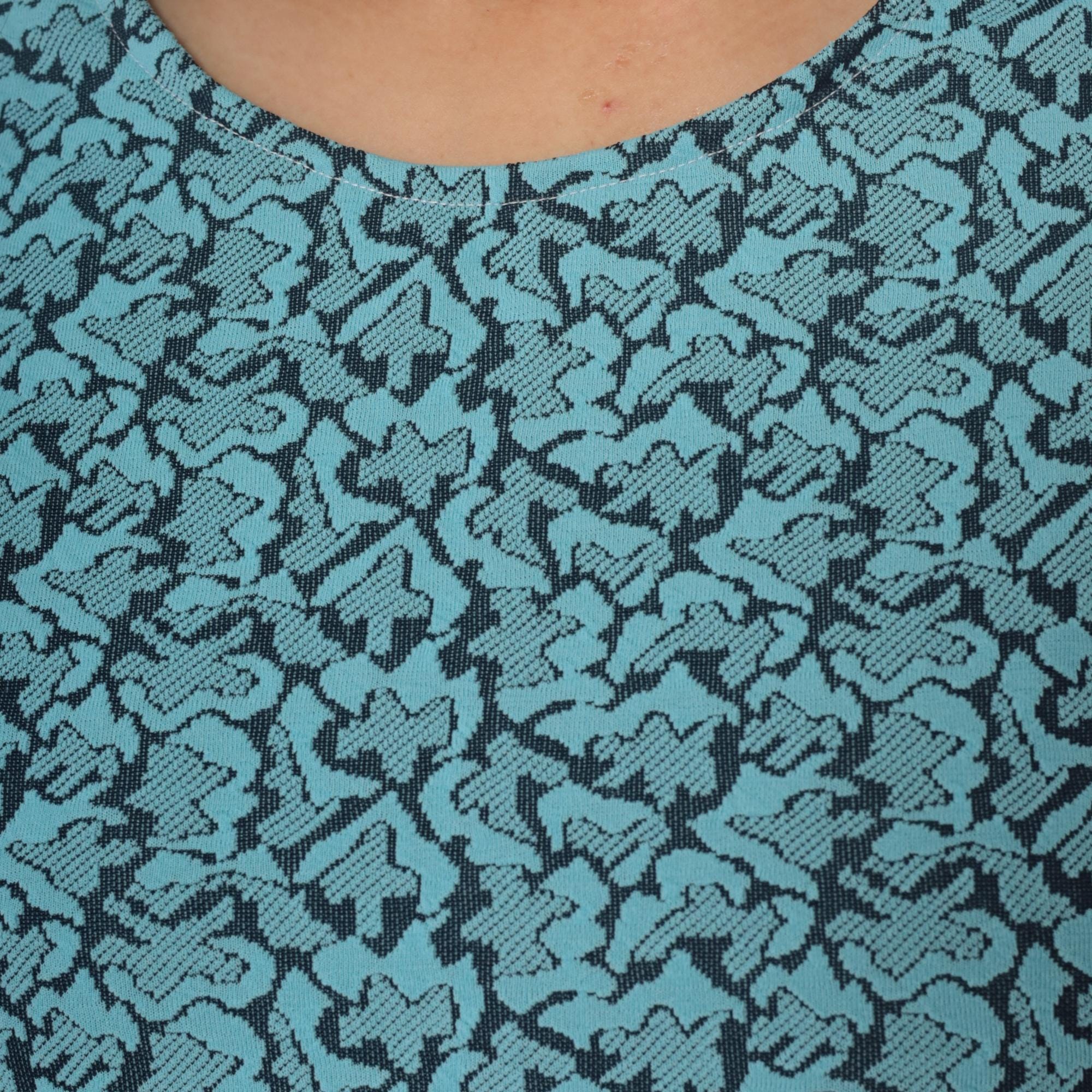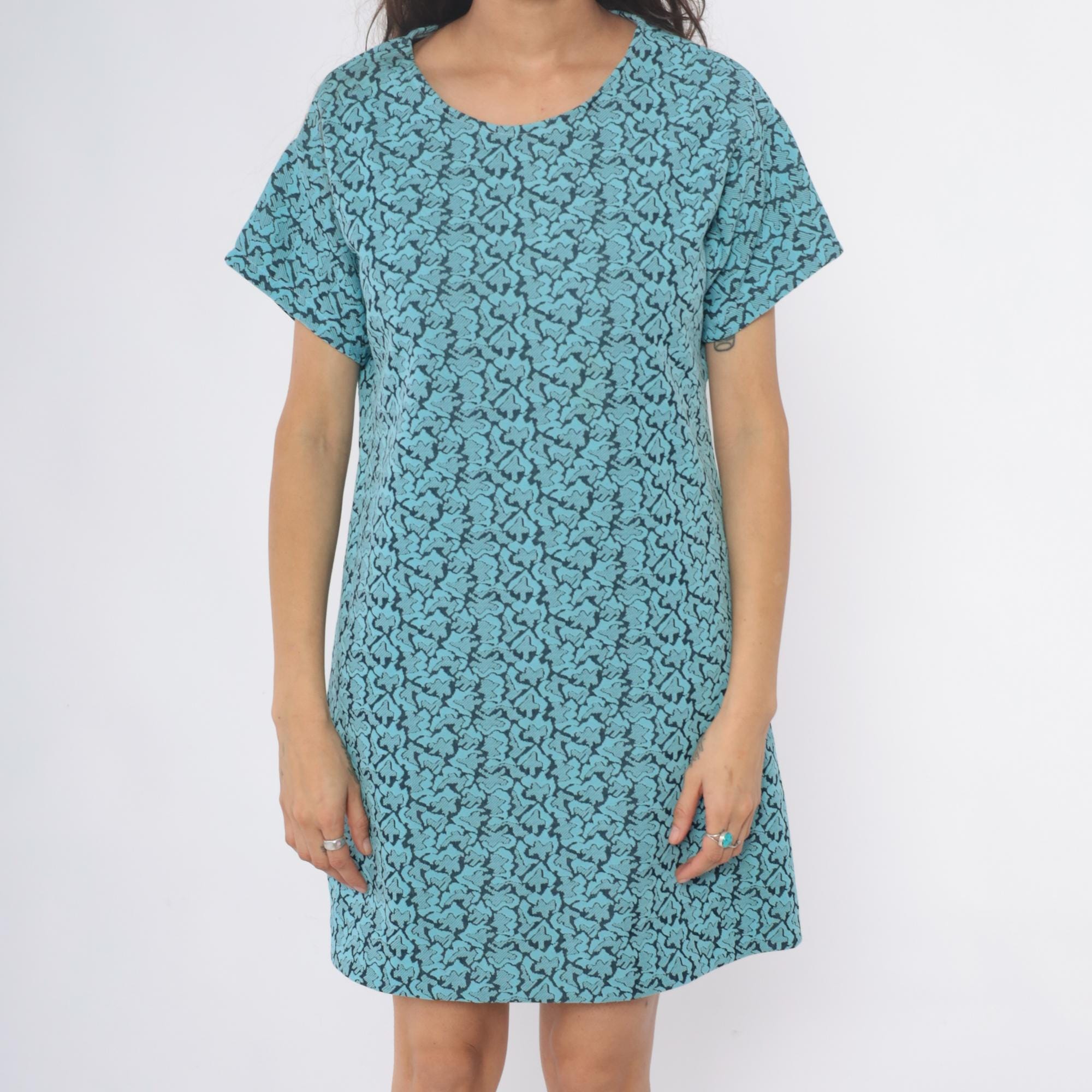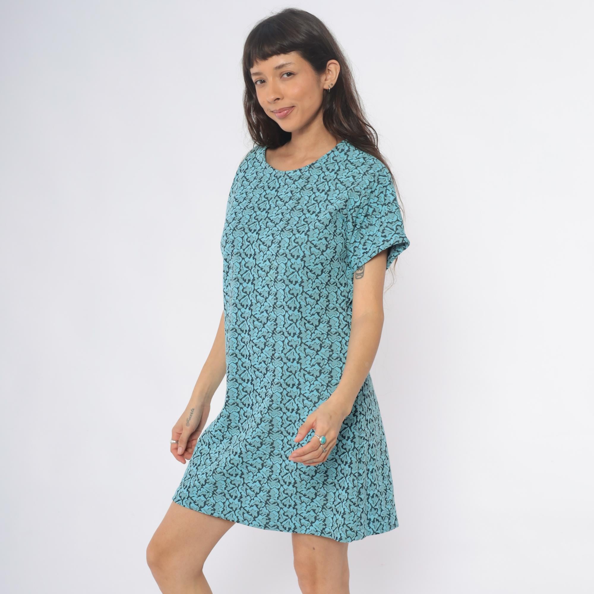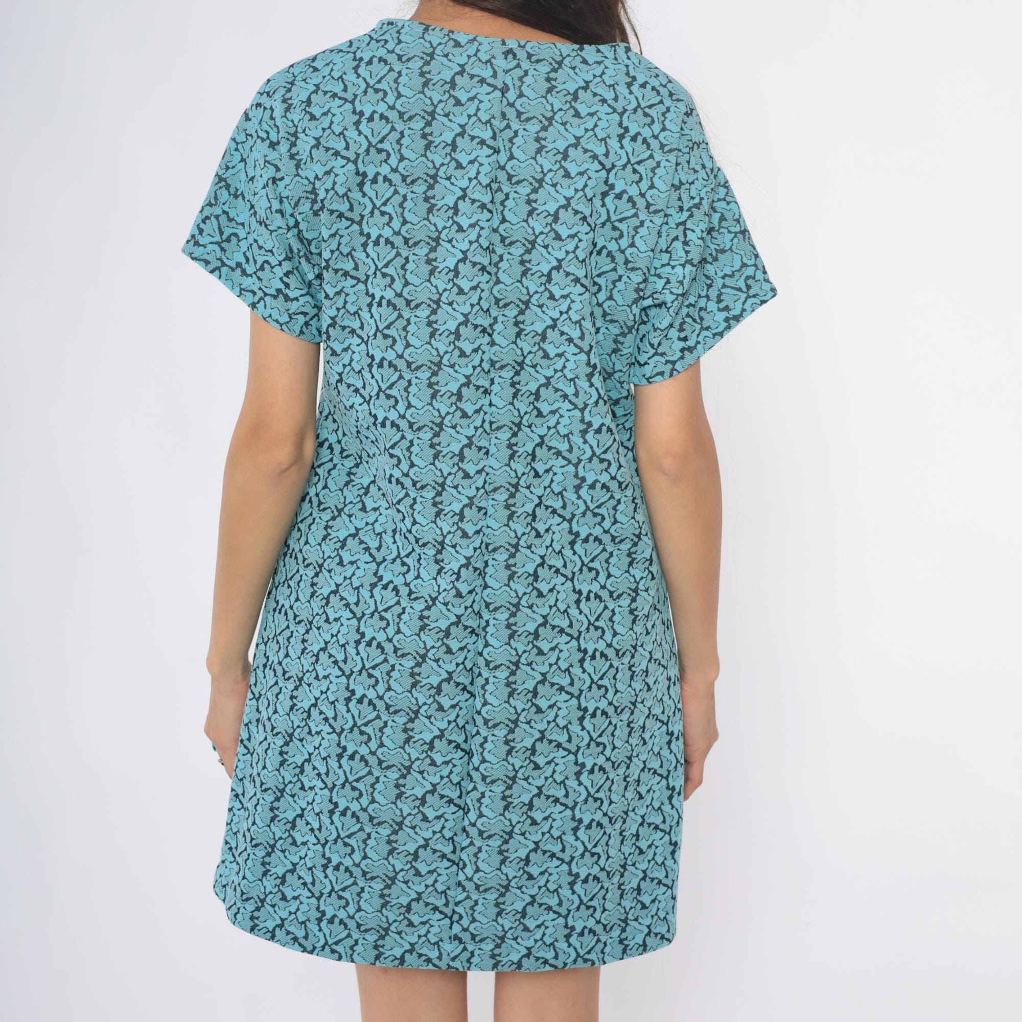 60s turquoise shift dress with black abstract swirl pattern throughout. Scoop neckline, short sleeves, straight silhouette.