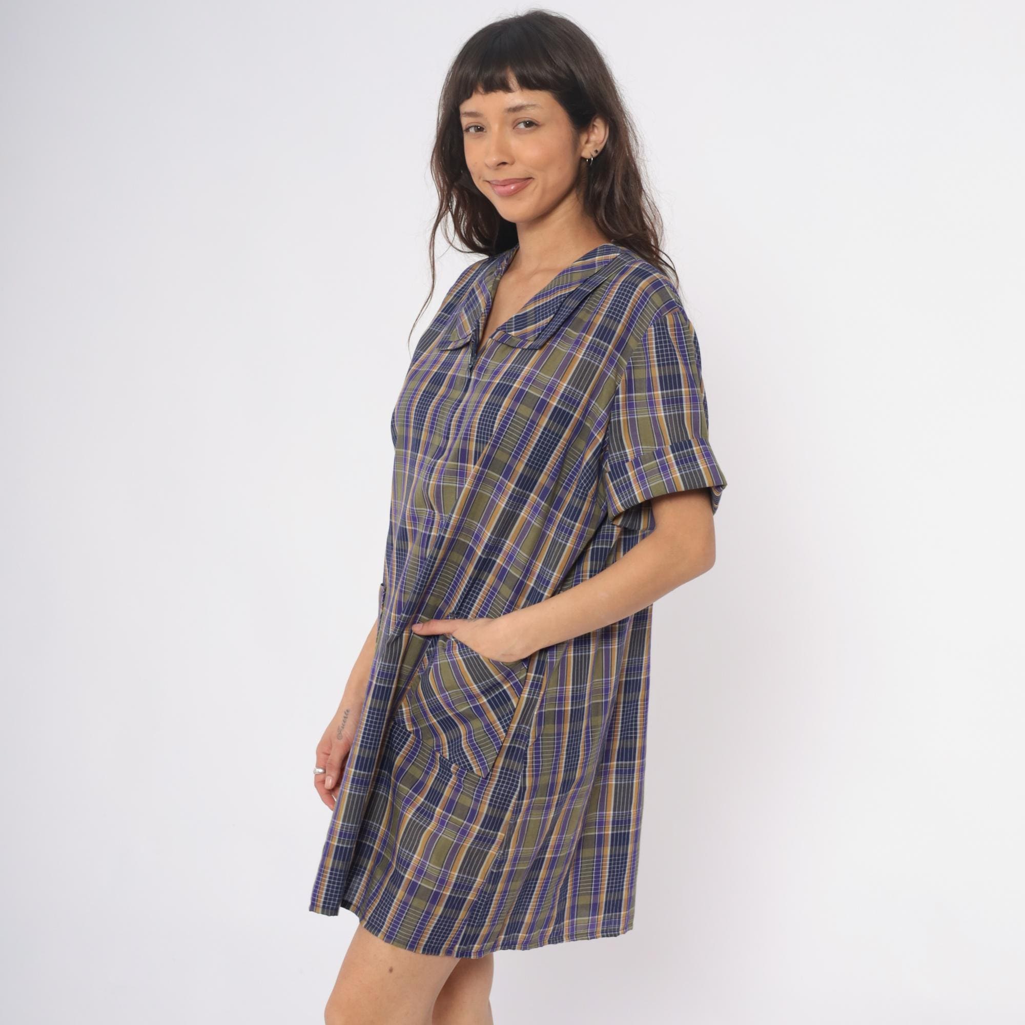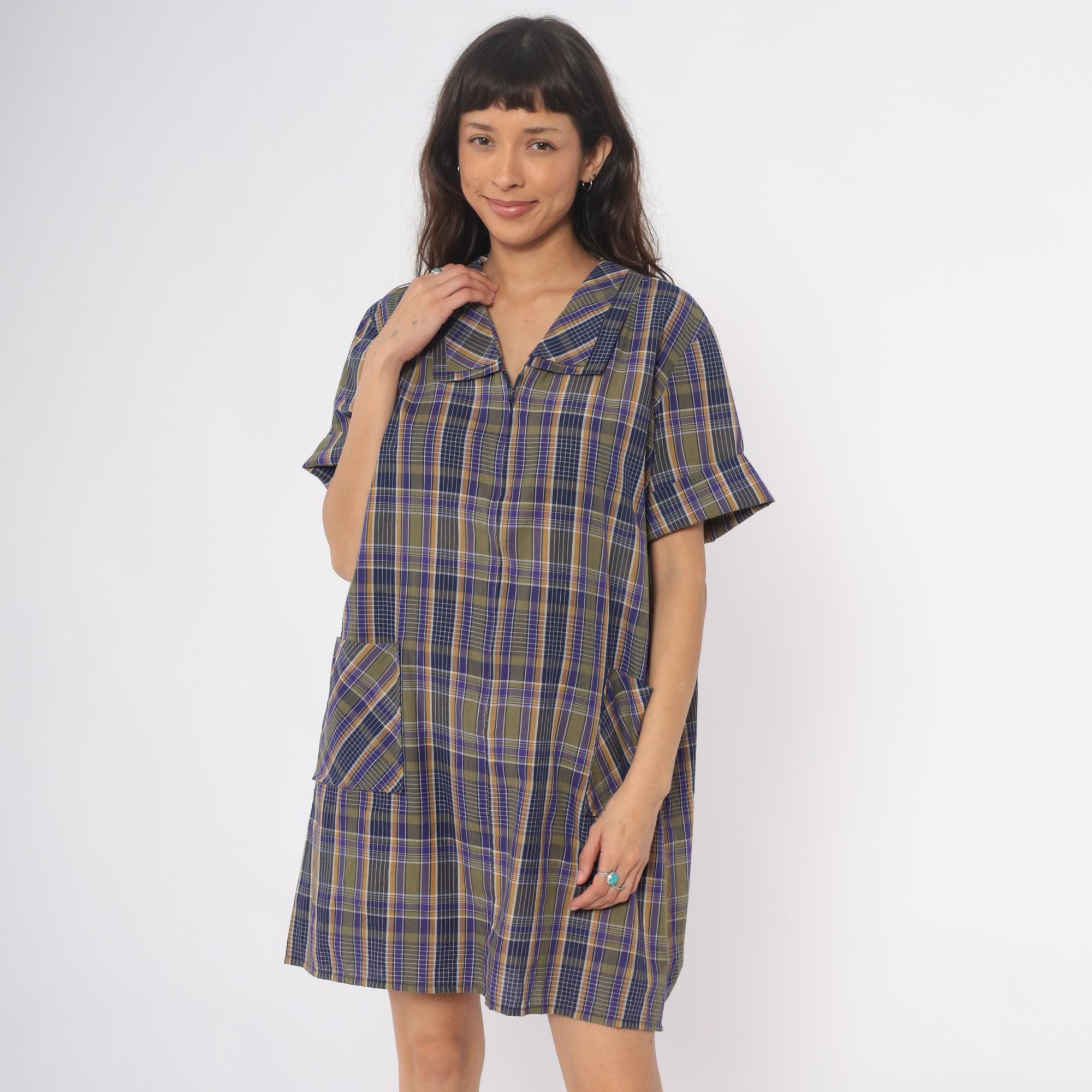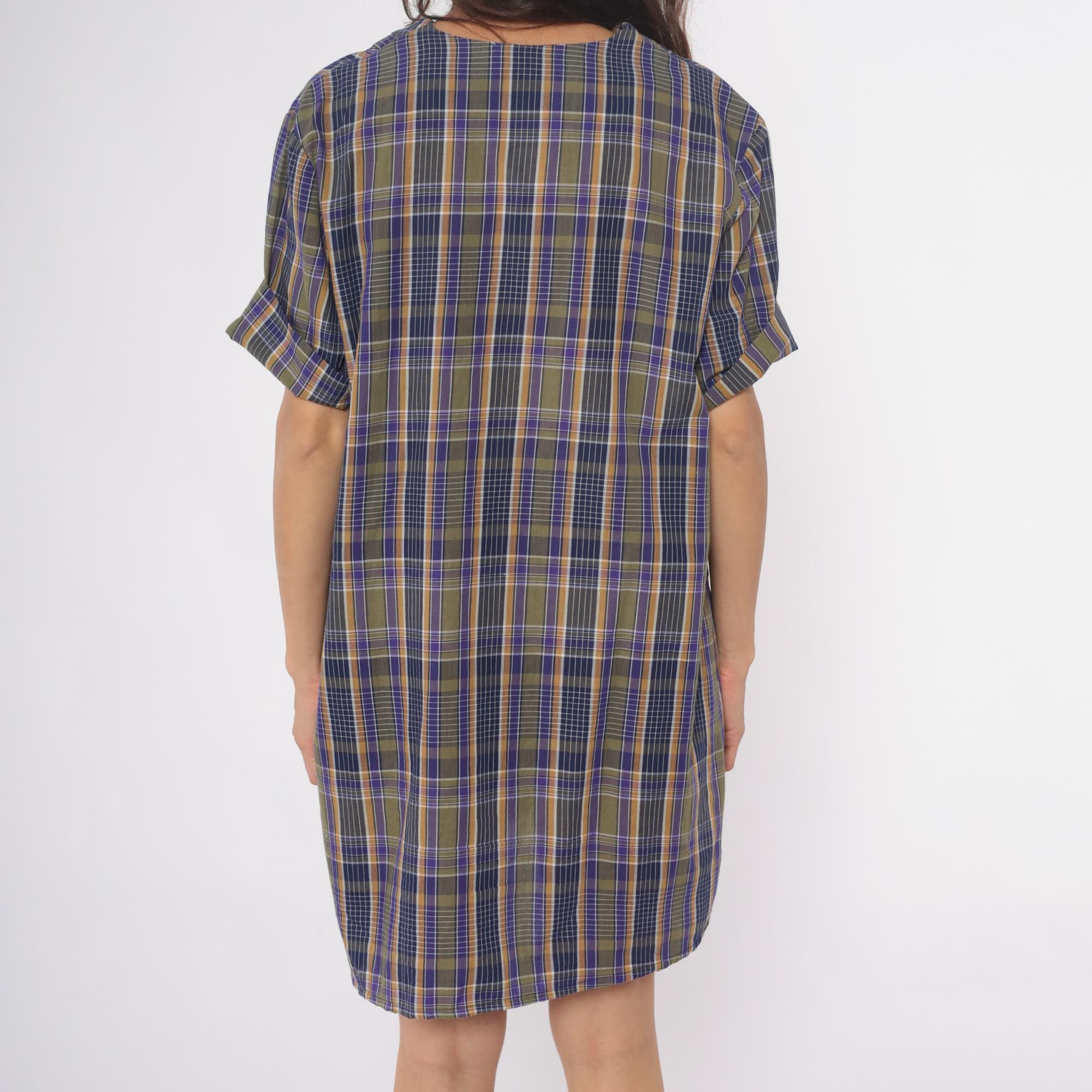 80s plaid shift dress from zip n dash in navy, olive, purple, and tan plaid pattern with notched collar and short rolled sleeves. Two diagonal front patch pockets, loose straight silhouette, above-knee length. Cotton and polyester blend.