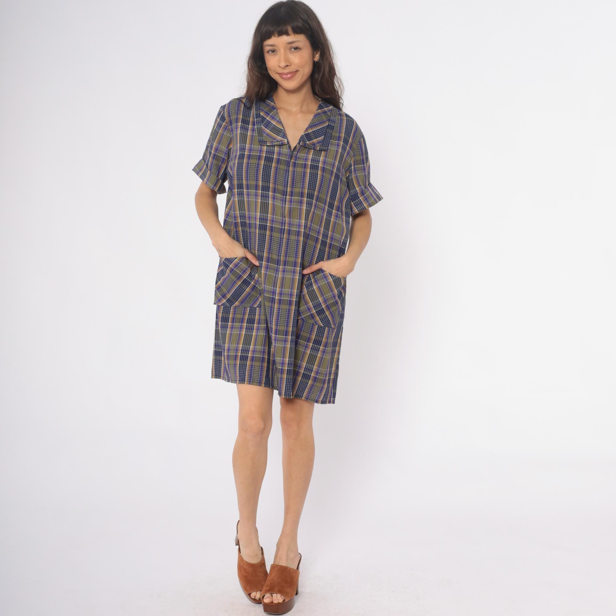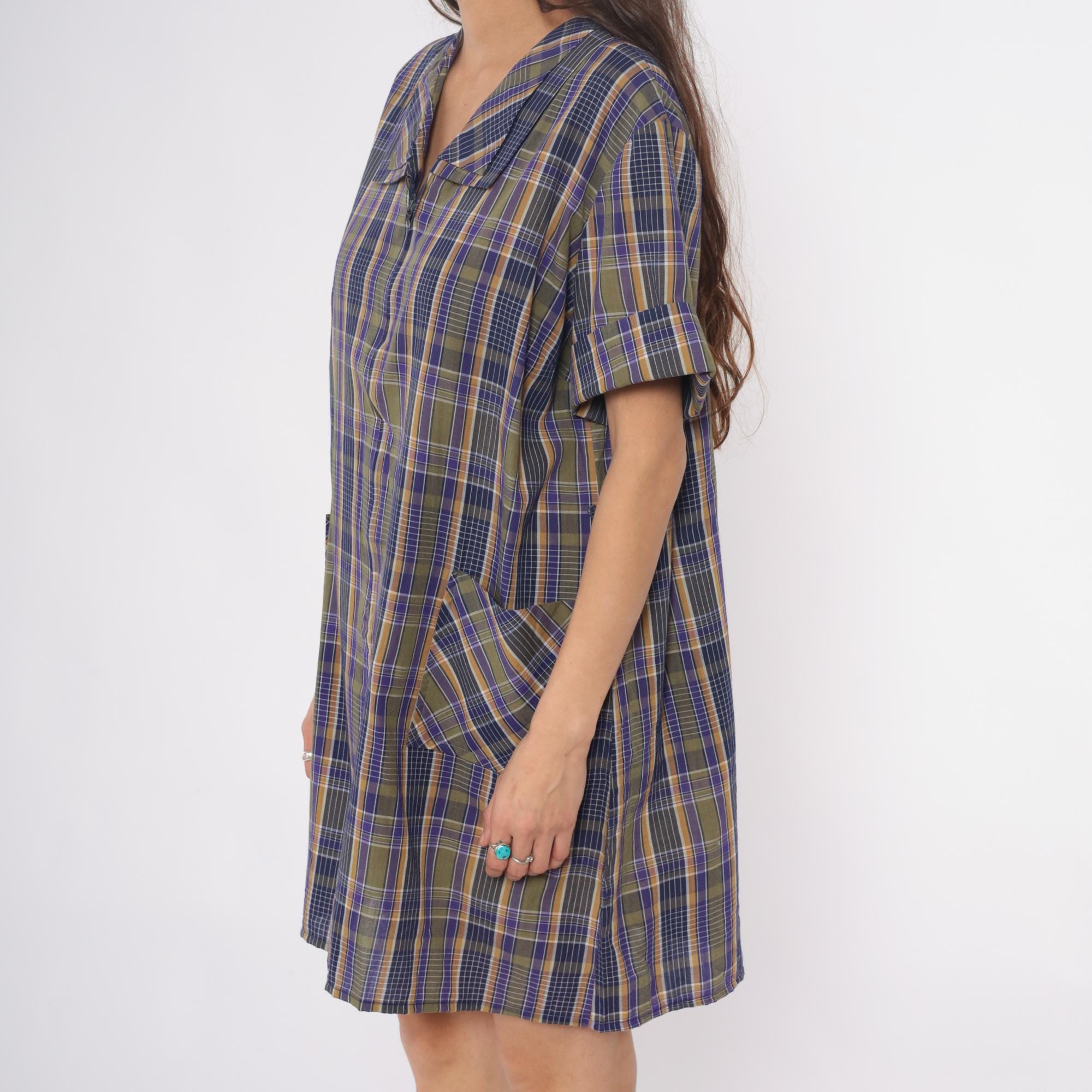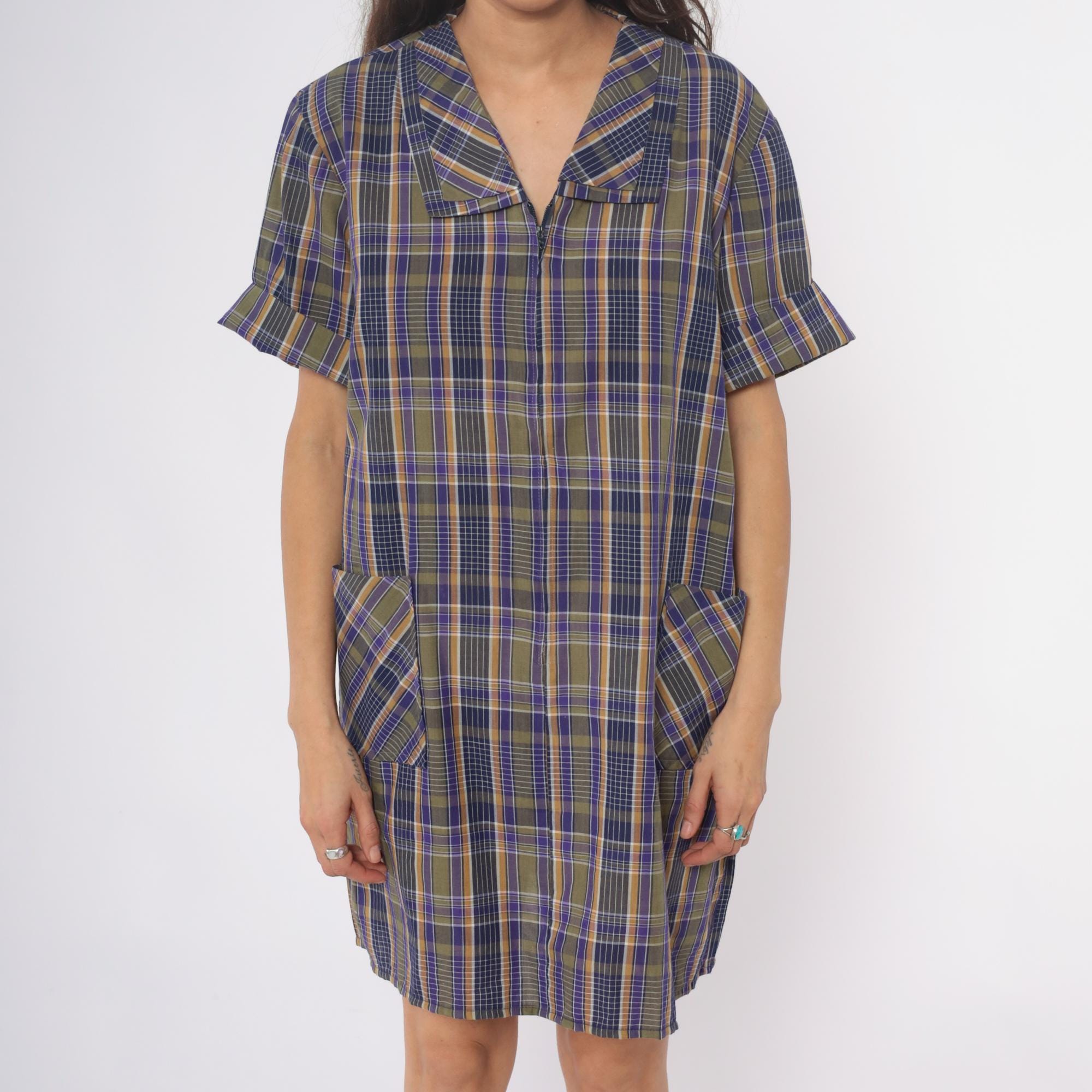 80s plaid shift dress from zip n dash in navy, olive, purple, and tan plaid pattern with notched collar and short rolled sleeves. Two diagonal front patch pockets, loose straight silhouette, above-knee length. Cotton and polyester blend.