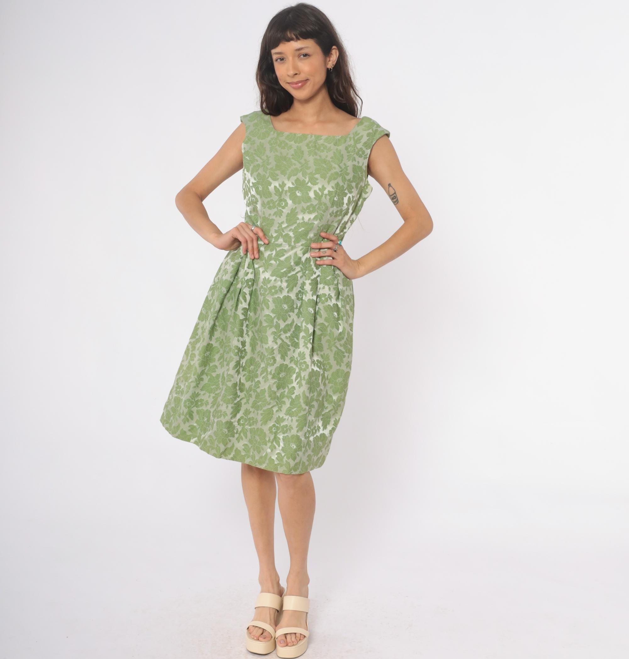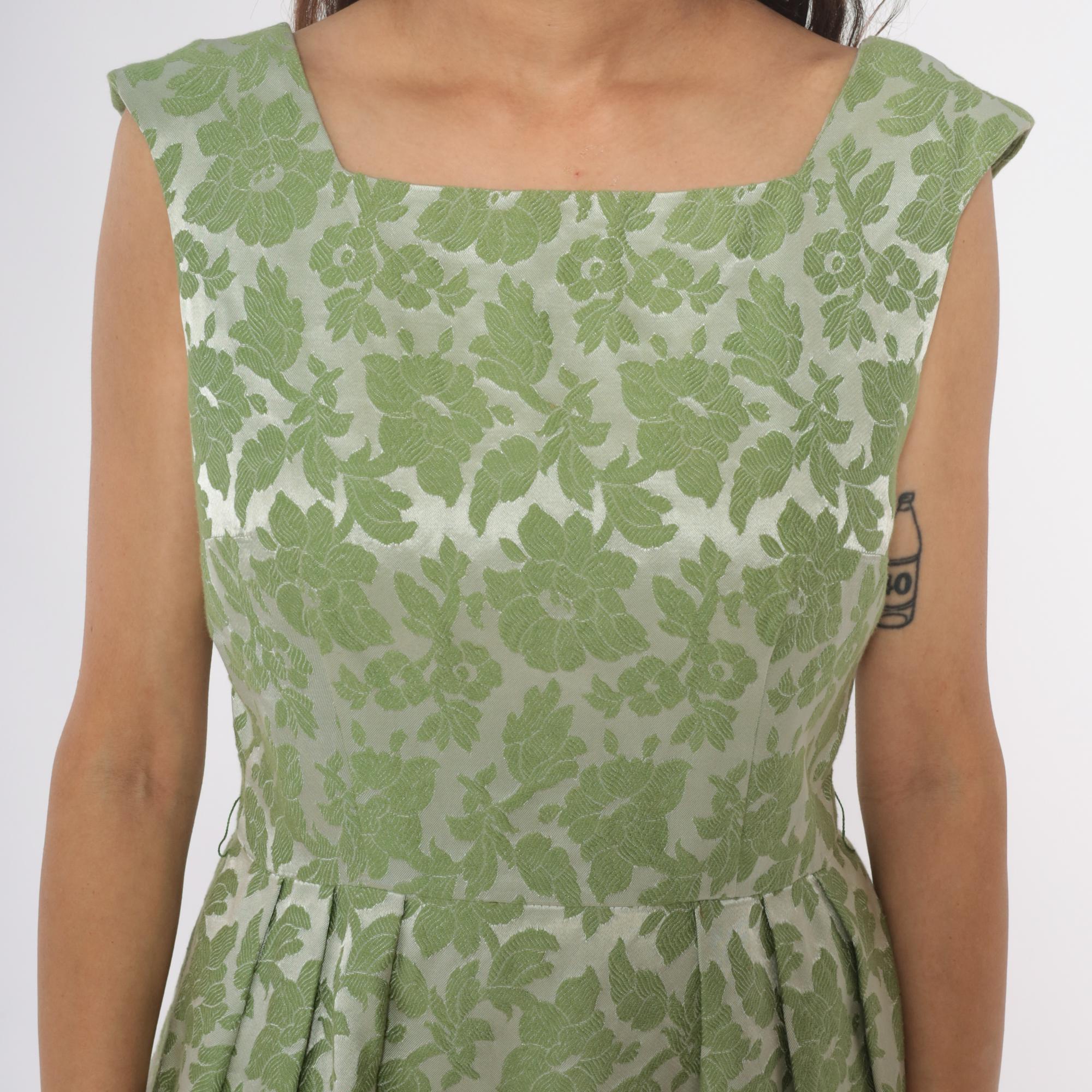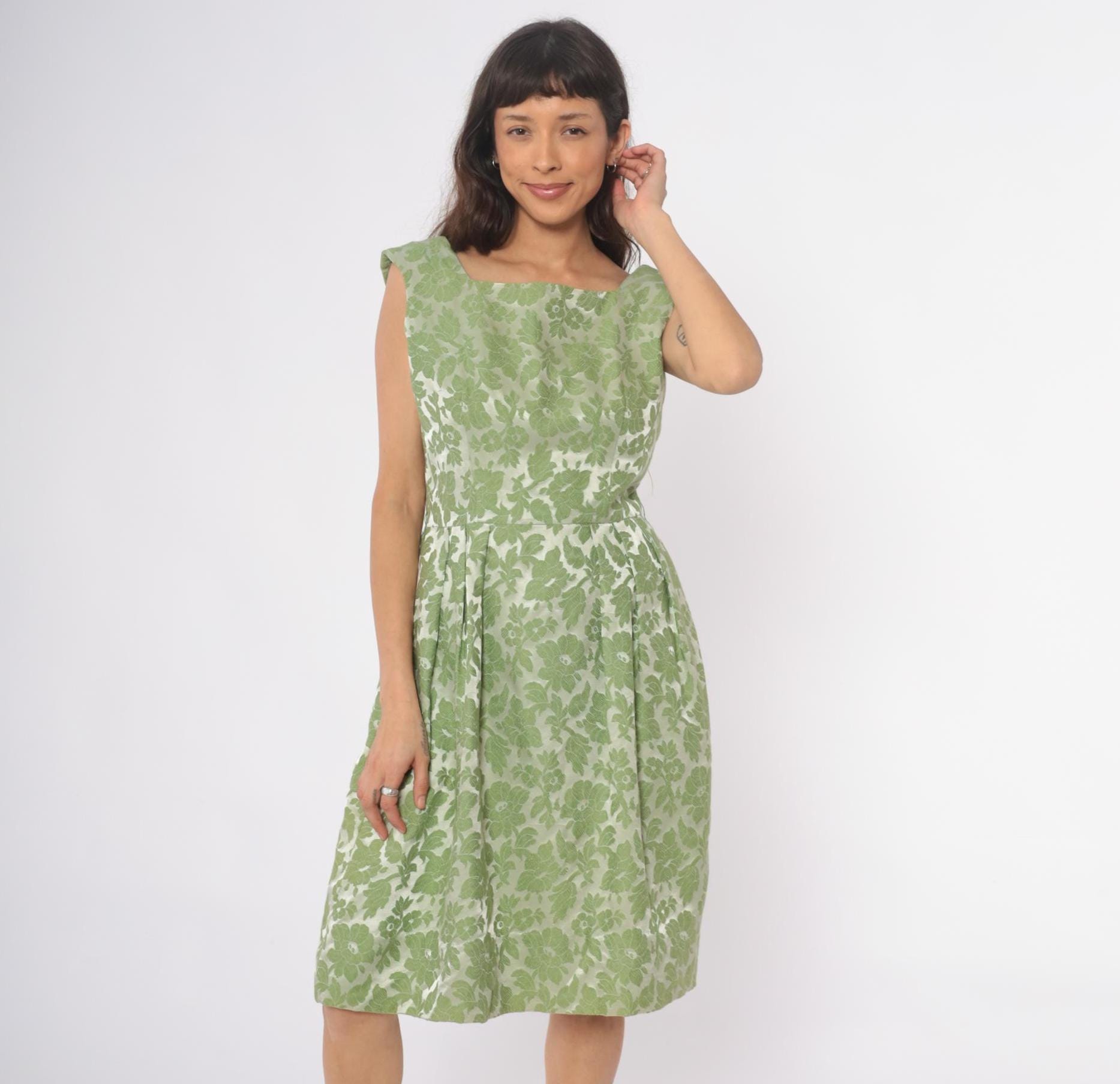 60s green floral dress from adrian fabin with square neckline and cap sleeves. Fitted bodice with back zipper closure, pleated skirt. Green leaf and flower pattern.