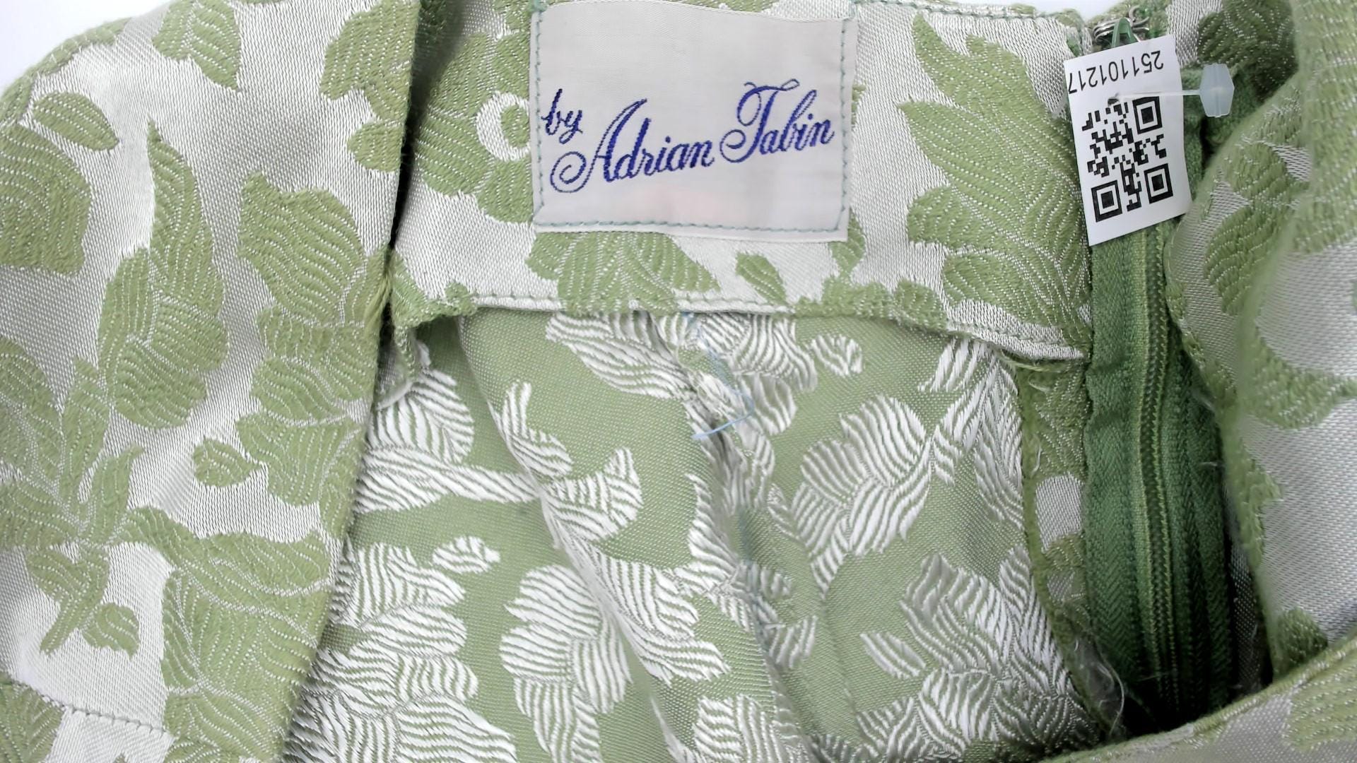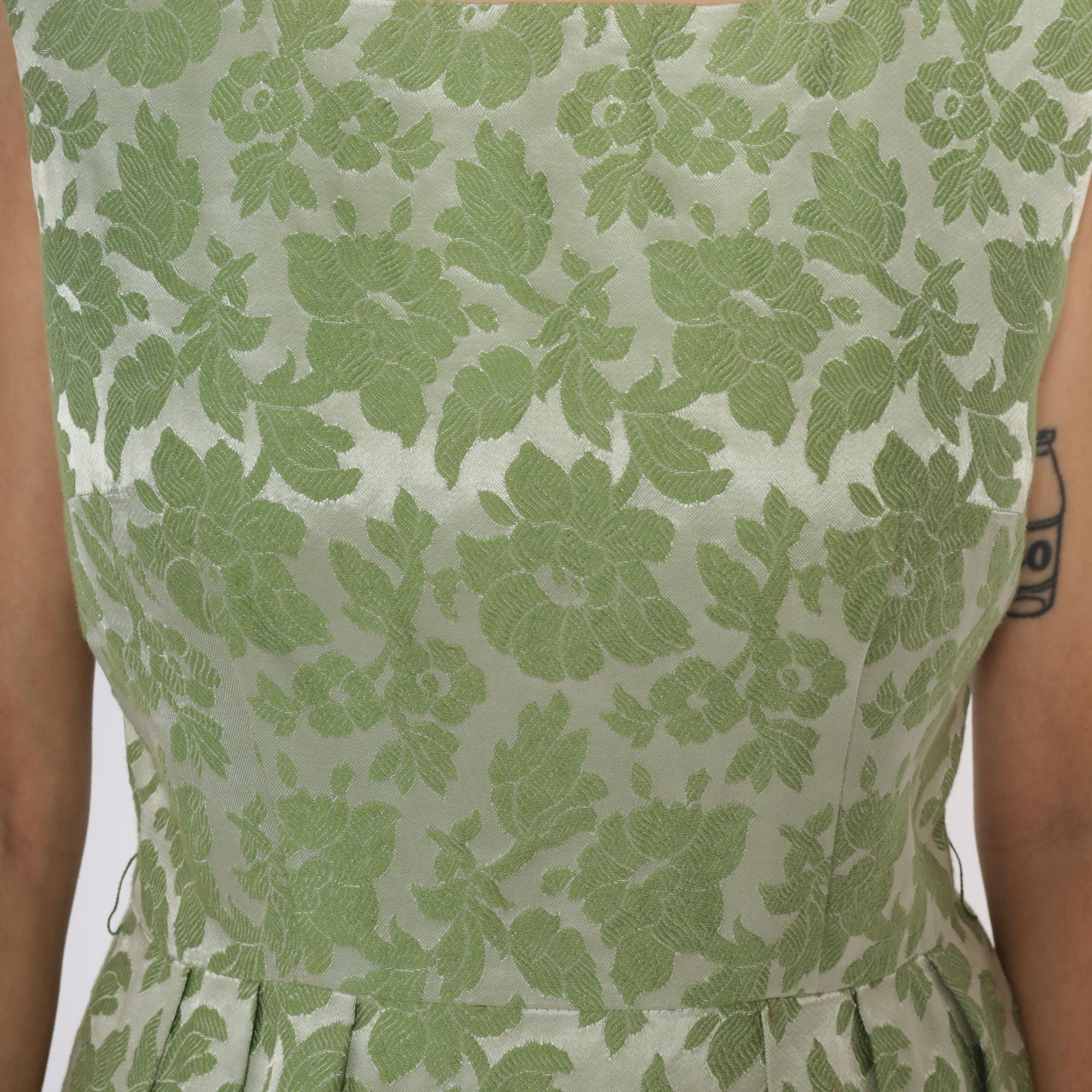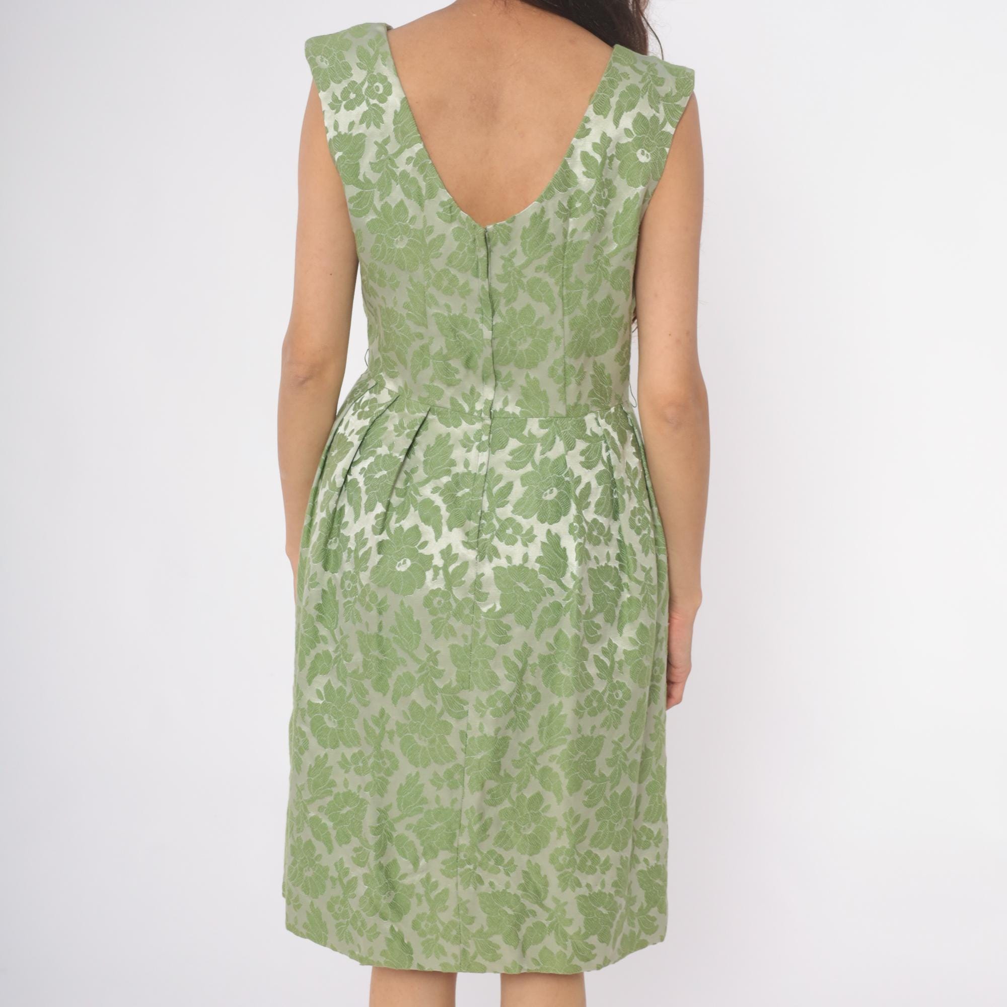60s green floral dress from adrian fabin with square neckline and cap sleeves. Fitted bodice with back zipper closure, pleated skirt. Green leaf and flower pattern.