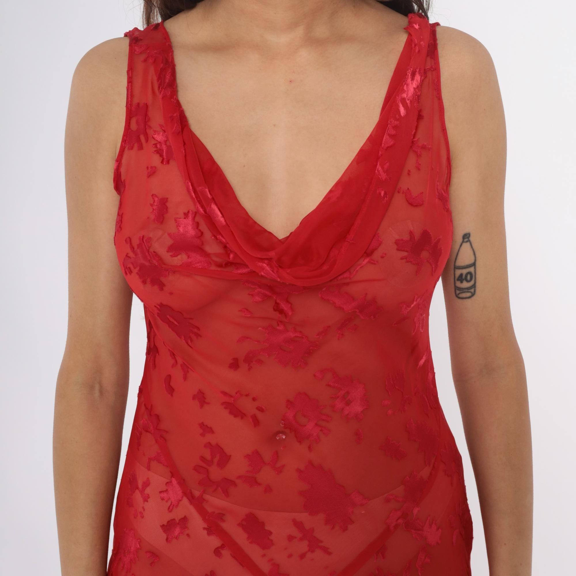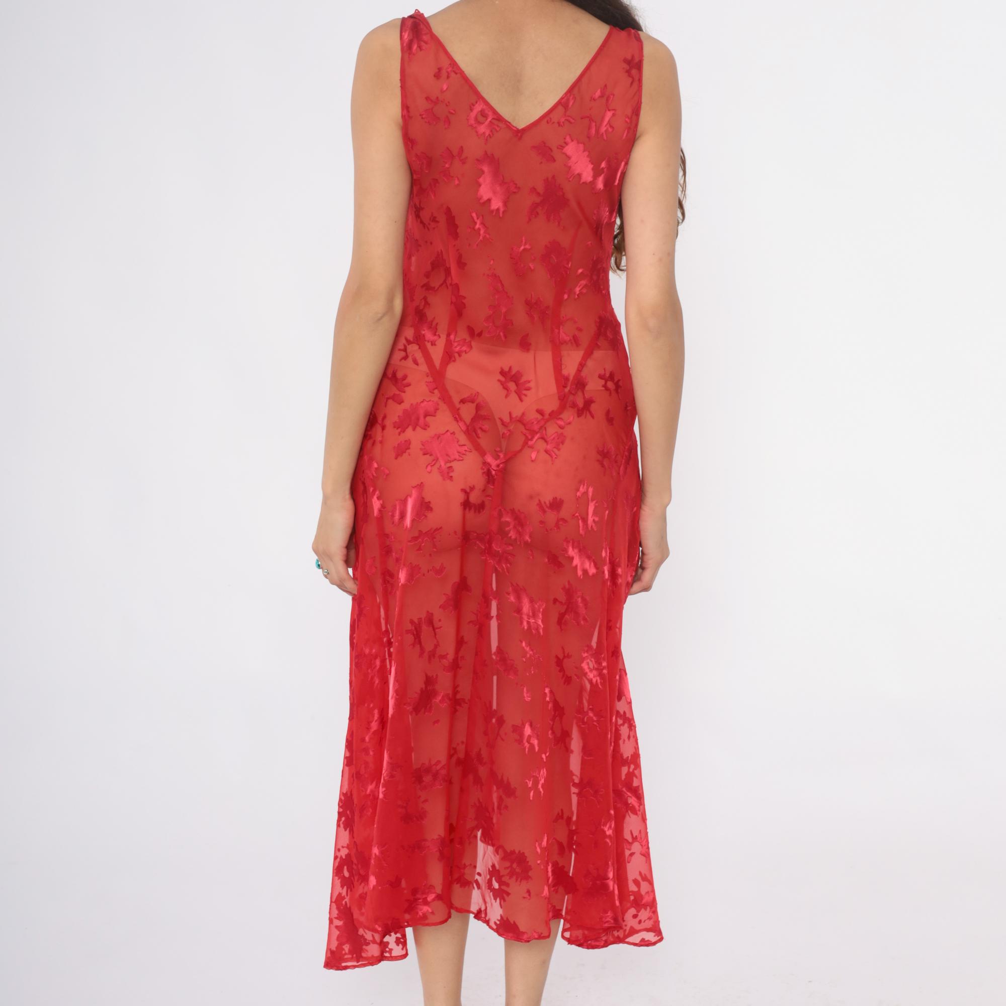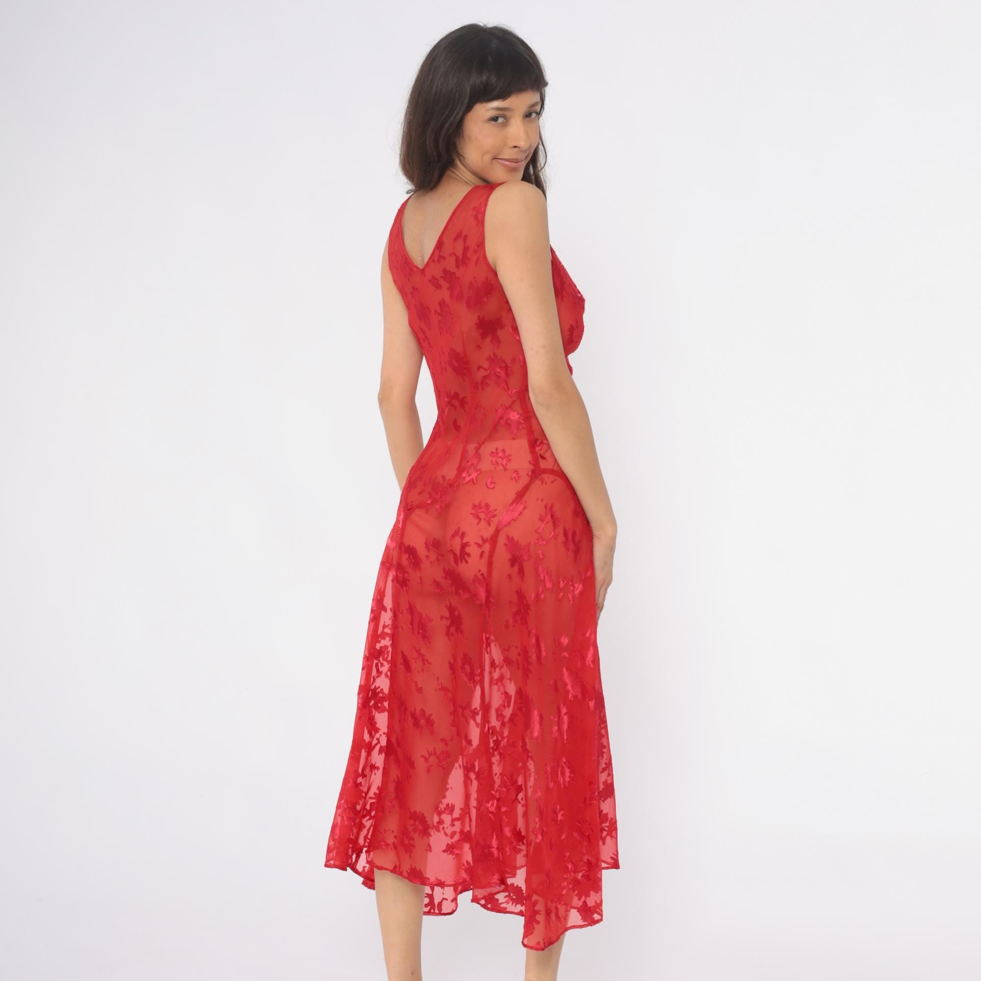 90s red midi dress with burn-out floral pattern across sheer overlay fabric. Sleeveless with V-neckline in front and back, asymmetric handkerchief hemline. Slip dress silhouette with fitted bodice.