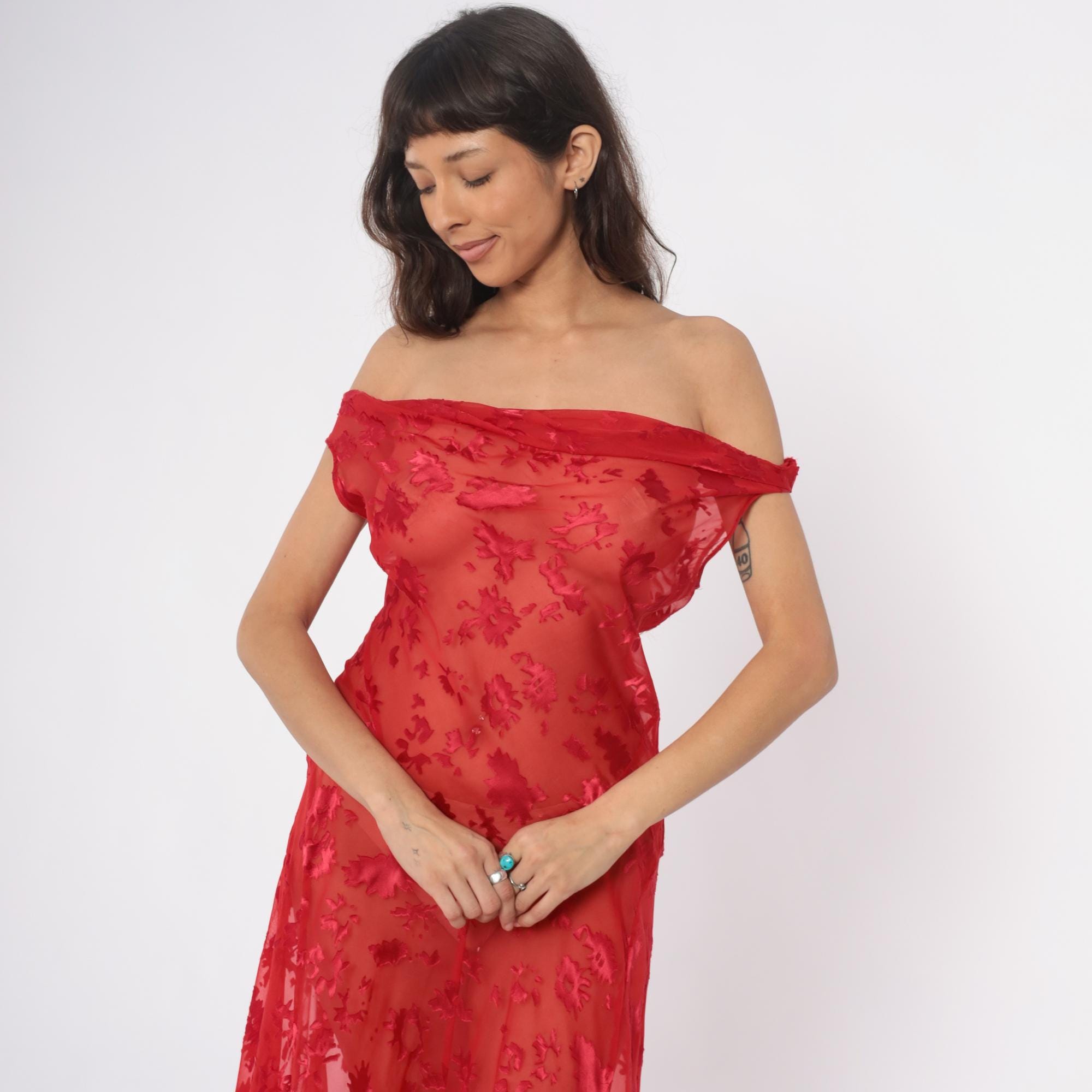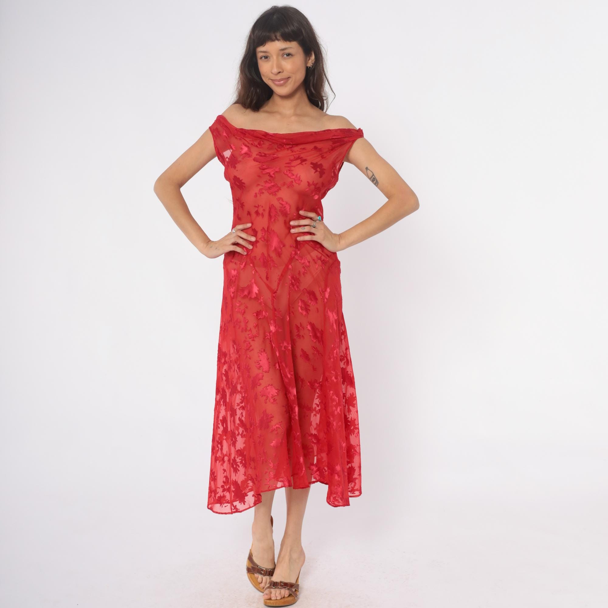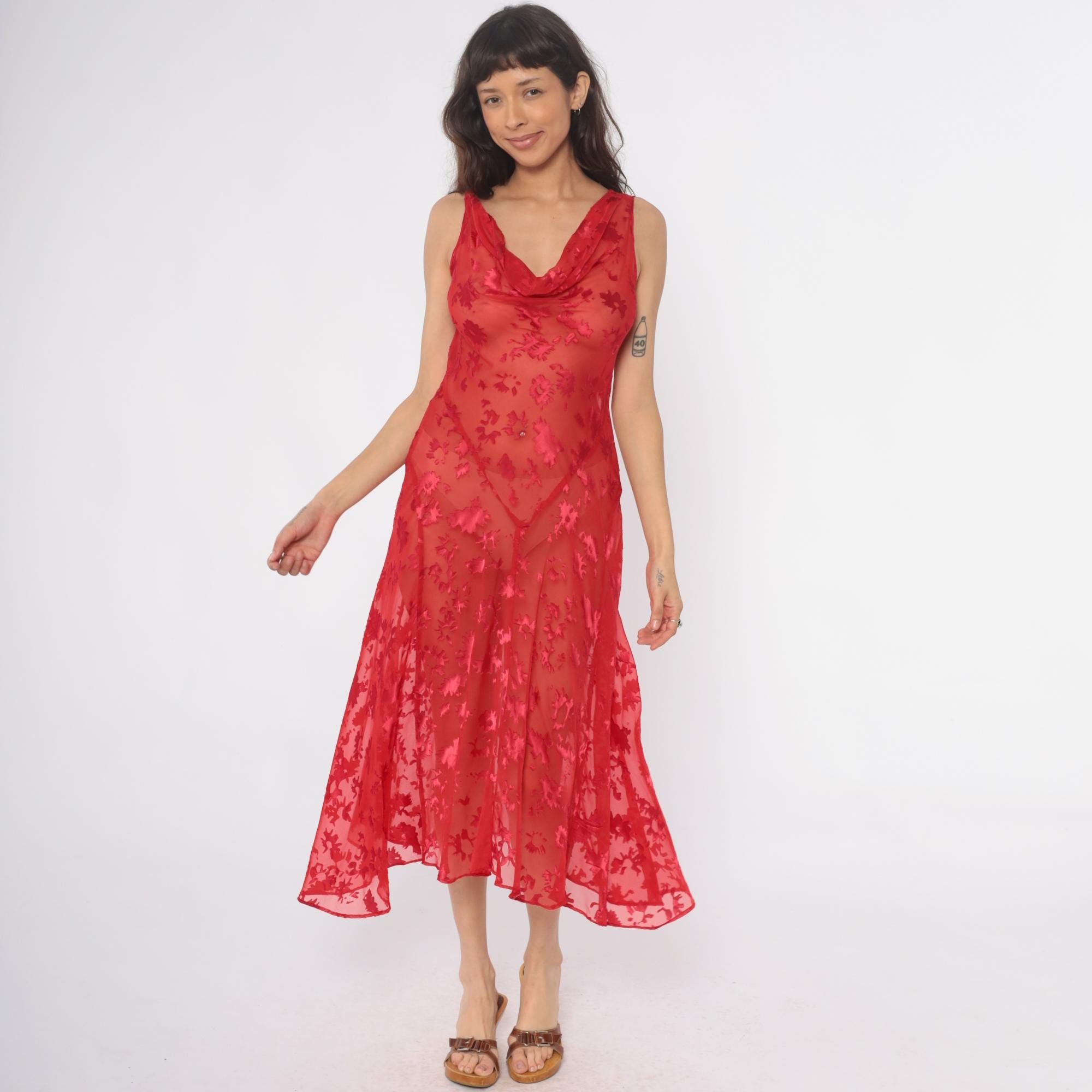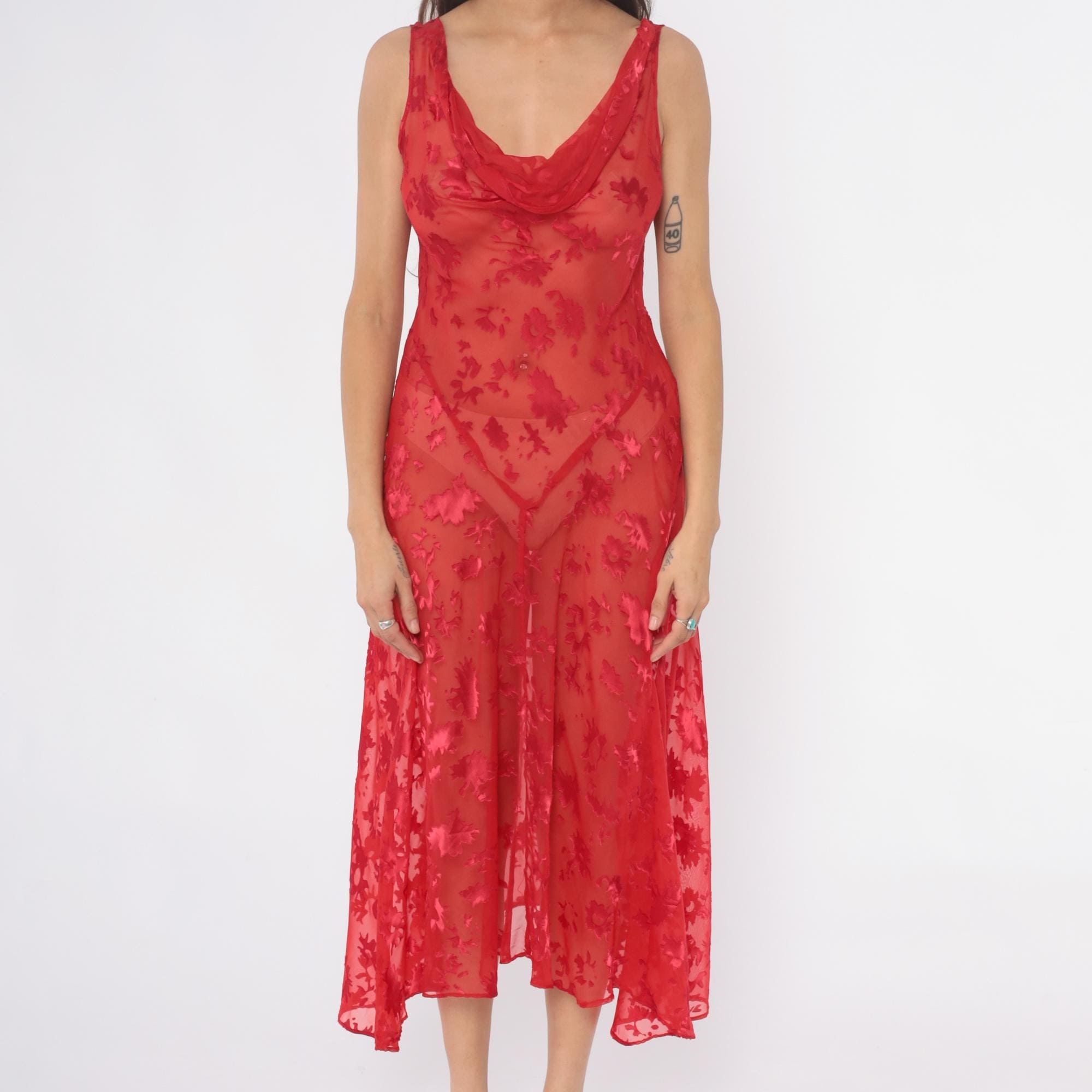 90s red midi dress with burn-out floral pattern across sheer overlay fabric. Sleeveless with V-neckline in front and back, asymmetric handkerchief hemline. Slip dress silhouette with fitted bodice.