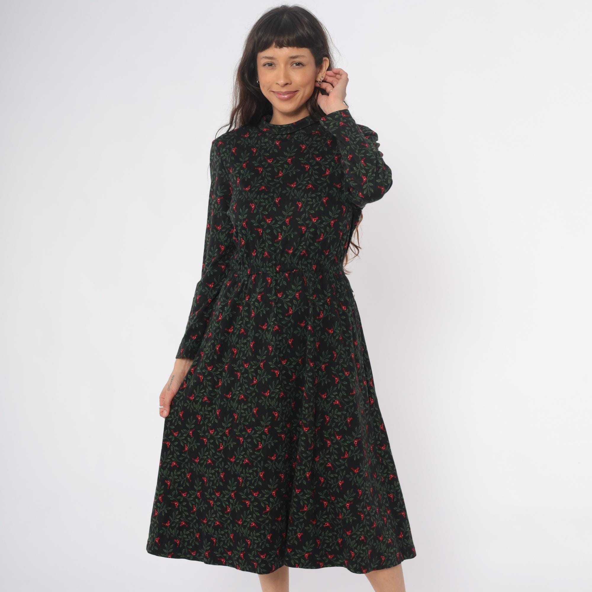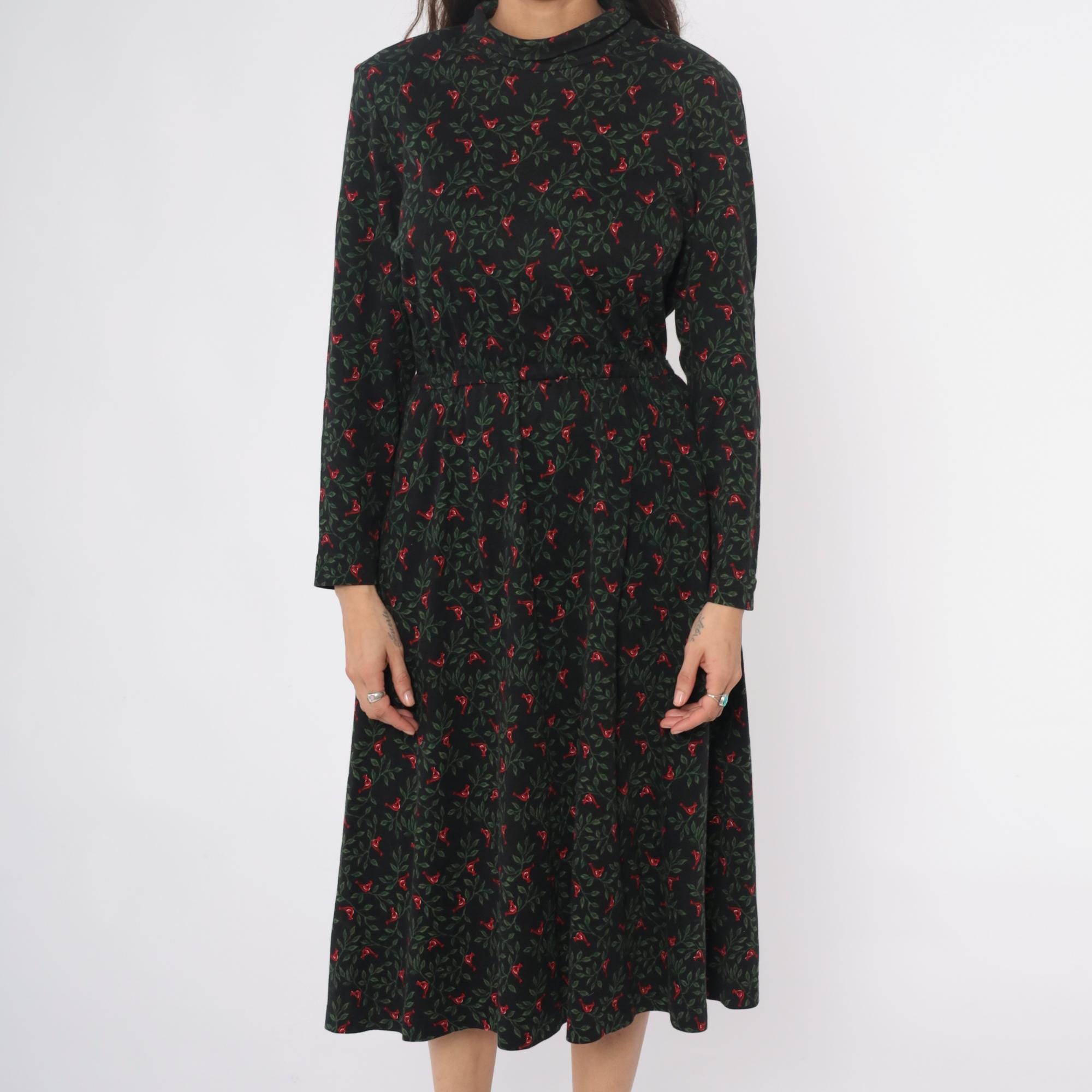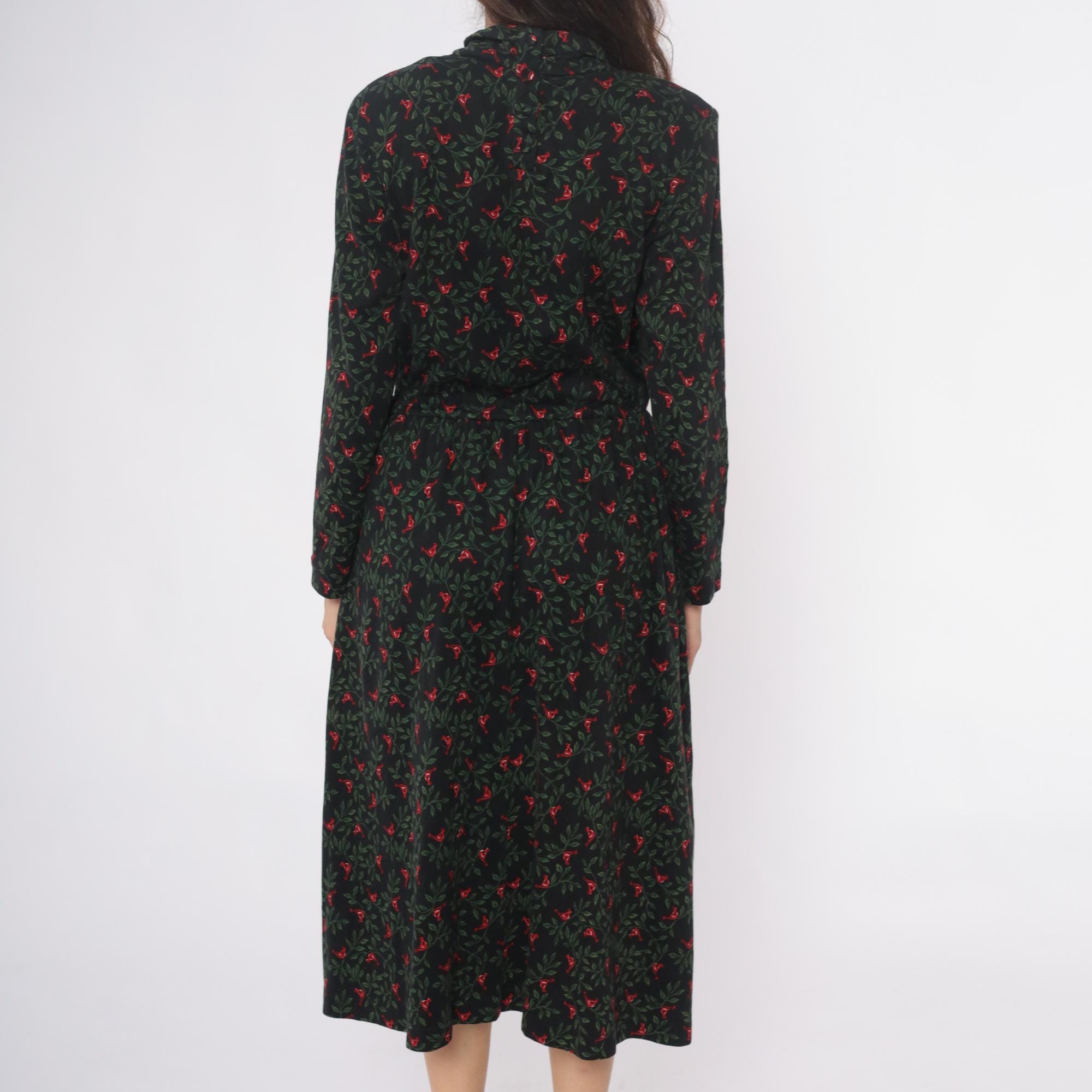 90s black floral midi dress from Talbots with red birds and green foliage pattern throughout. Mock neck collar, long sleeves with gathered cuffs, button front closure. Fitted waist releases to A-line skirt with side pockets. Cotton. Tagged size Medium.