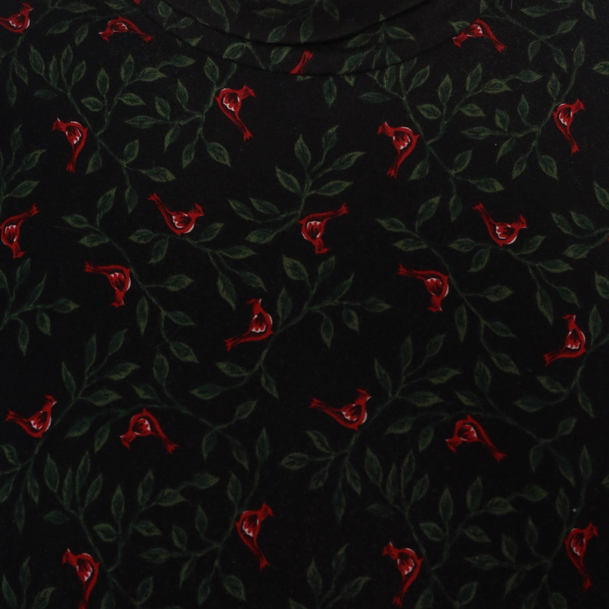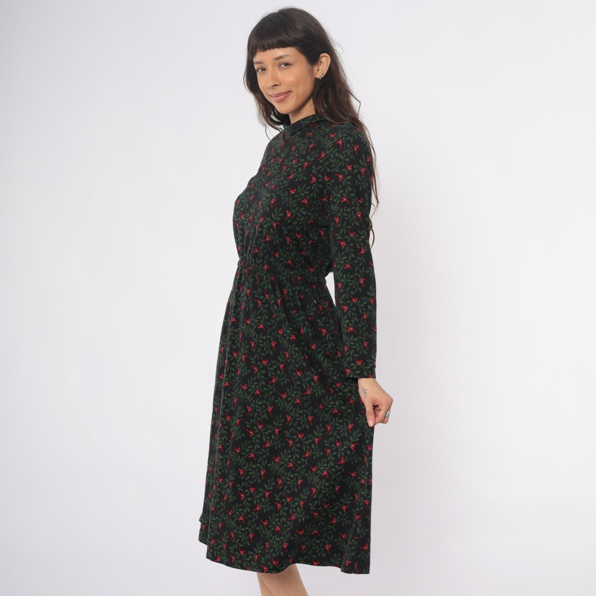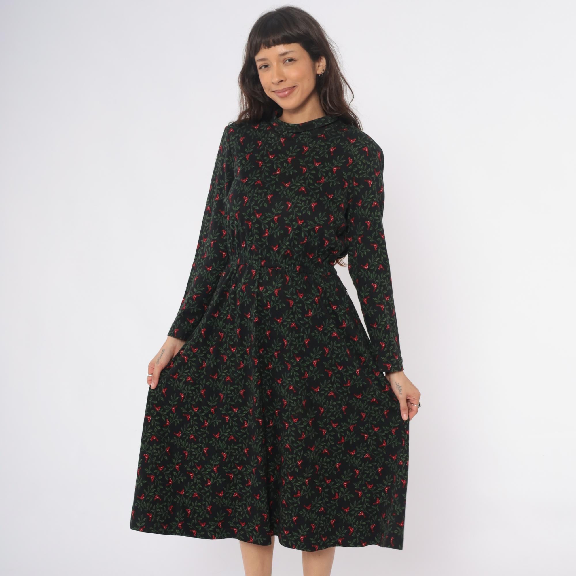 90s black floral midi dress from Talbots with red birds and green foliage pattern throughout. Mock neck collar, long sleeves with gathered cuffs, button front closure. Fitted waist releases to A-line skirt with side pockets. Cotton. Tagged size Medium.