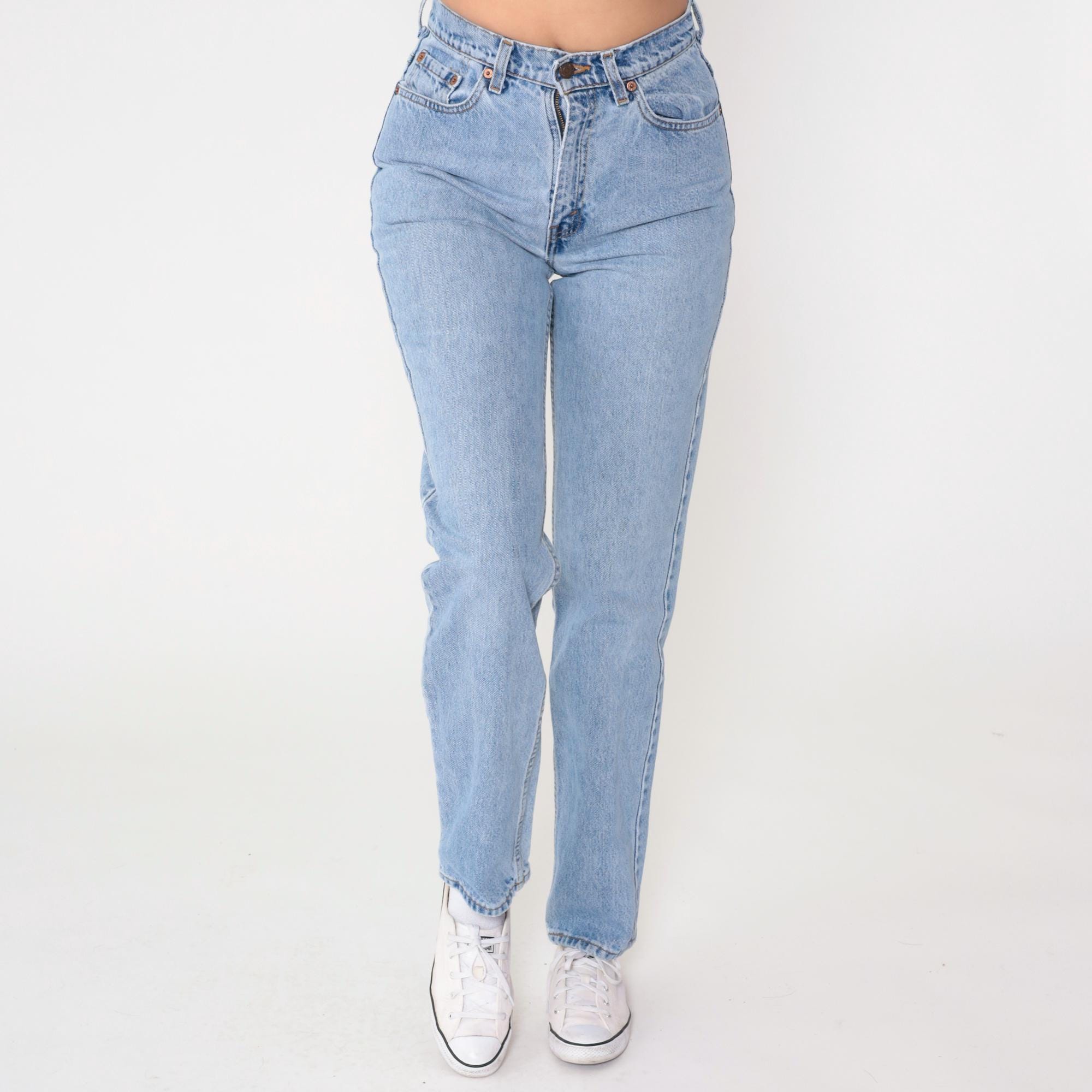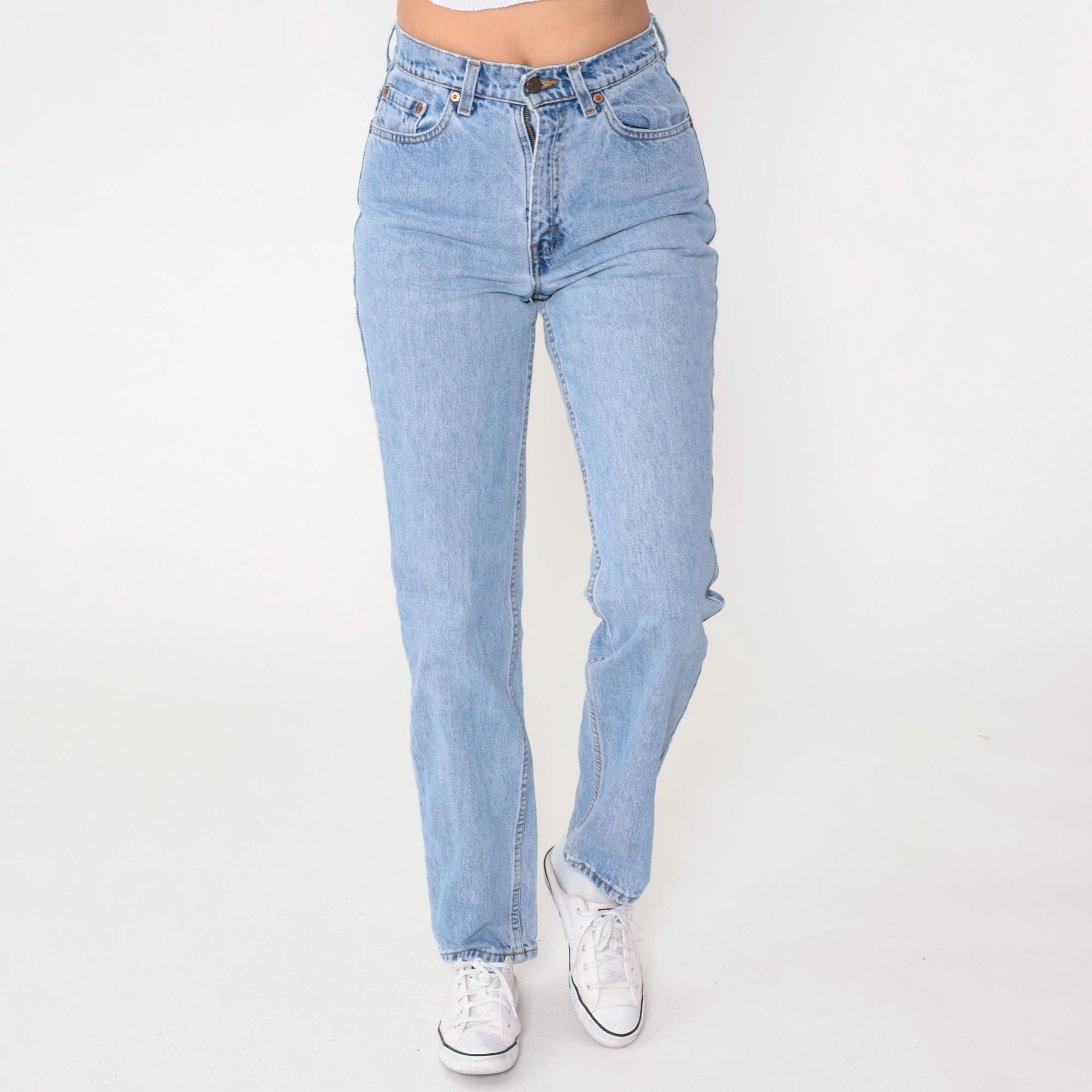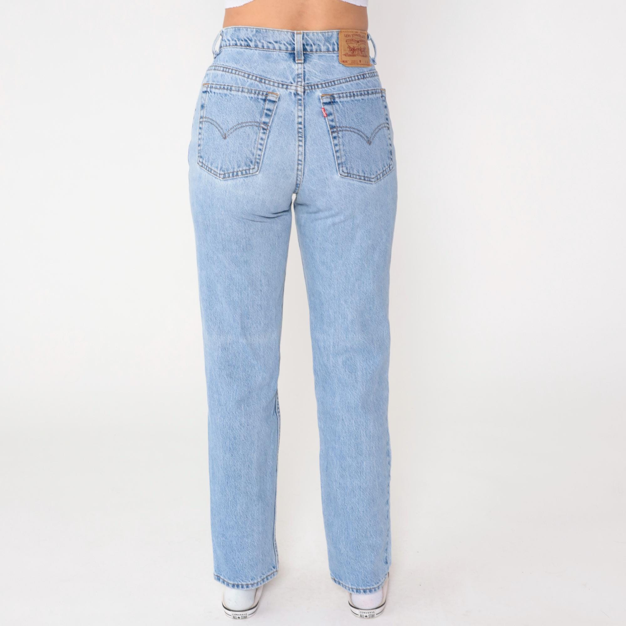 90s light blue high waisted straight leg jeans from Levi's 521 with button fly closure and classic five-pocket styling. Light wash denim with tan leather logo patch at back waist.