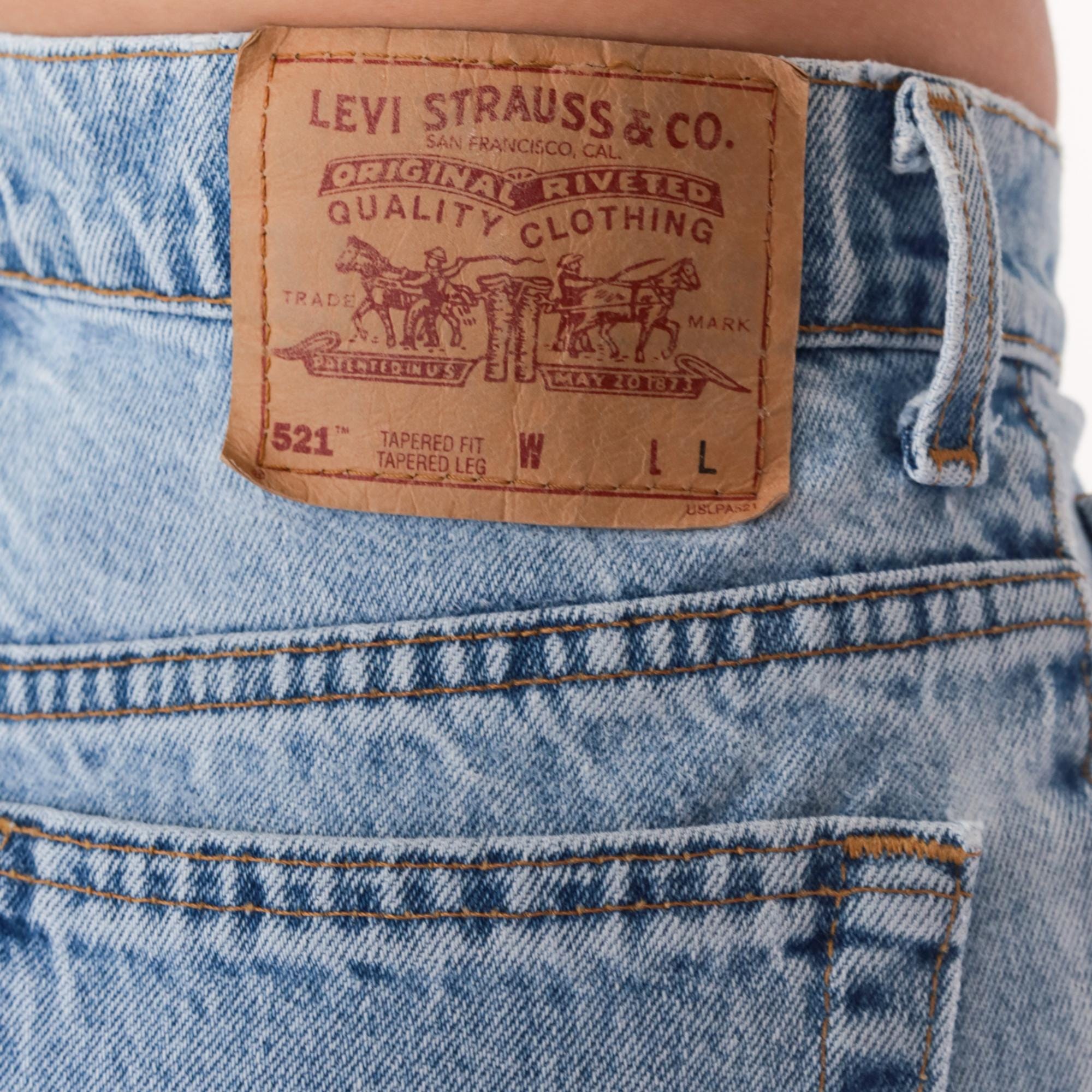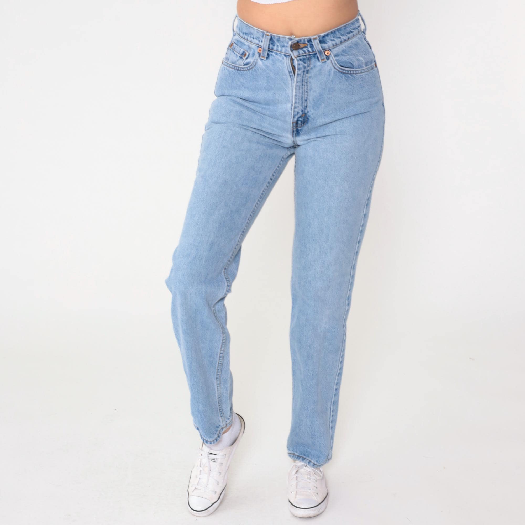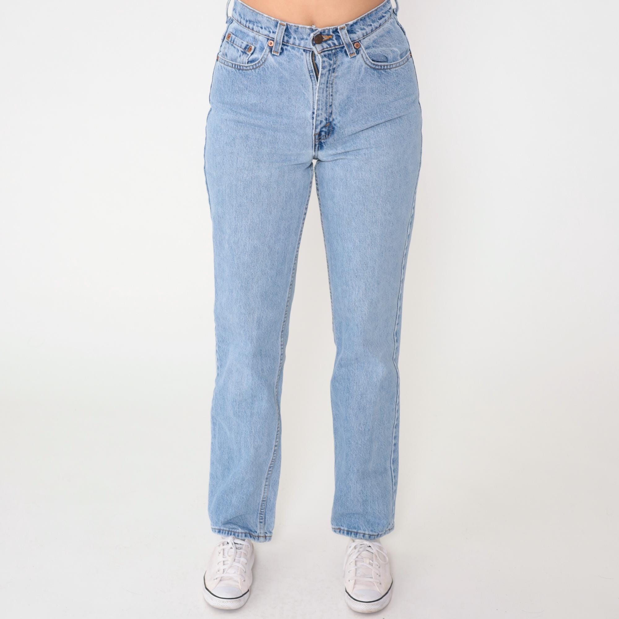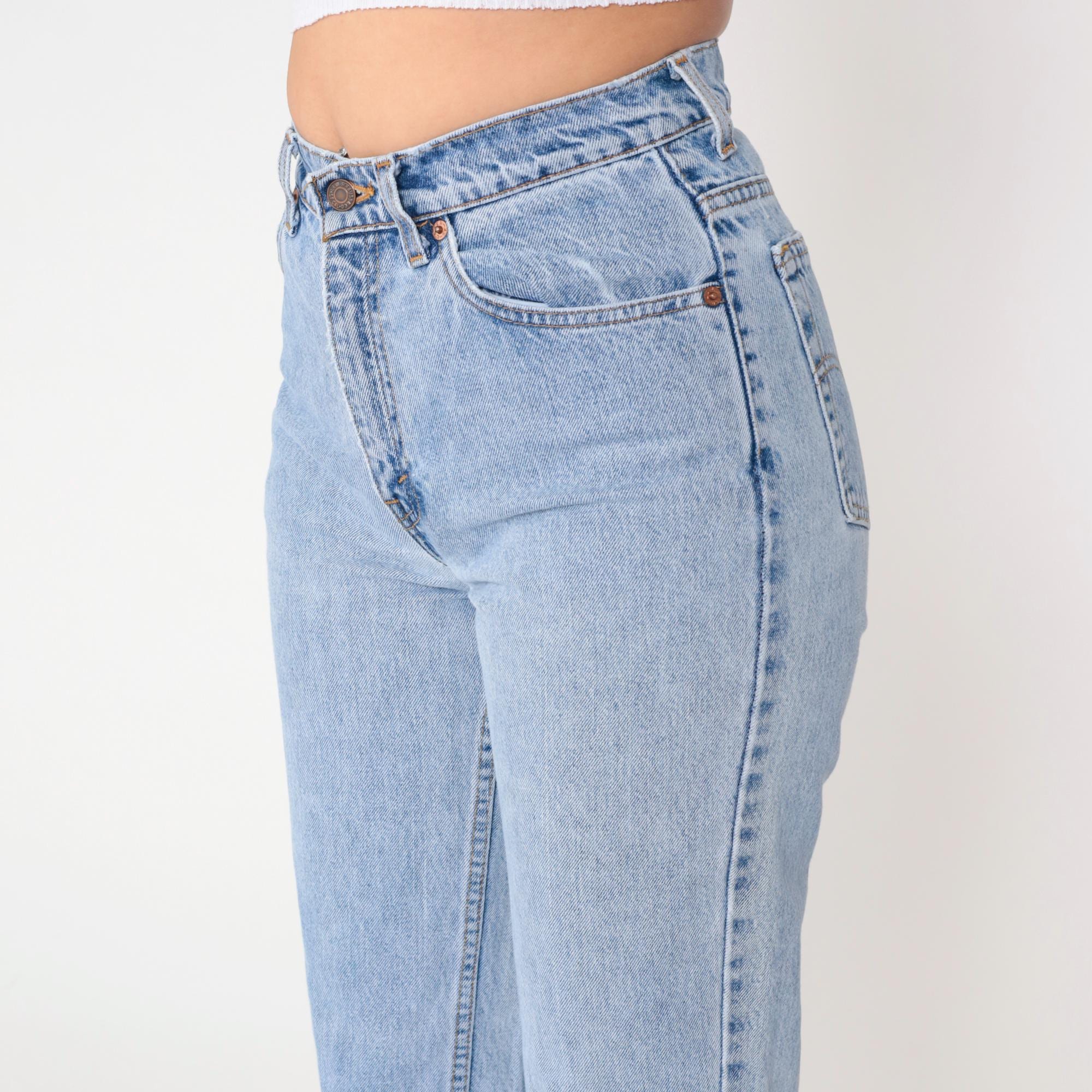 90s light blue high waisted straight leg jeans from Levi's 521 with button fly closure and classic five-pocket styling. Light wash denim with tan leather logo patch at back waist.