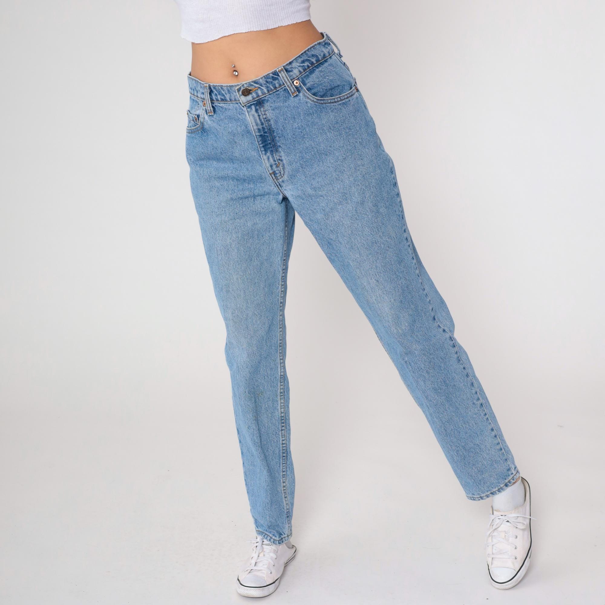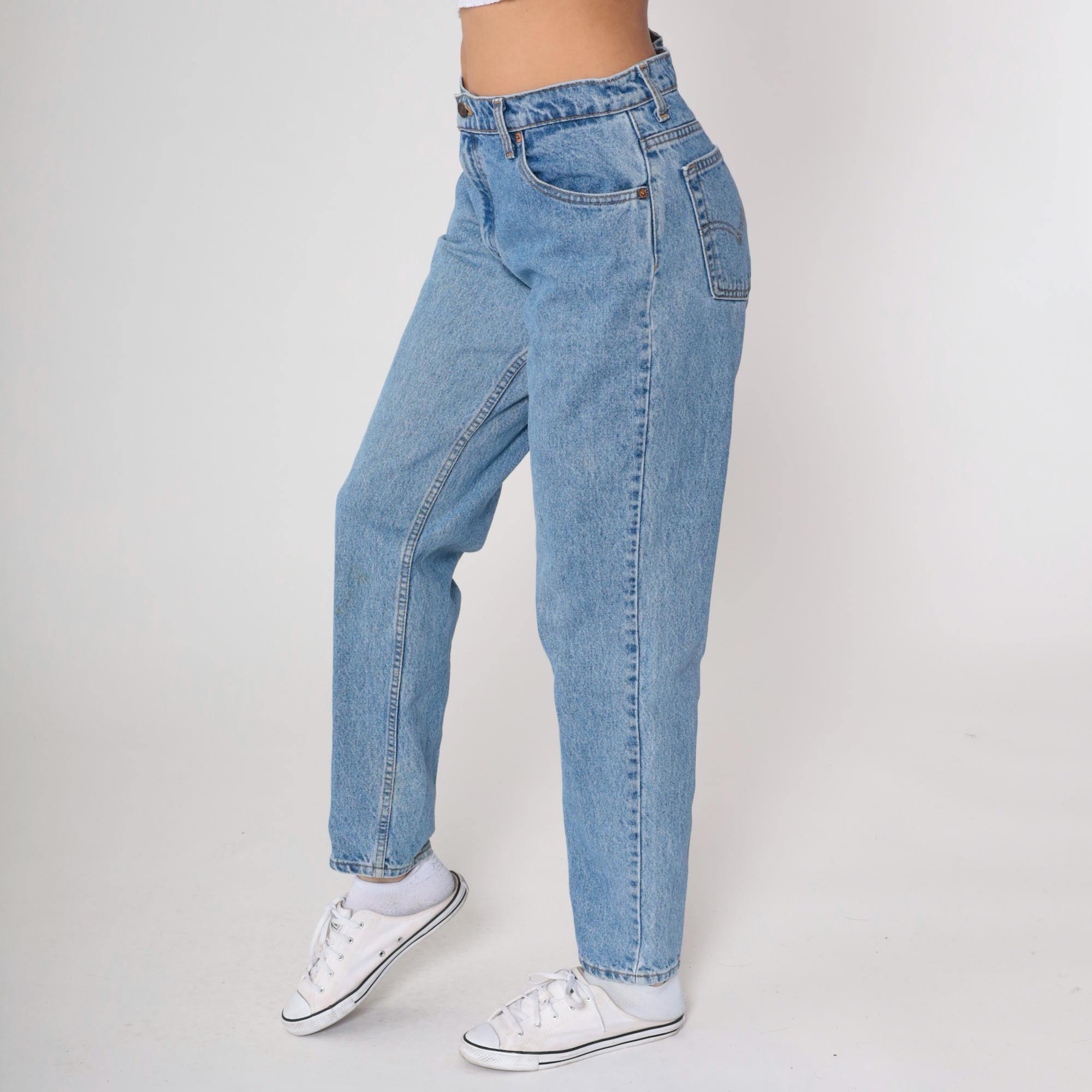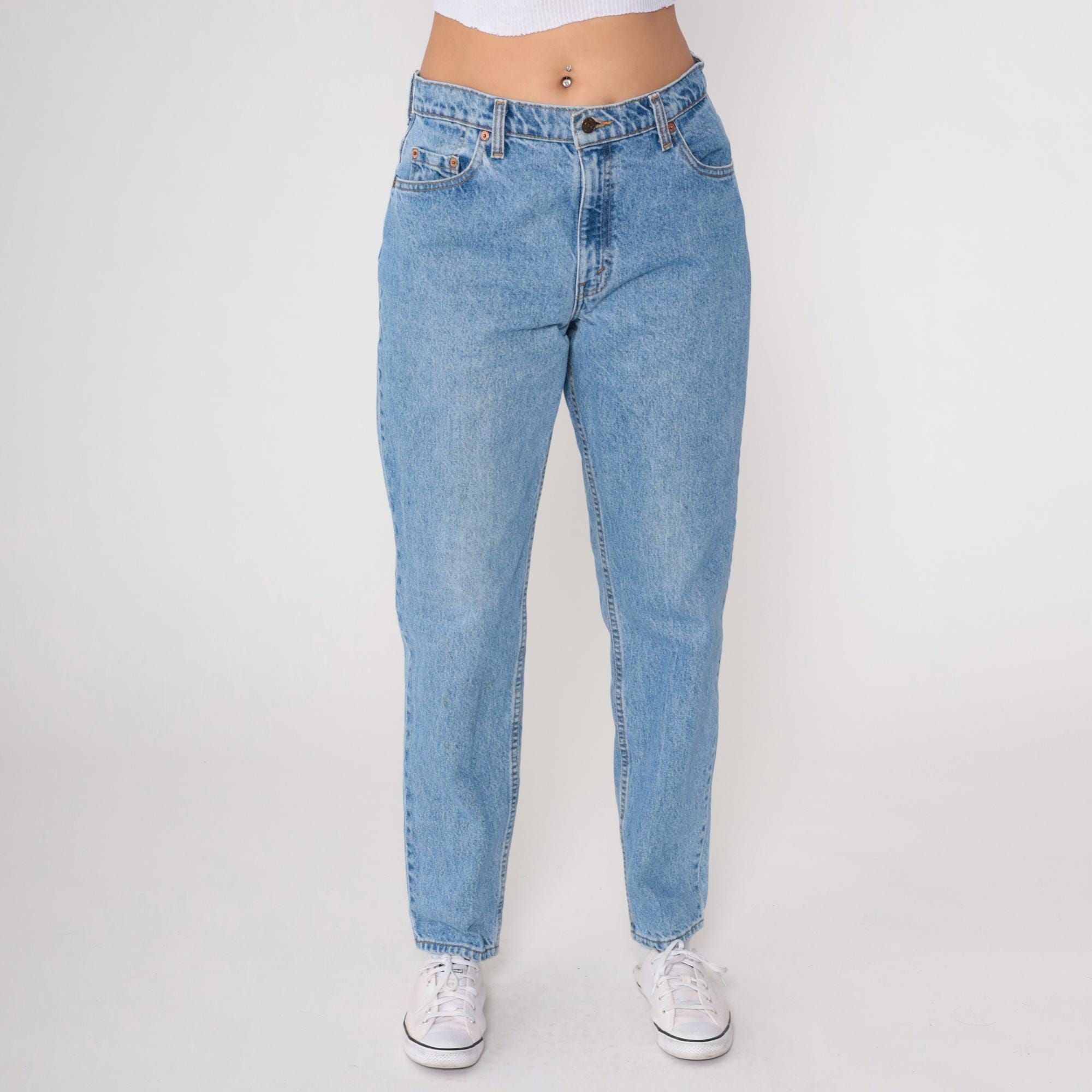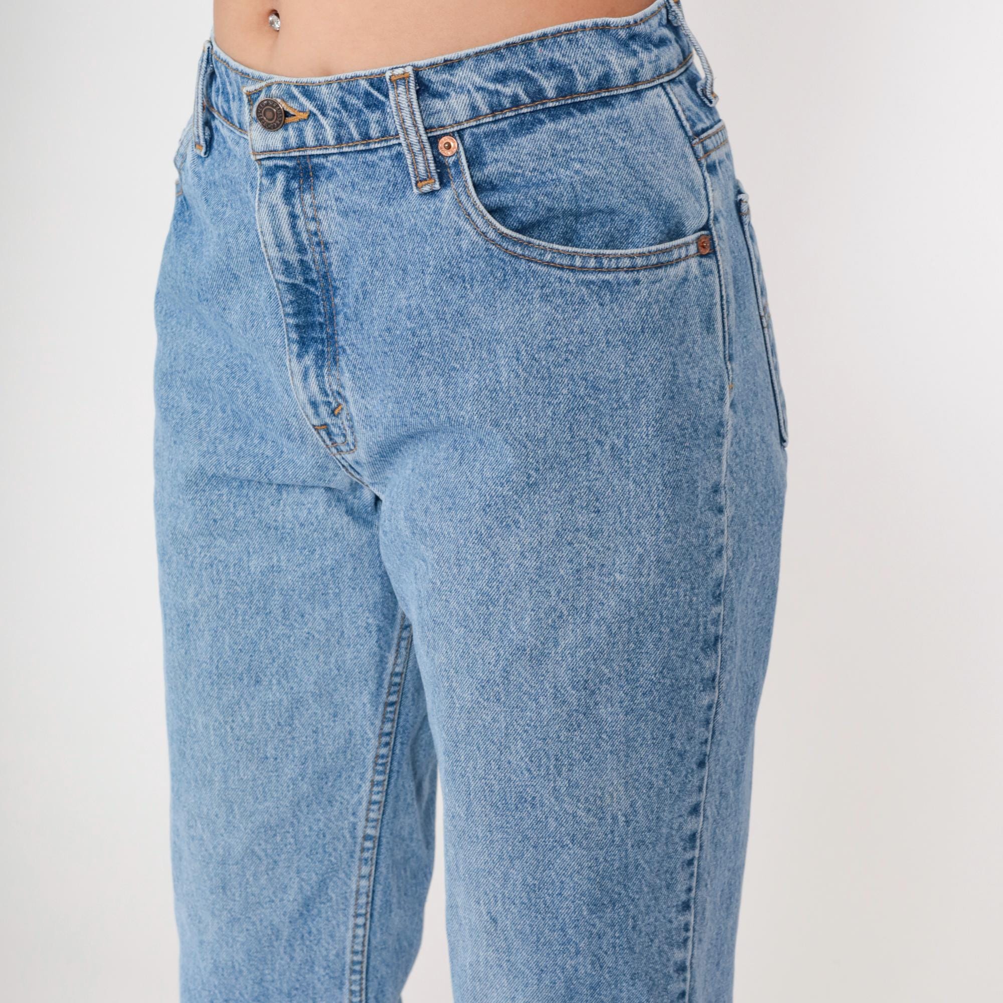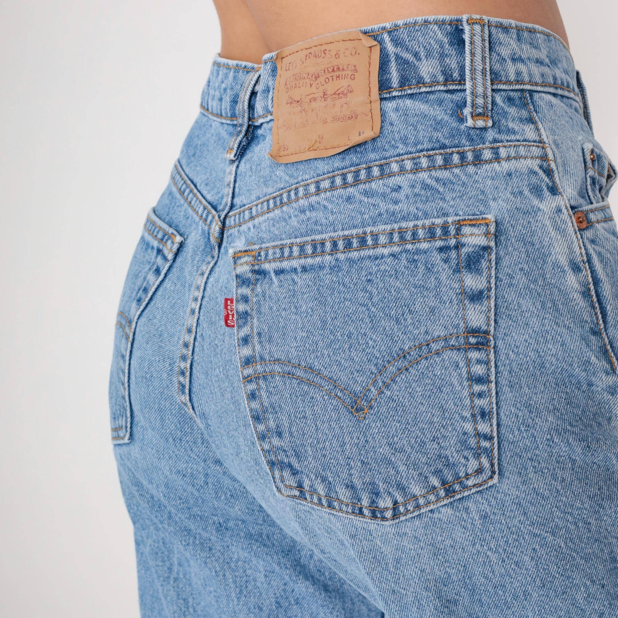 90s light blue high-waisted jeans from Levi's with straight leg cut and button fly closure. Classic five-pocket construction with tan leather Levi's patch at back waist.