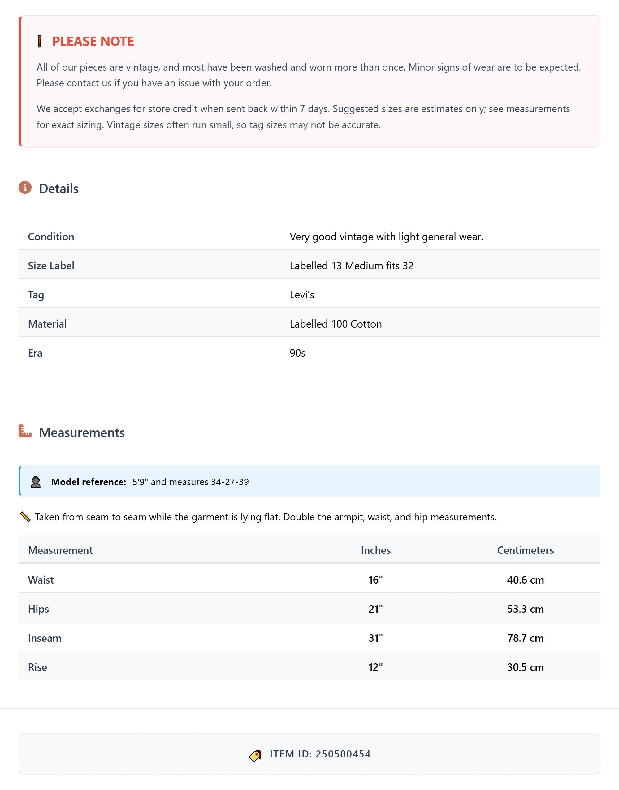 Vintage denim was usually made without any stretch, unlike modern jeans. Check the measurements to ensure proper fit, and remember to give yourself a little wiggle room in the waist and hips, depending on your preferred fit.