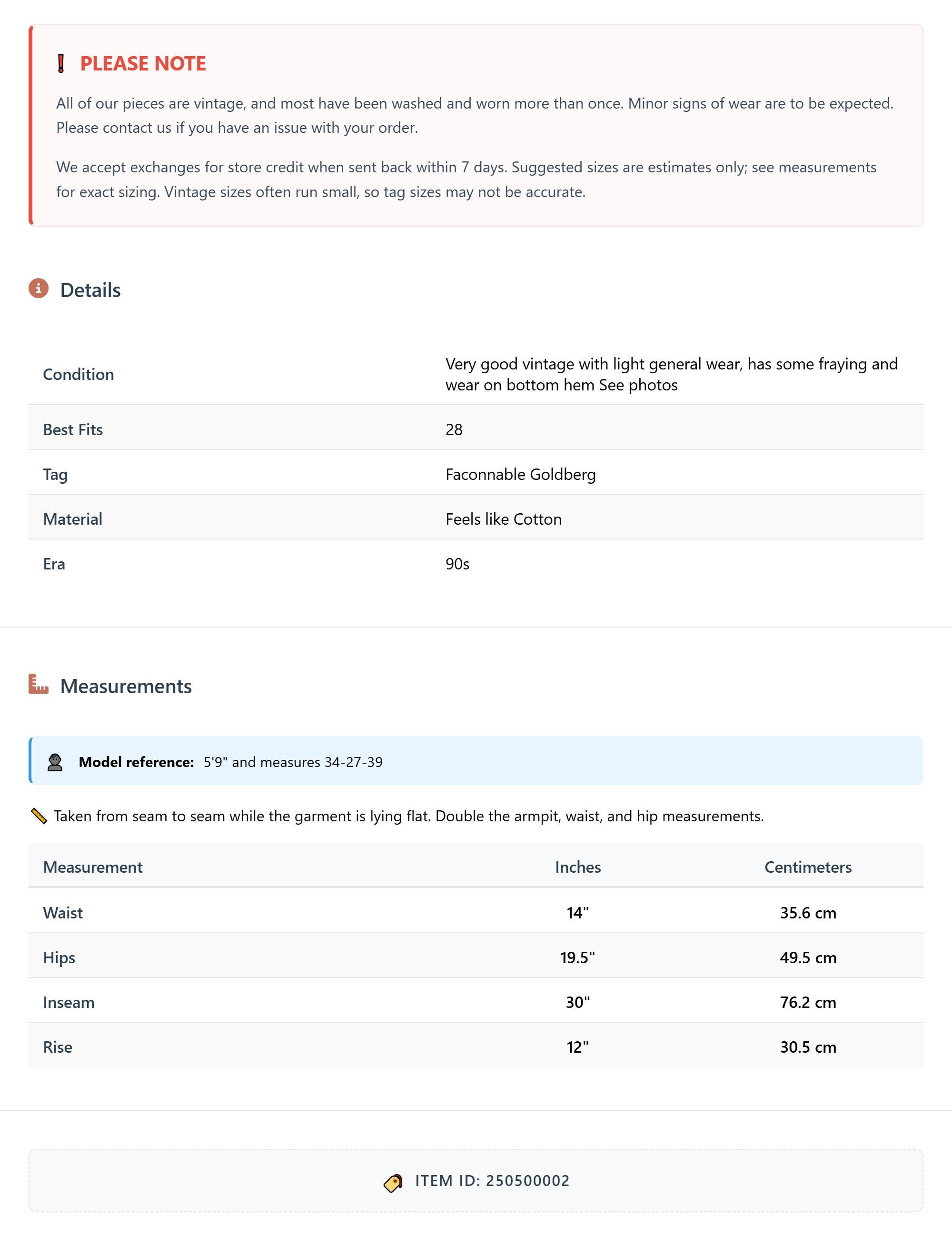 All of our pieces are vintage, and most have been washed and worn more than once. Minor signs of wear are to be expected. Please contact us if you have an issue with your order. We accept exchanges for store credit when sent back within 7 days.