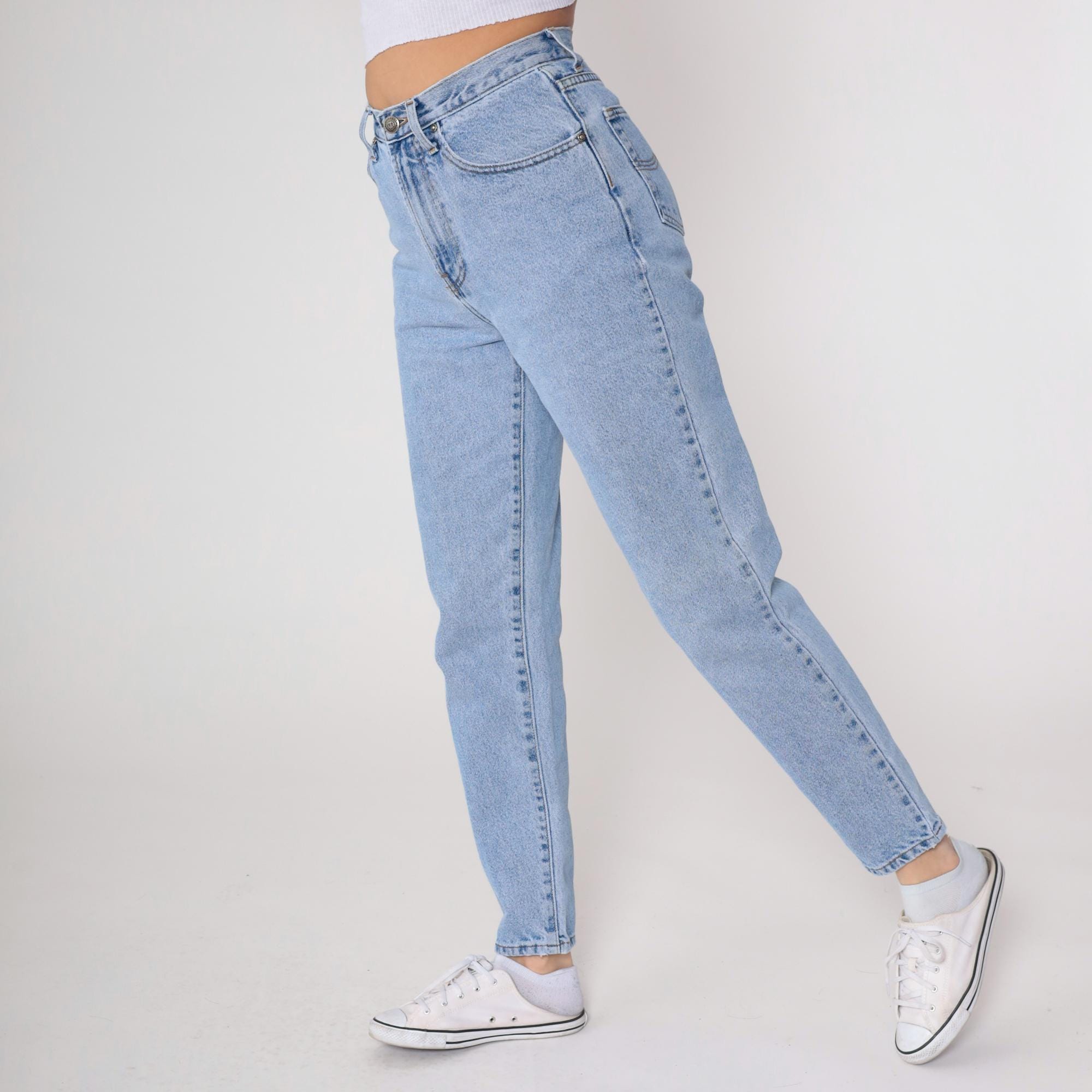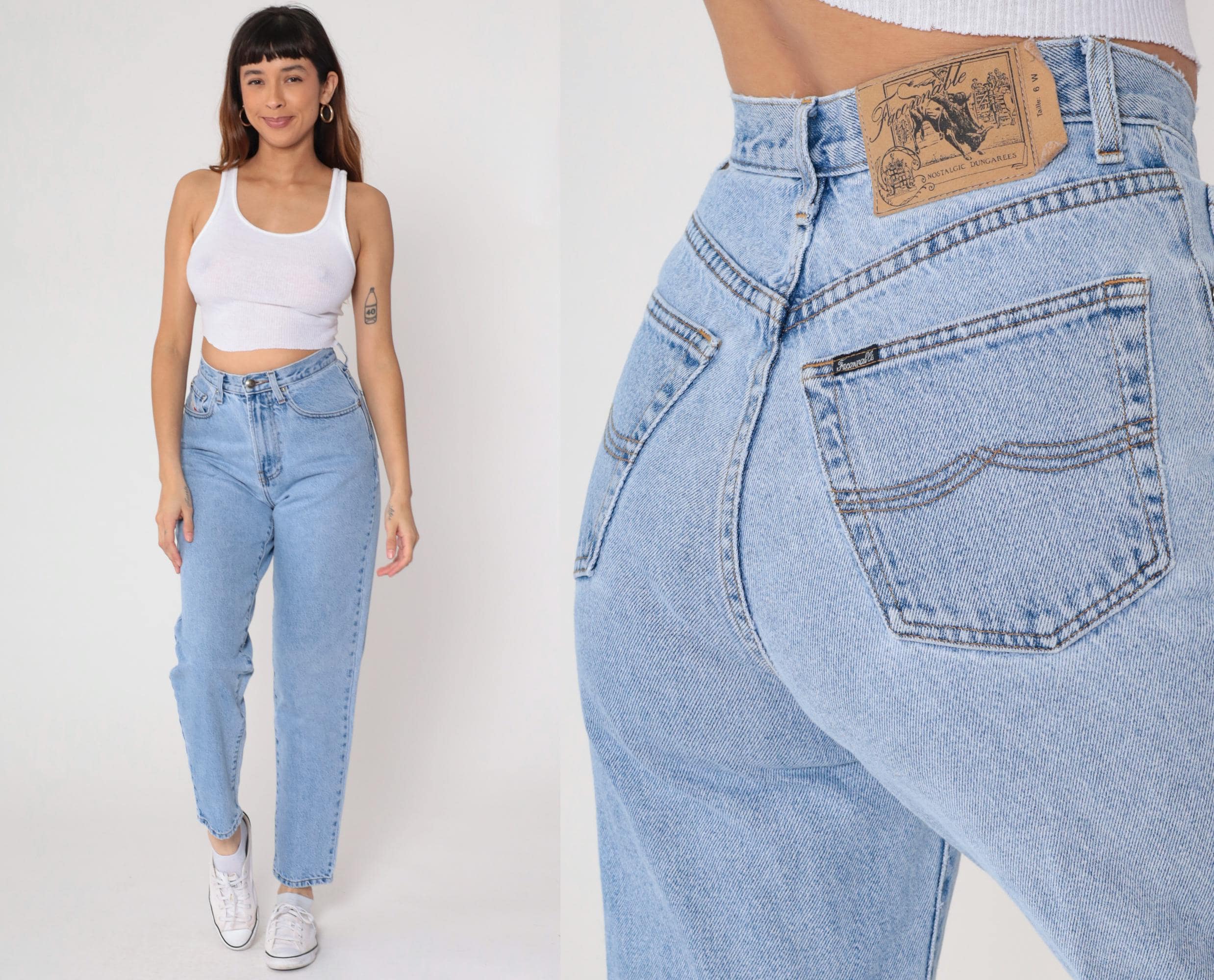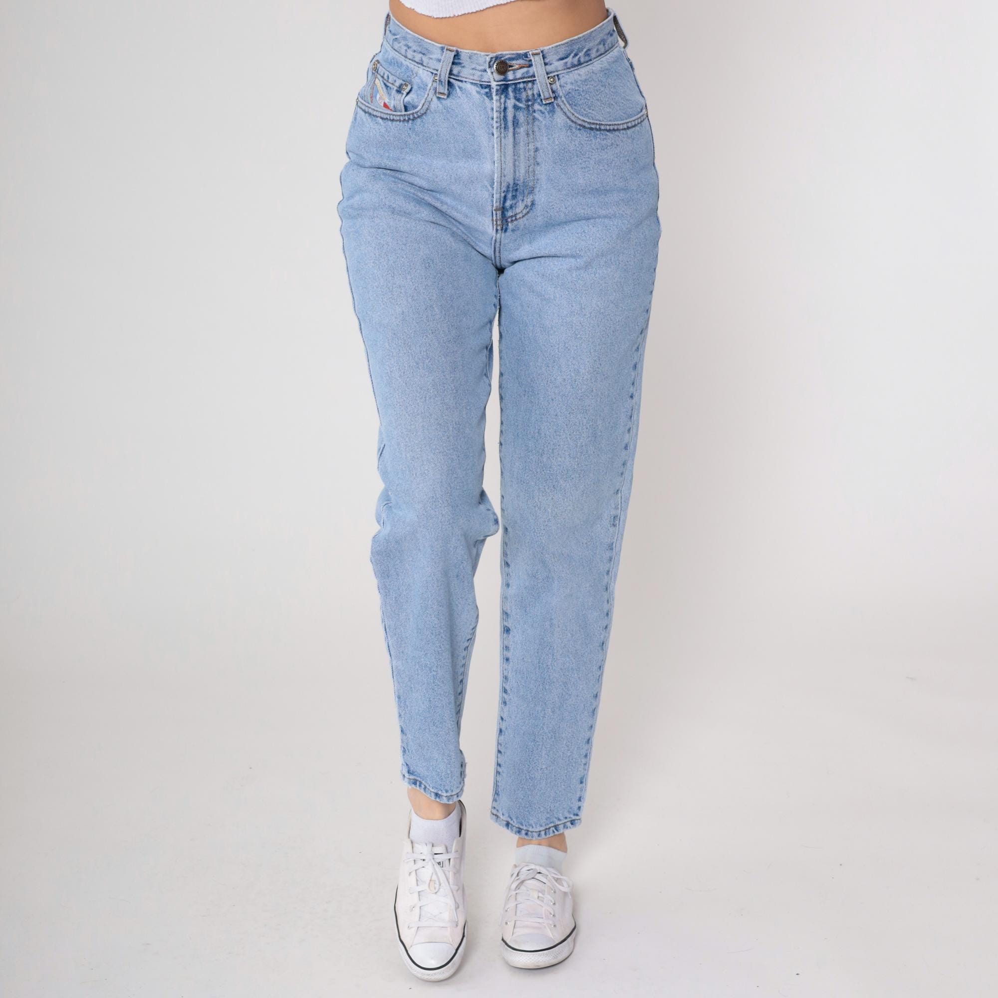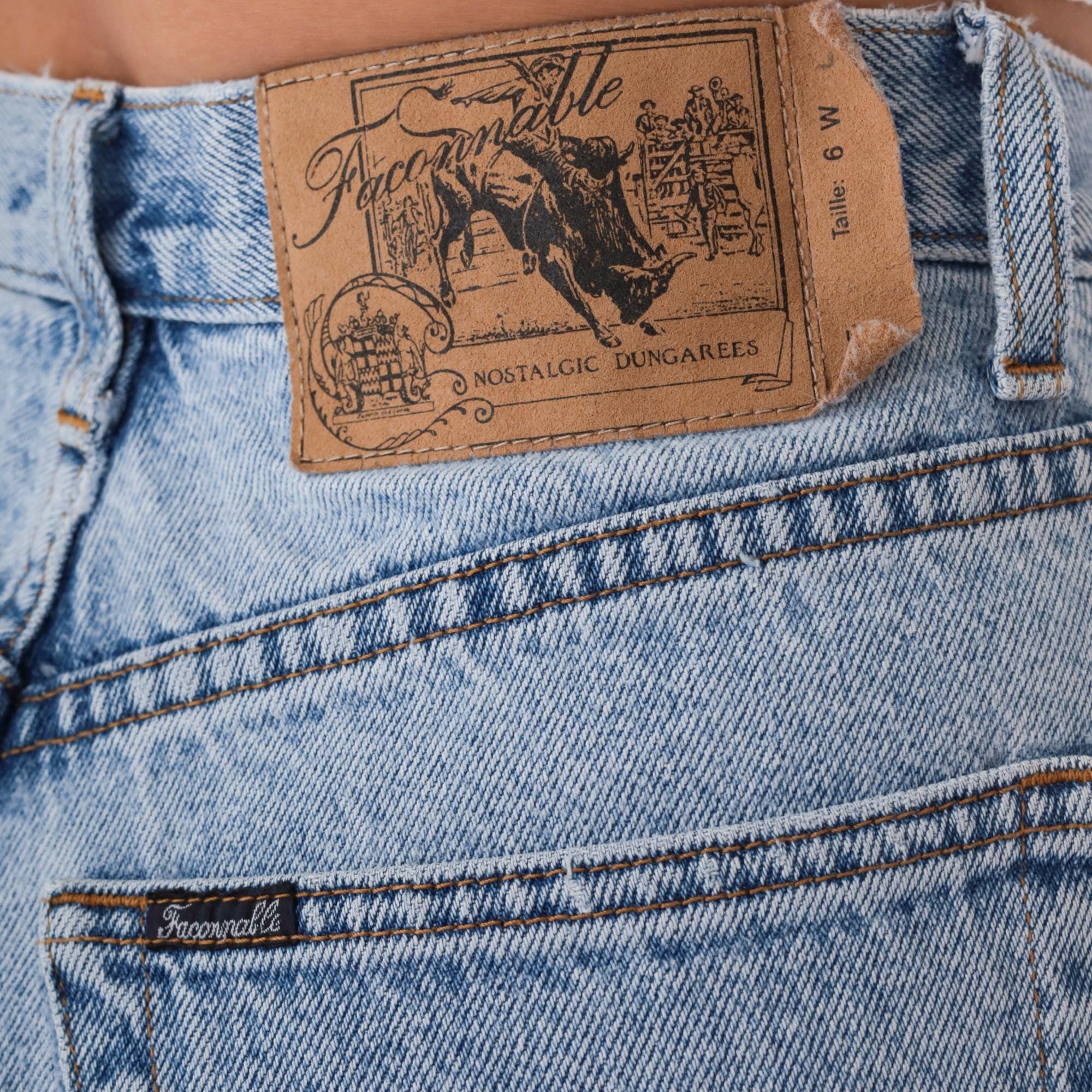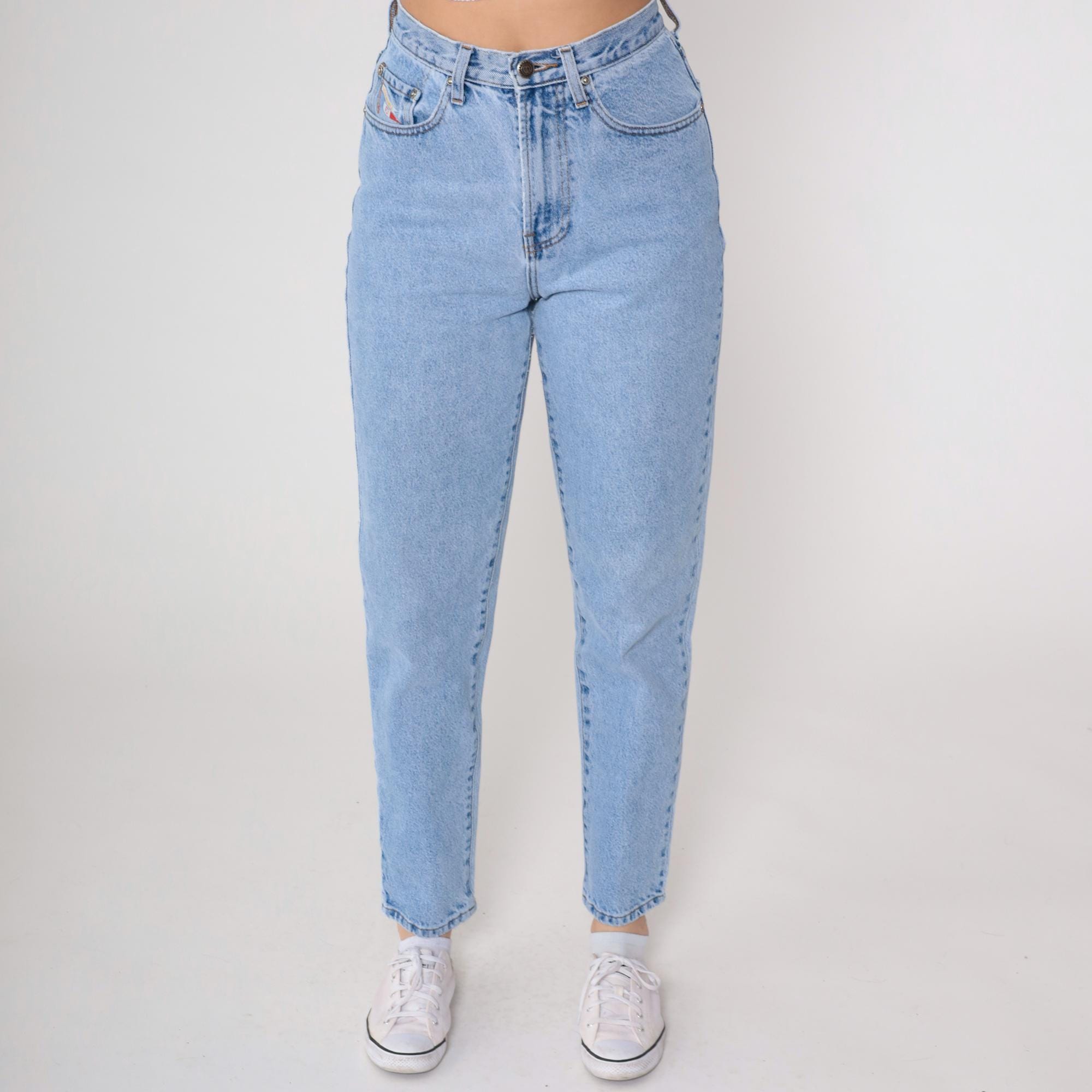 90s light blue high waisted jeans from Faconnable Goldberg with tapered leg and classic five-pocket styling. Button fly closure, belt loops, light wash denim throughout.