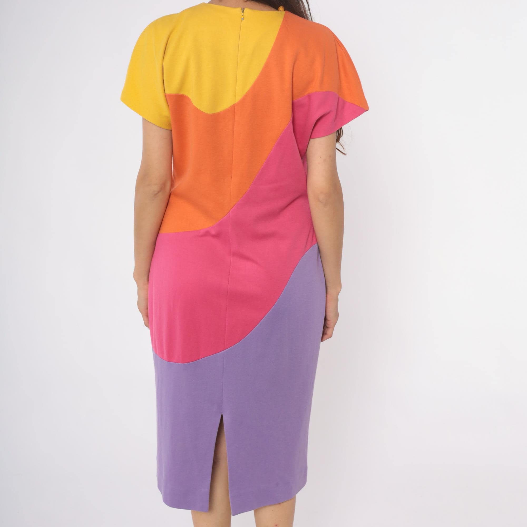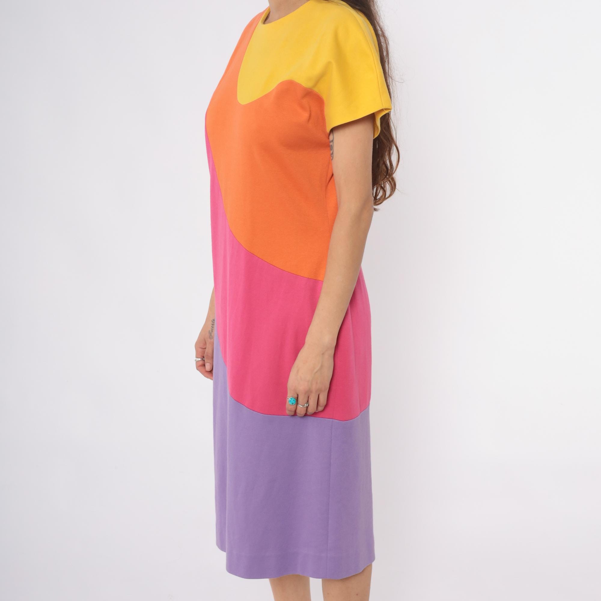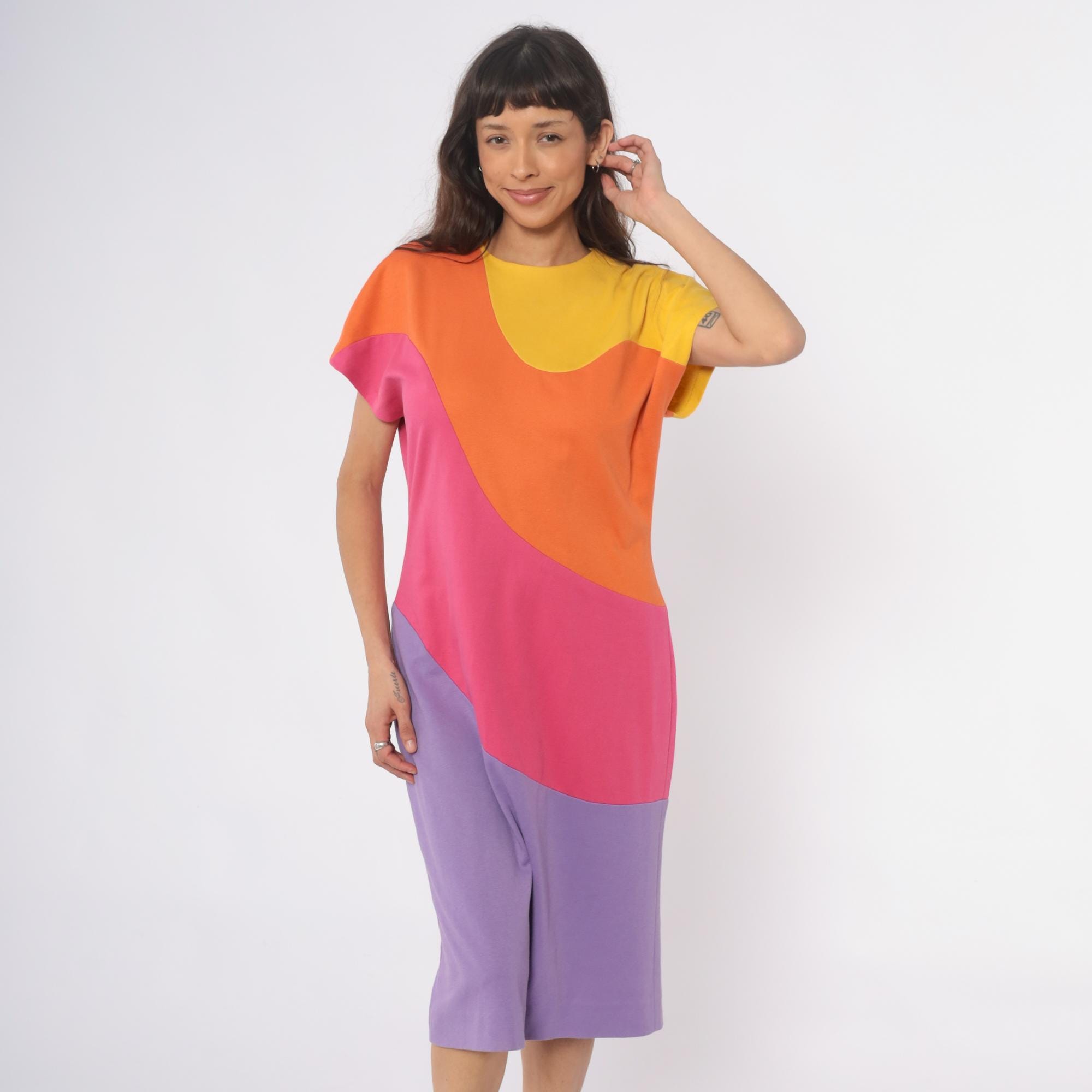 80s colorblock shift dress from Caron with curved geometric panels in yellow, orange, hot pink, and lavender purple. Rounded neckline, short sleeves, back zipper closure.