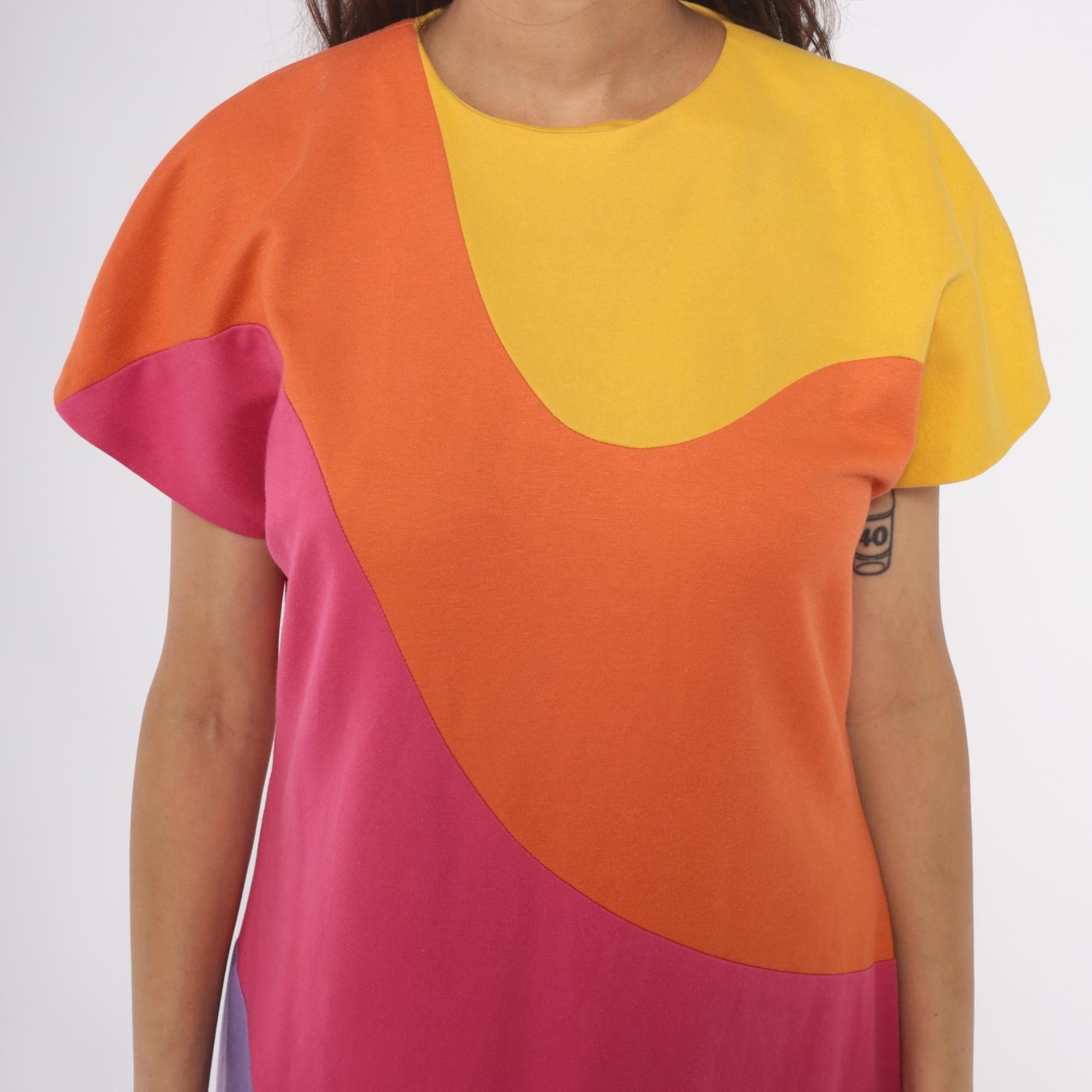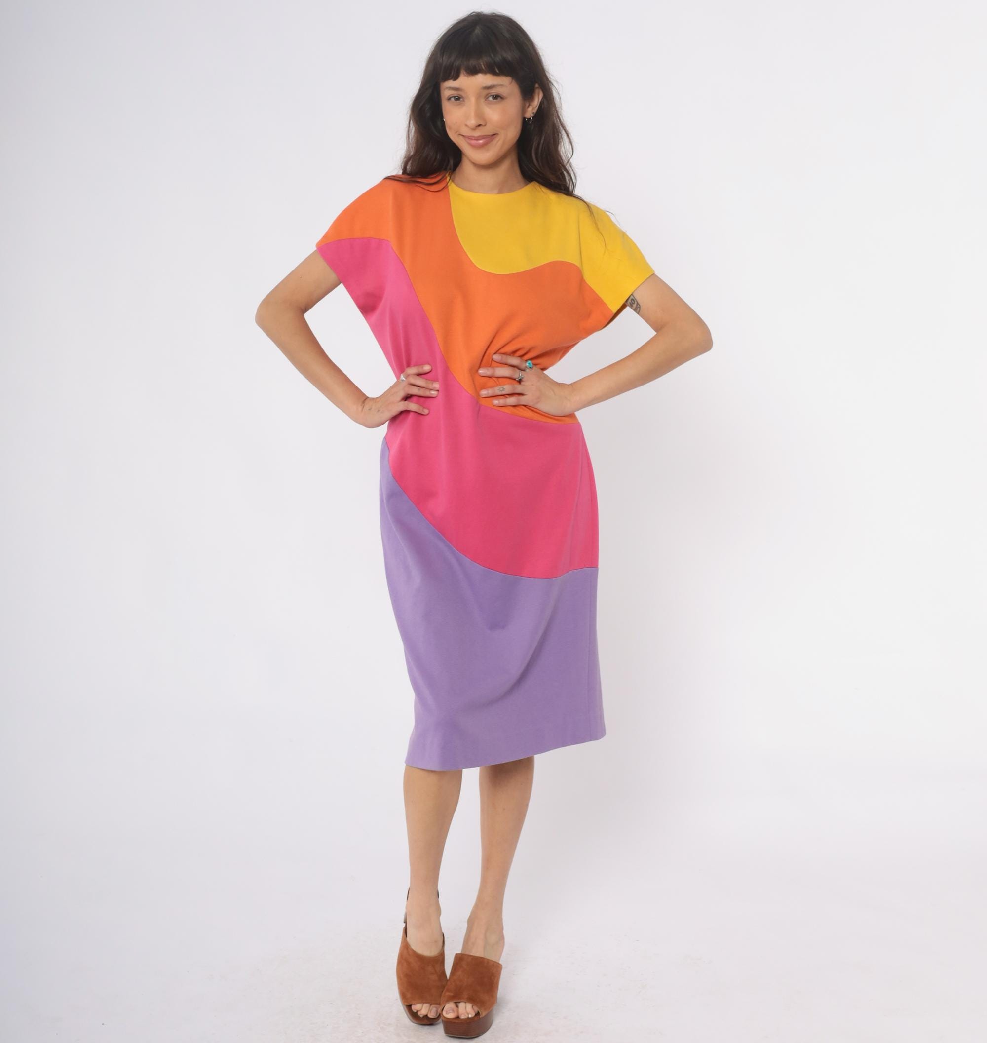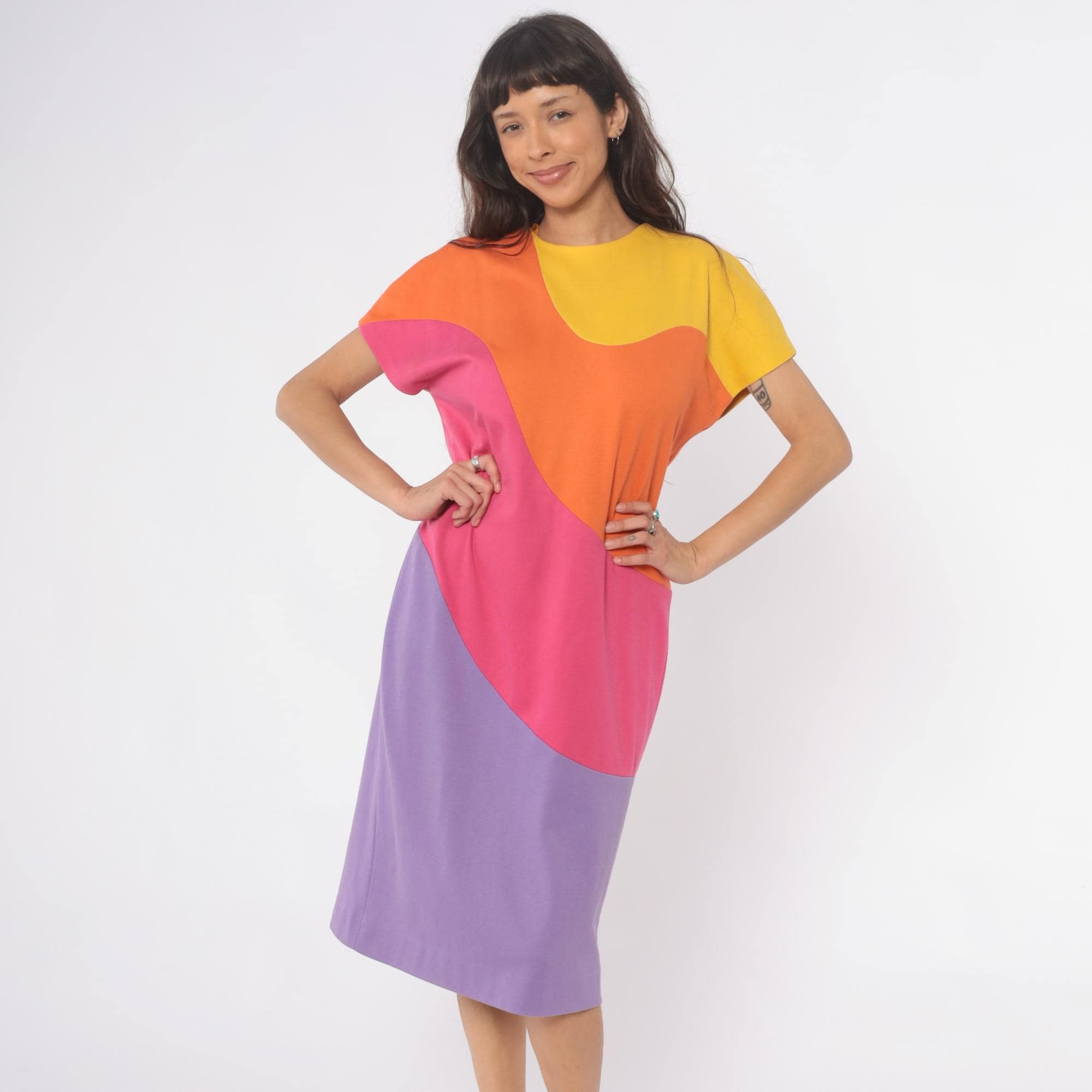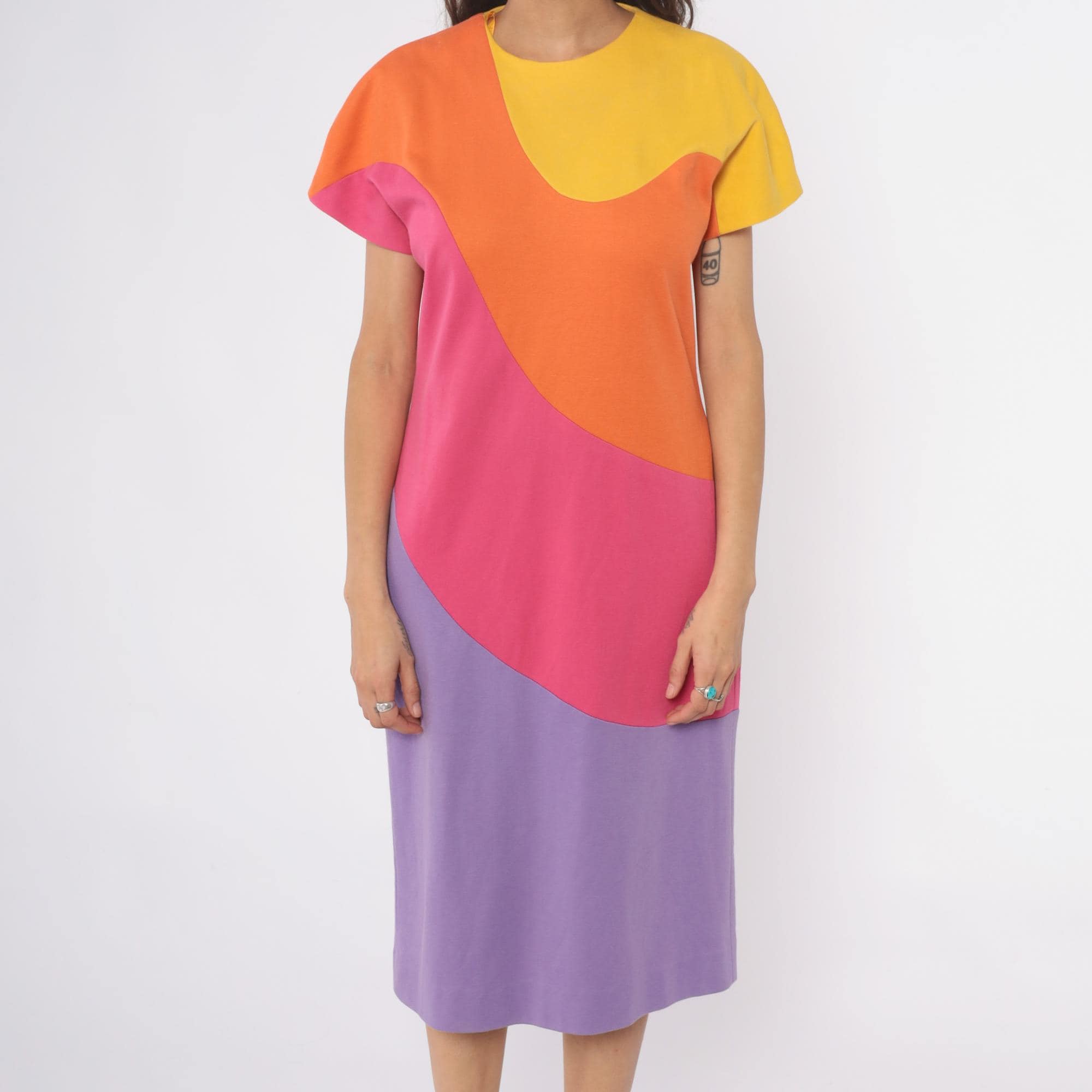 80s colorblock shift dress from Caron with curved geometric panels in yellow, orange, hot pink, and lavender purple. Rounded neckline, short sleeves, back zipper closure.