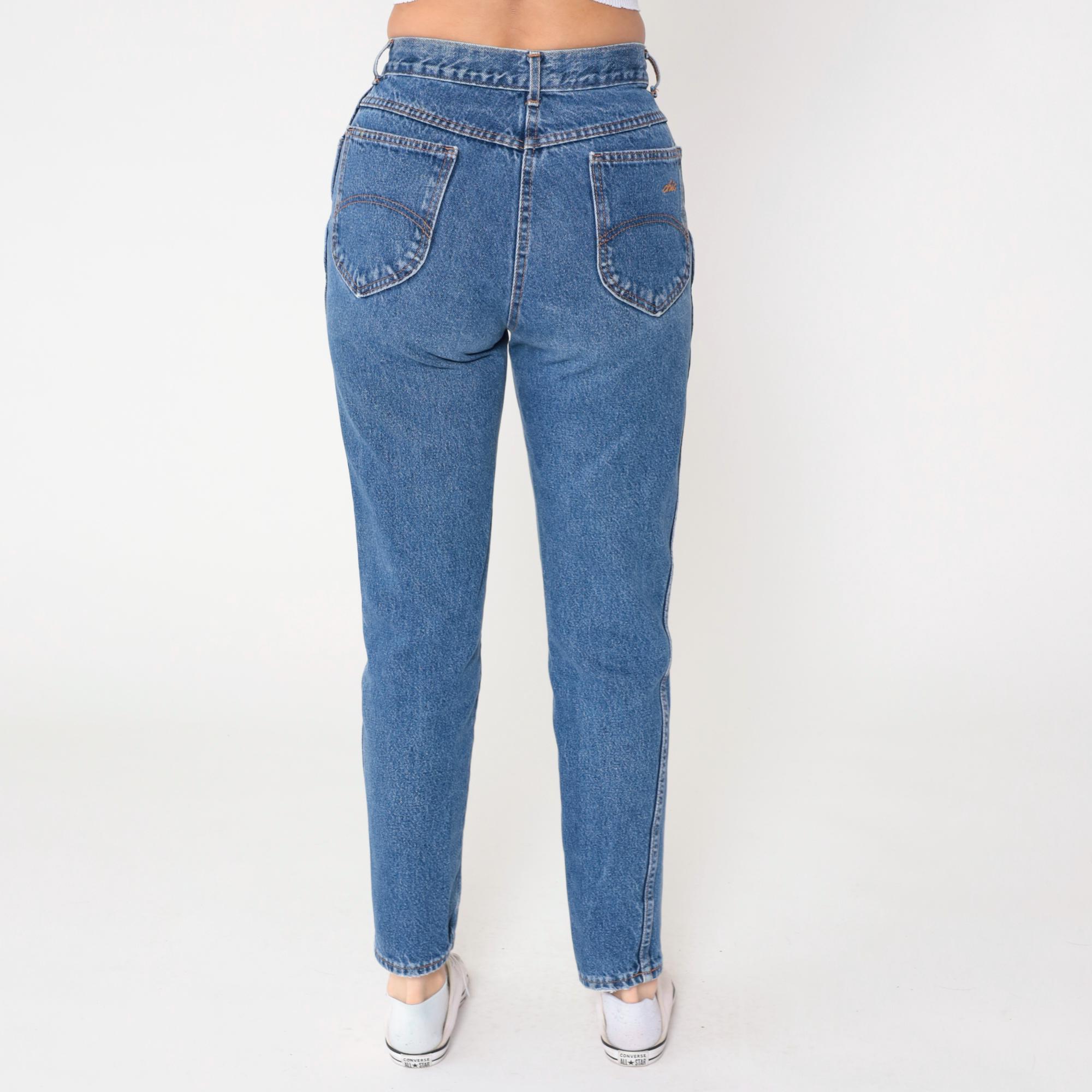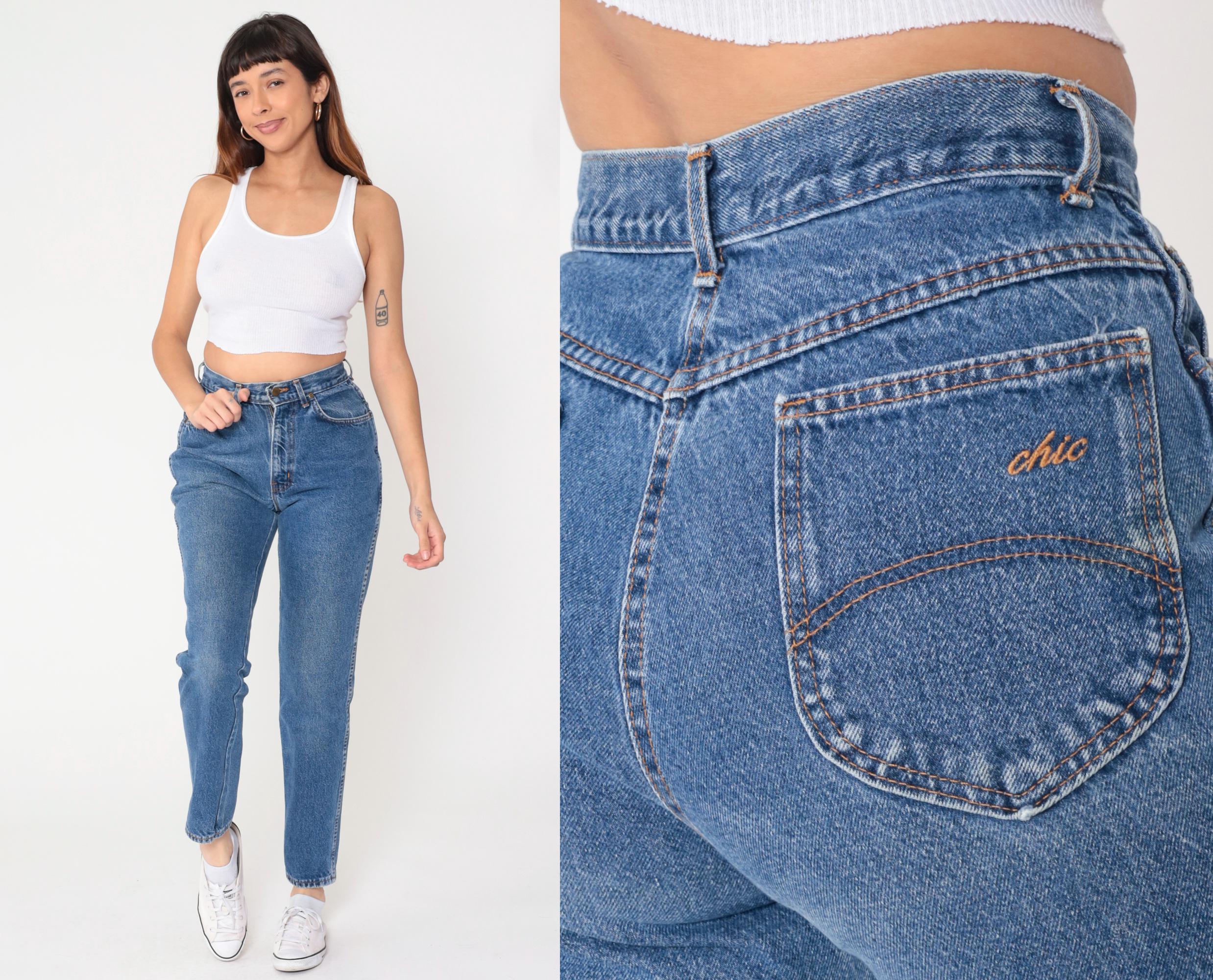90s high-waisted straight leg jeans from Chic in medium blue denim with button fly closure and gold "chic" embroidery on the back pocket. Five-pocket styling with classic construction, straight leg that tapers slightly at the ankle.
