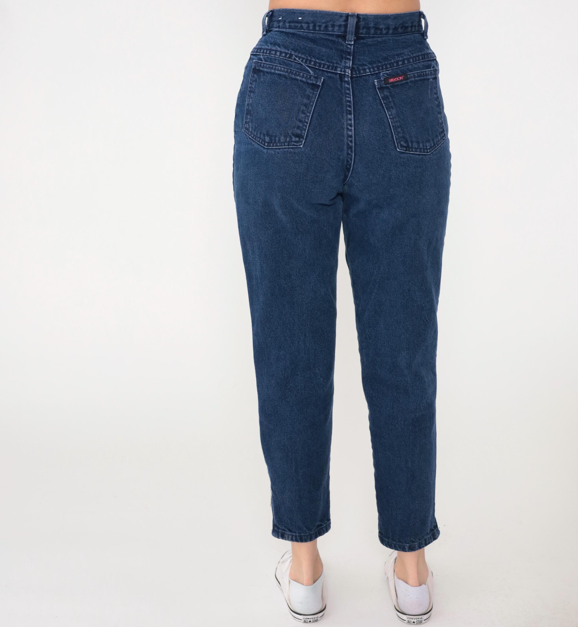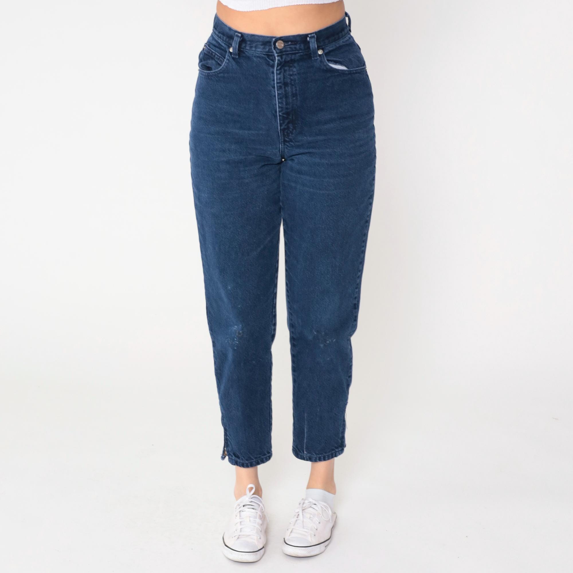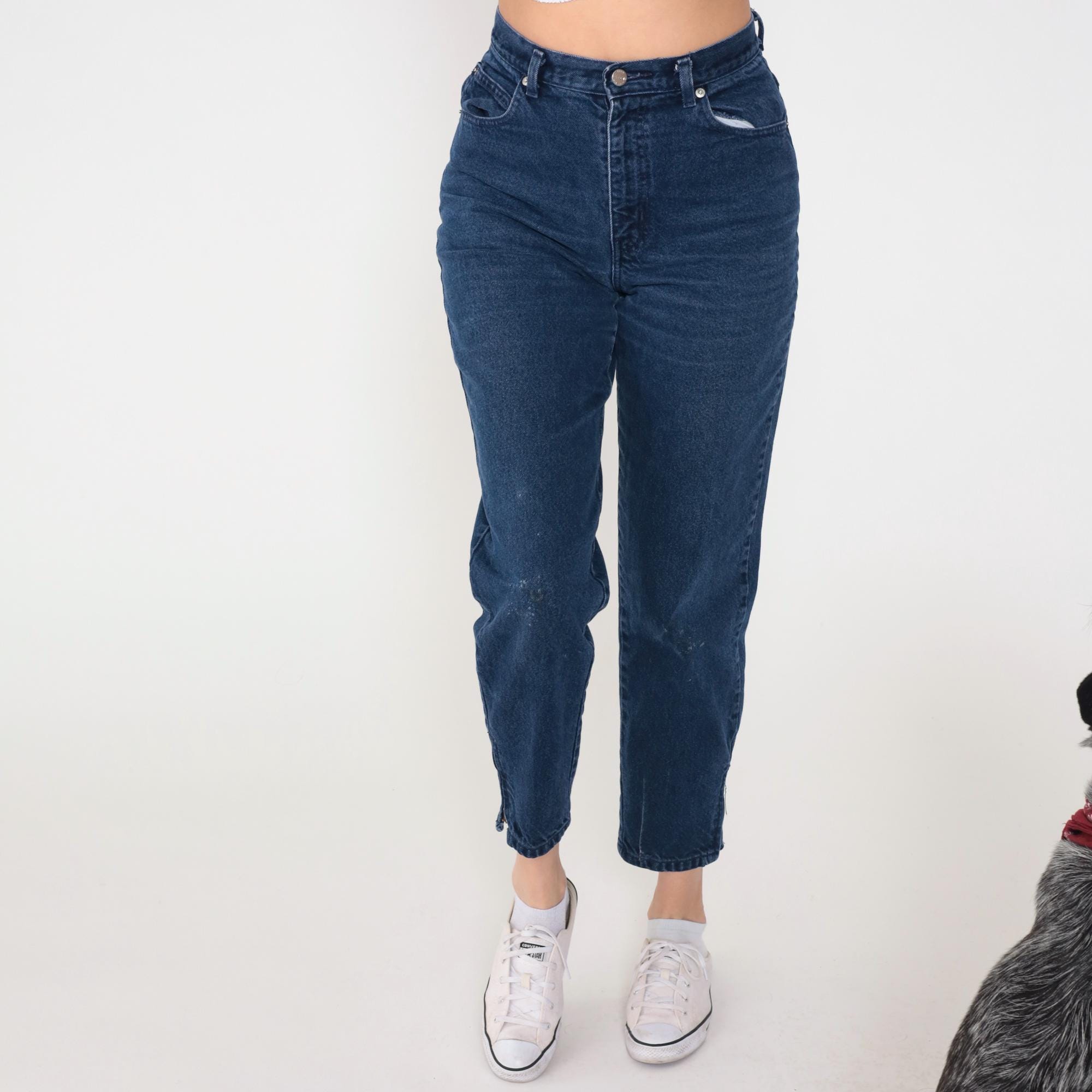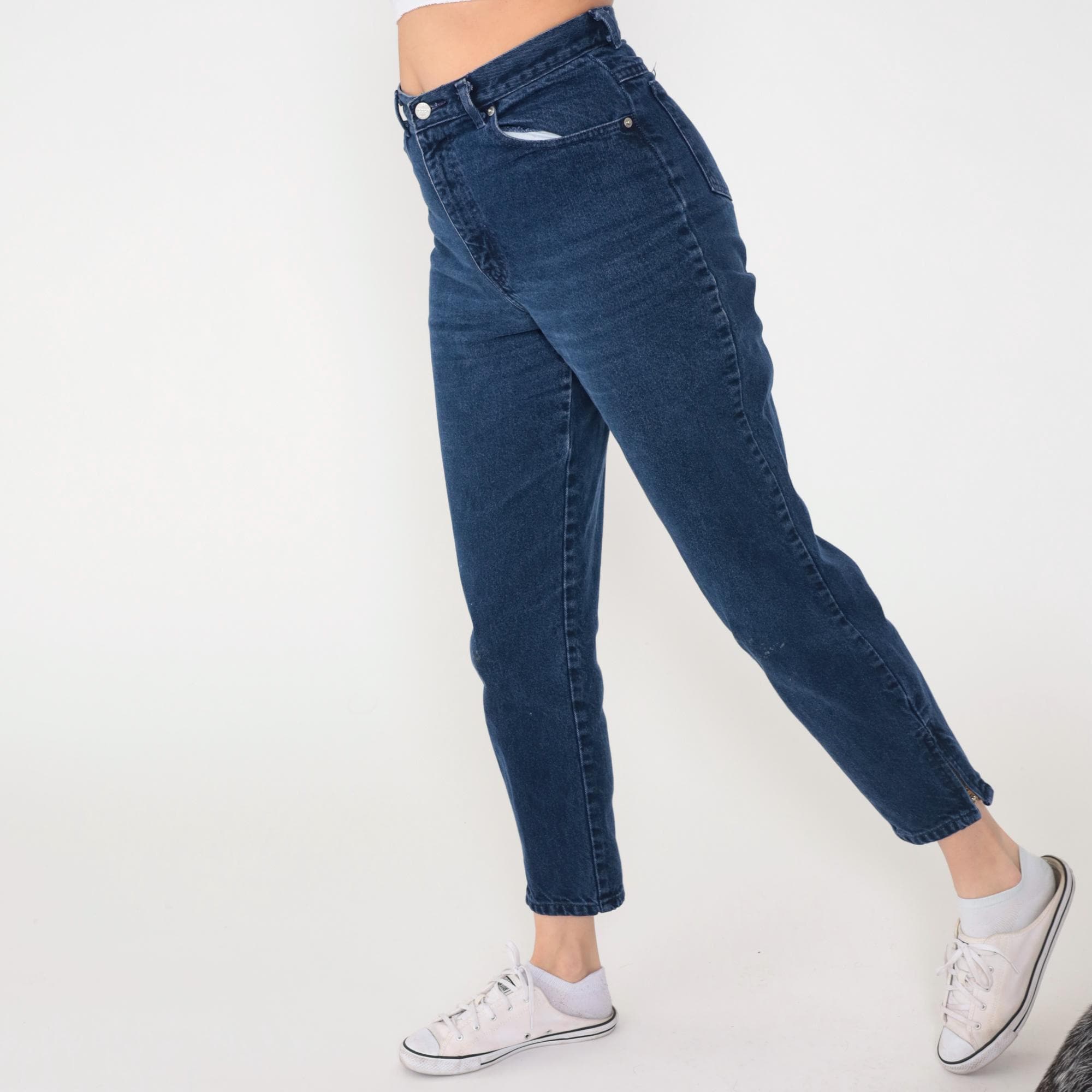 90s dark blue high-waisted mom jeans from Sasson with button fly closure and traditional five-pocket styling. Tapered leg with cropped ankle-length hem, belt loops at waist. Light fading and distressing across the denim.
