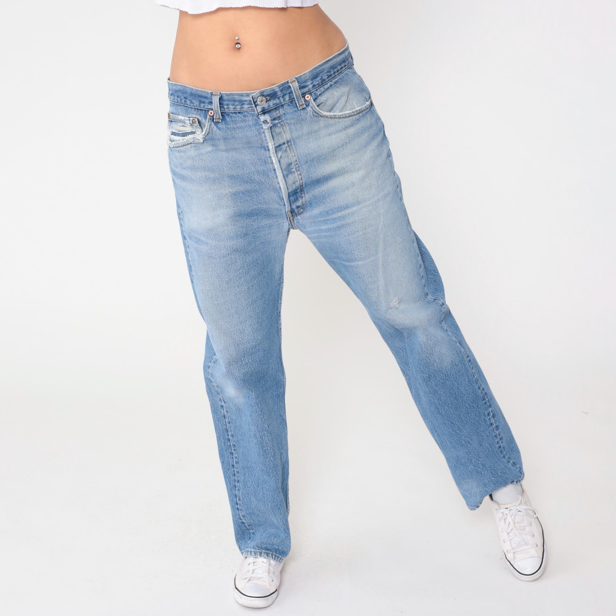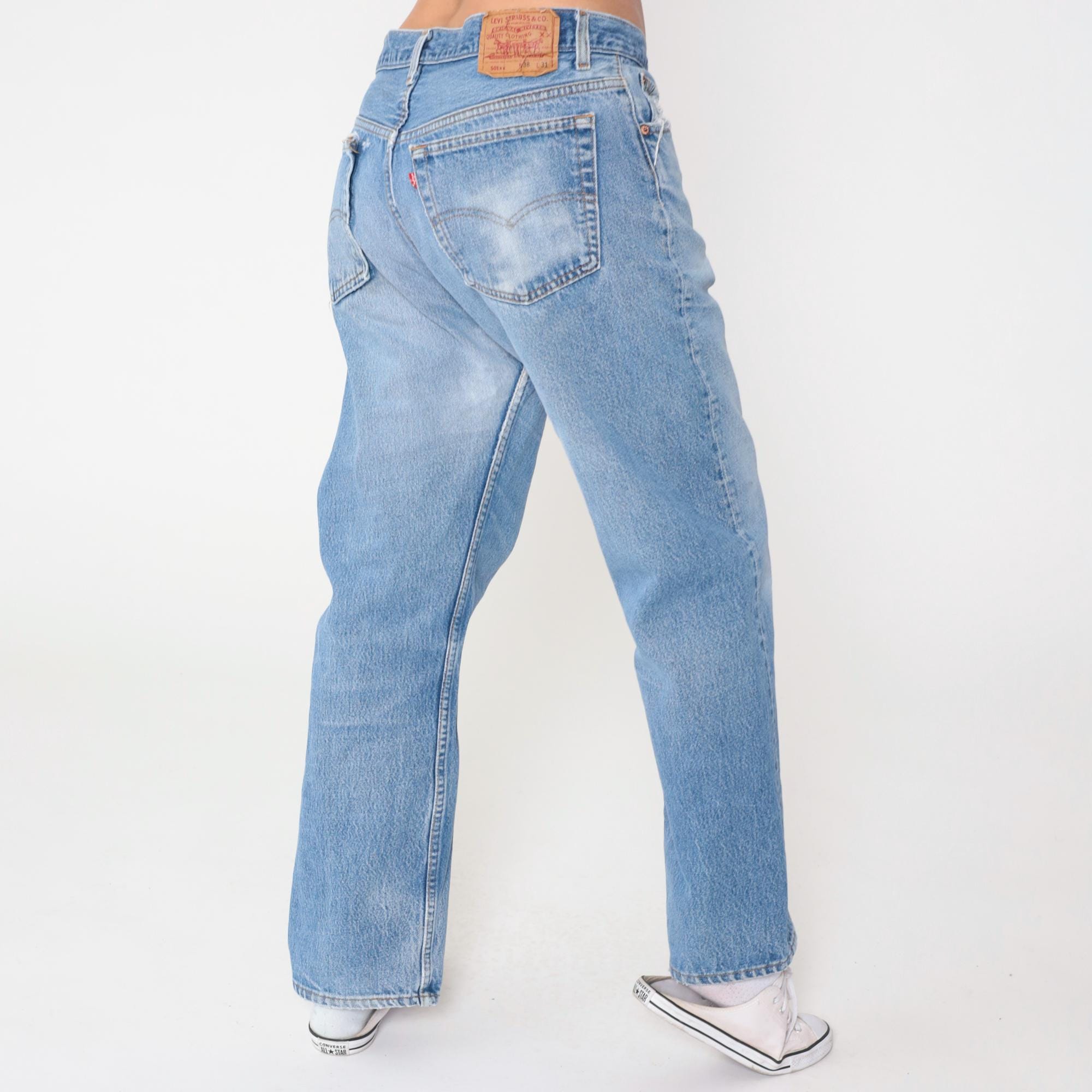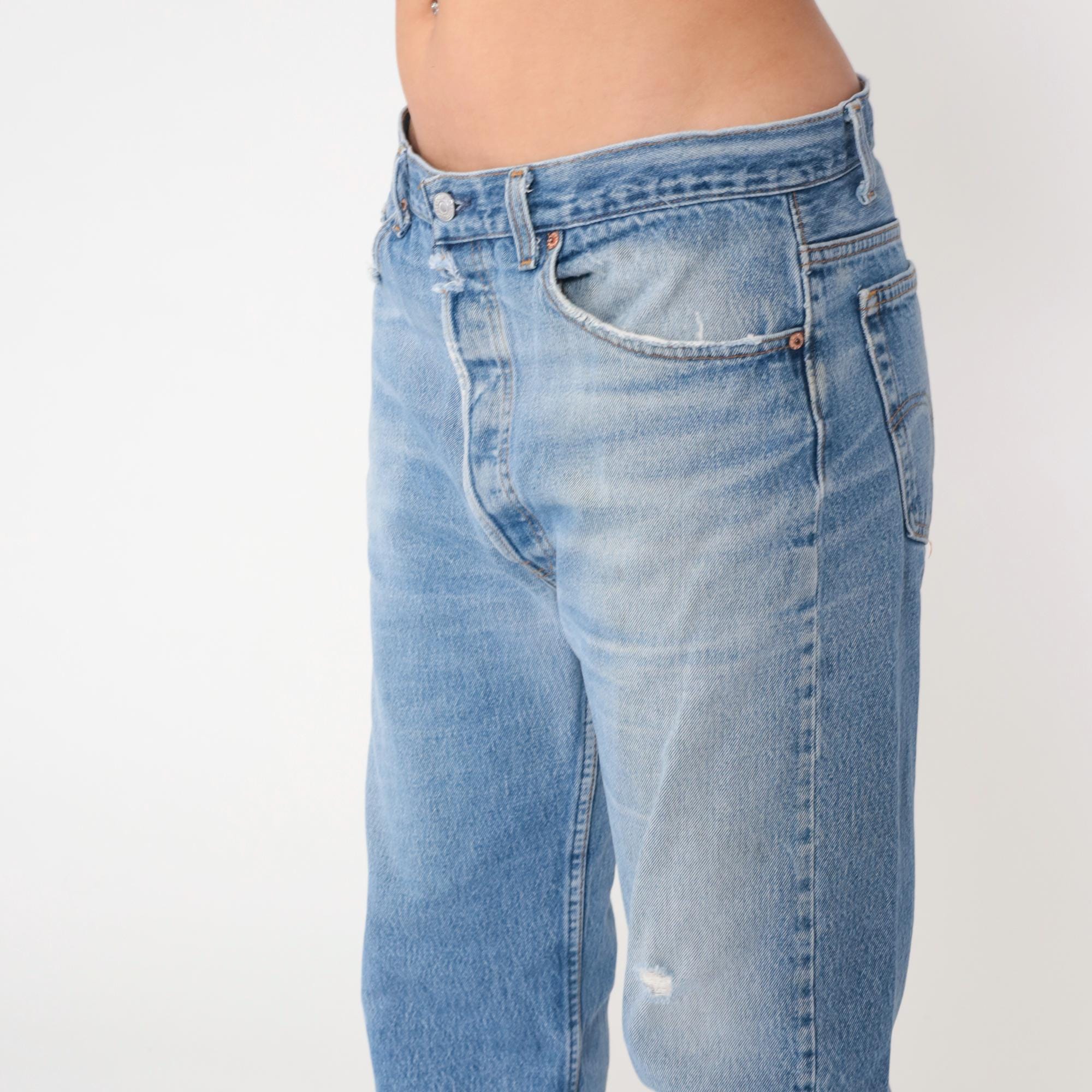 90s Levi's 501 jeans in light blue denim with faded wash and gentle distressing throughout. Button fly closure, classic straight leg cut, five-pocket styling with signature arcuate stitching on back pockets.