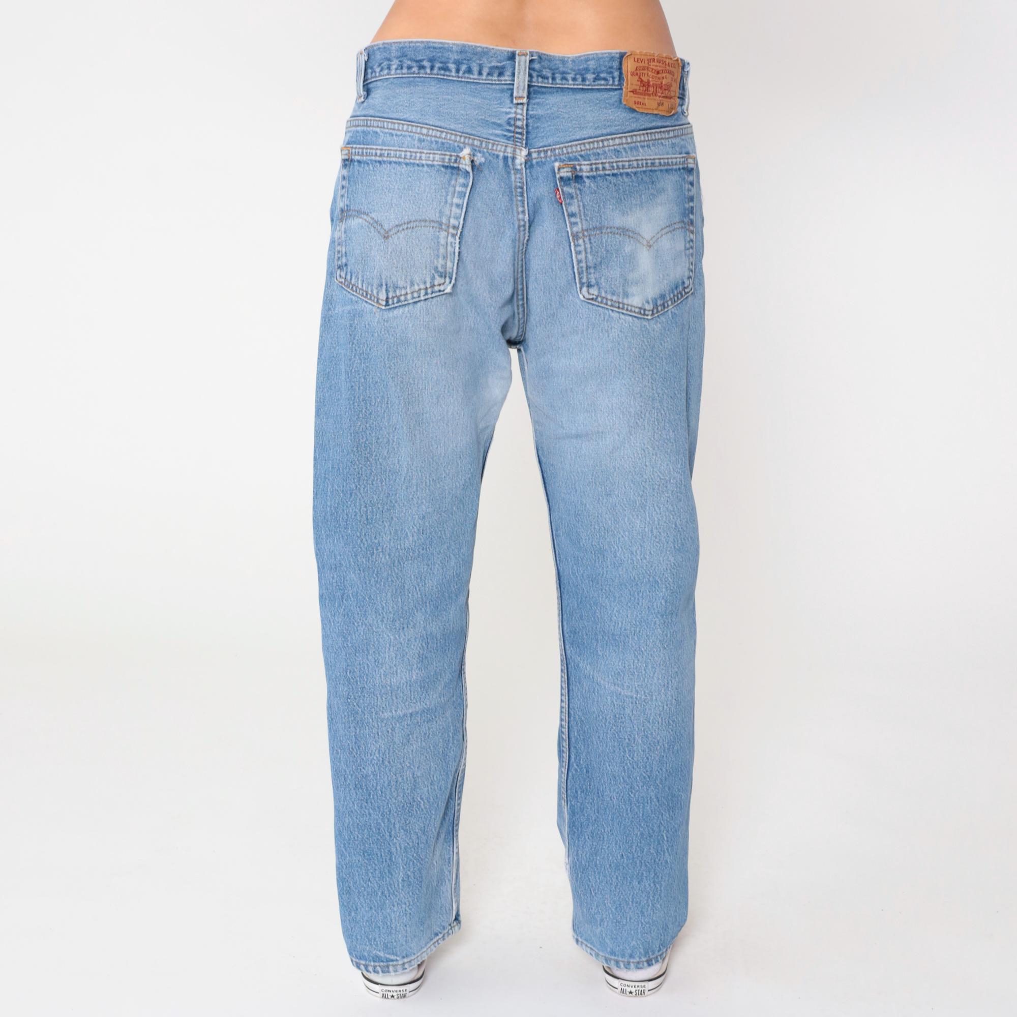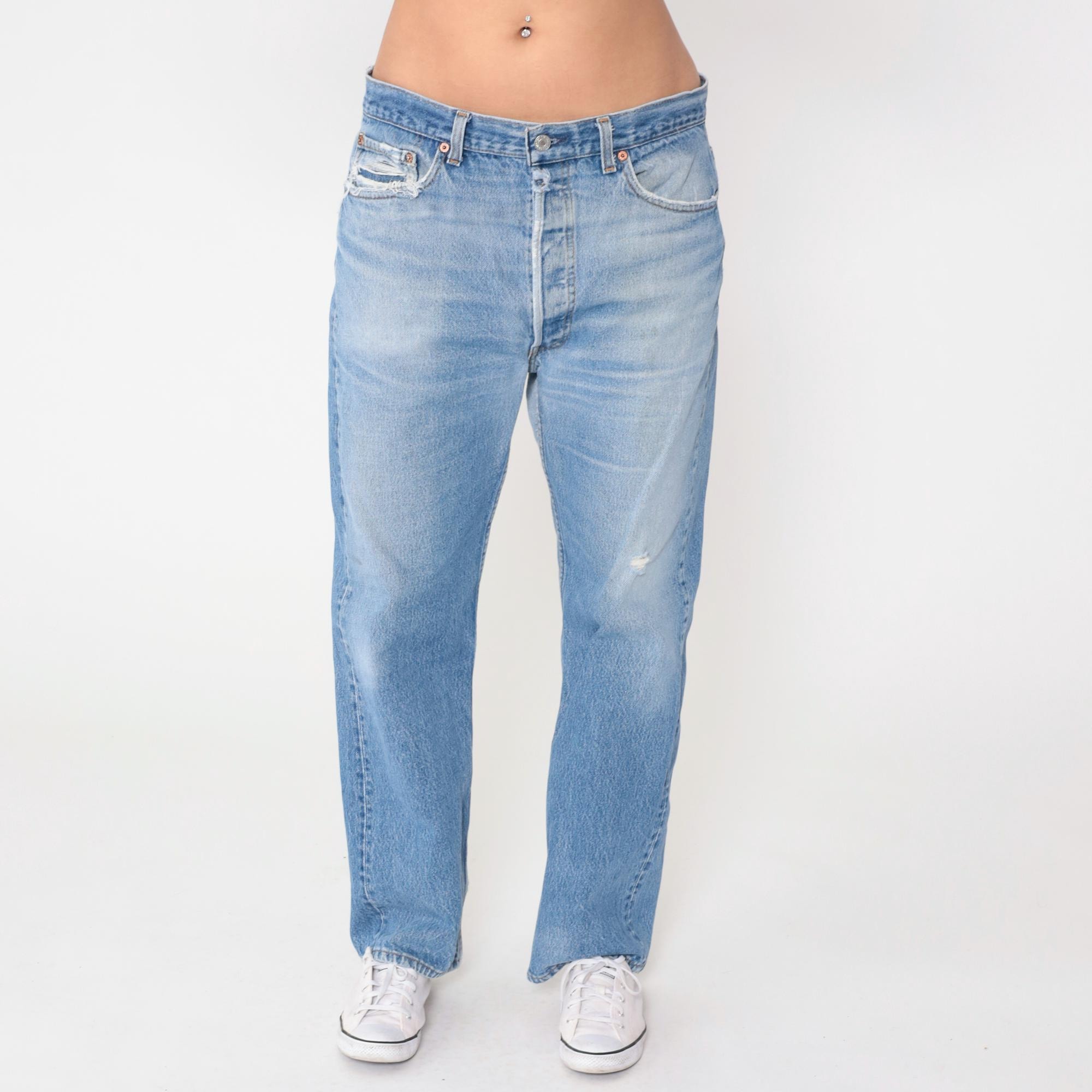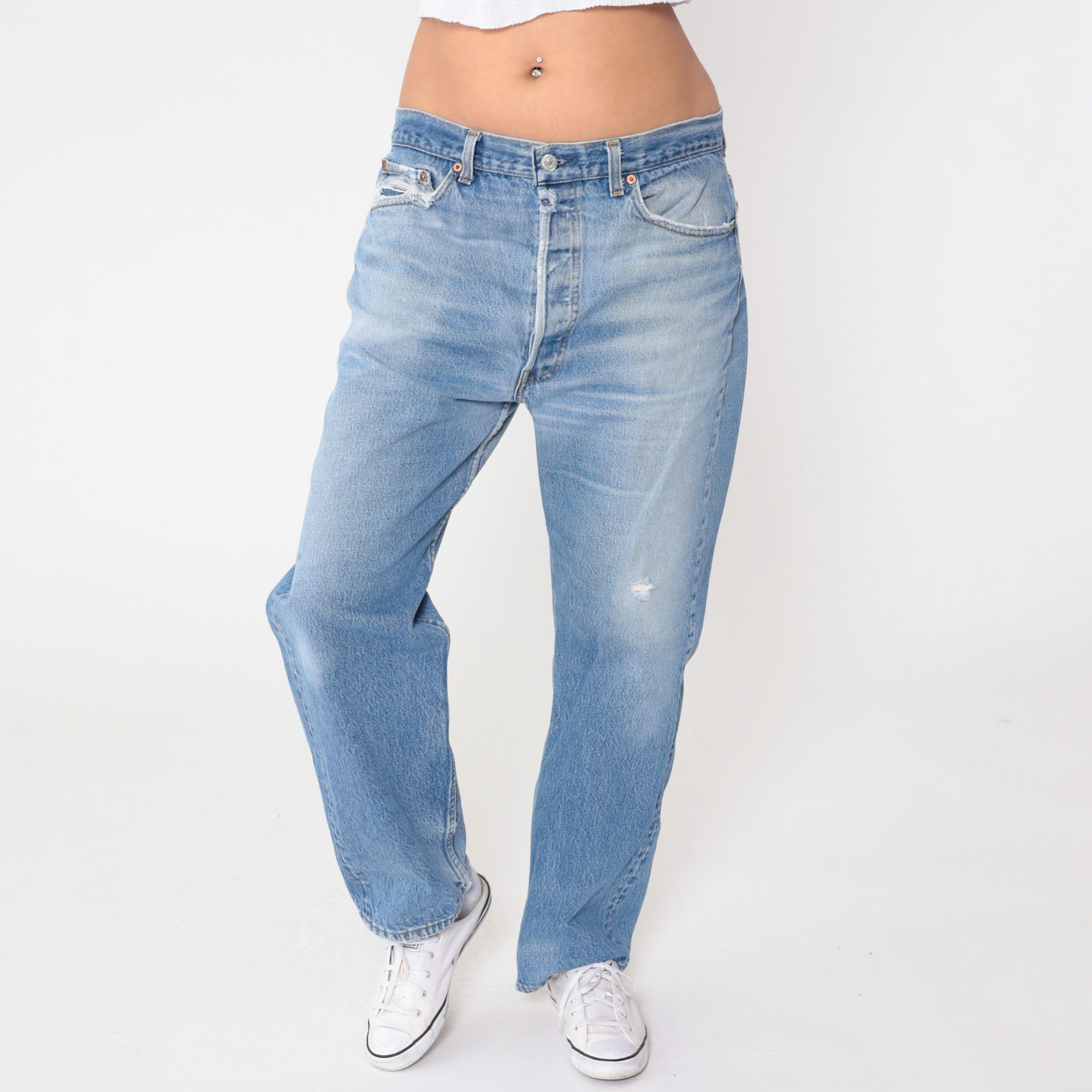 90s Levi's 501 jeans in light blue denim with faded wash and gentle distressing throughout. Button fly closure, classic straight leg cut, five-pocket styling with signature arcuate stitching on back pockets.