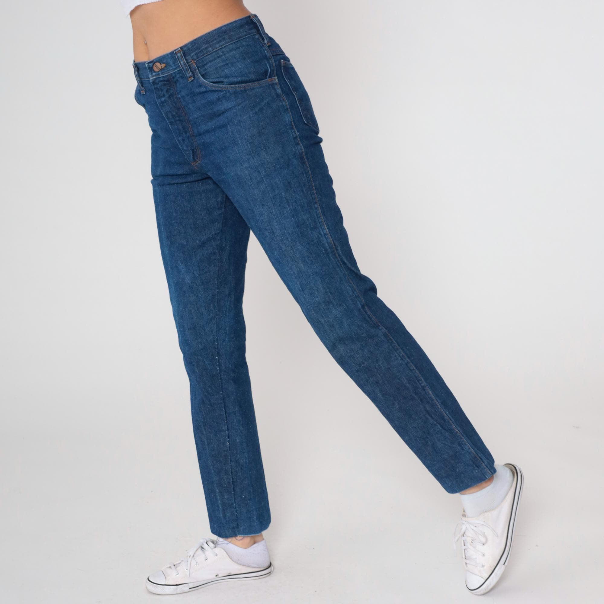 80s medium blue high-waisted jeans from Wrangler with straight leg cut and button fly closure. Five-pocket styling with brown leather Wrangler patch at back waistband, belt loops, raw hem at ankles.