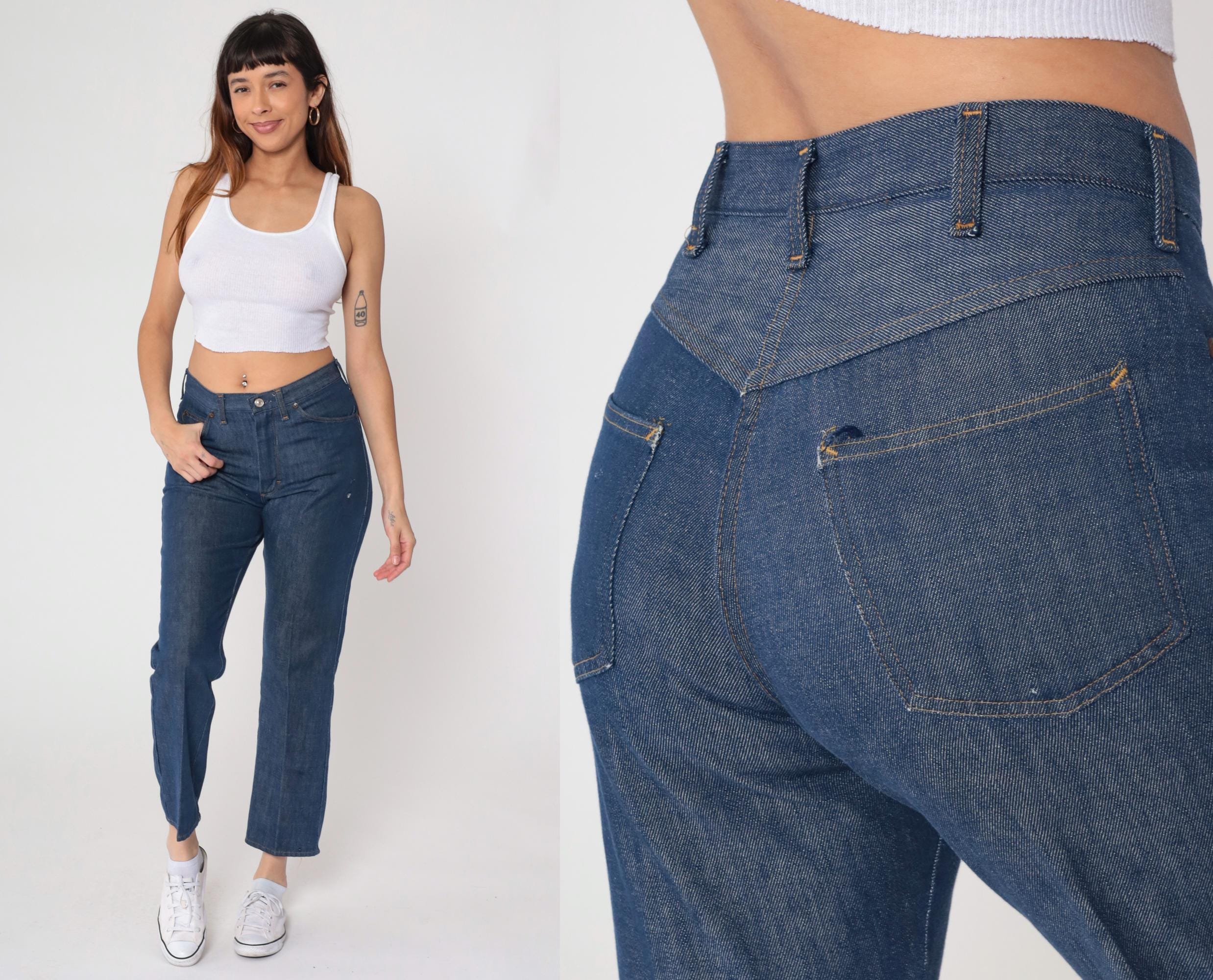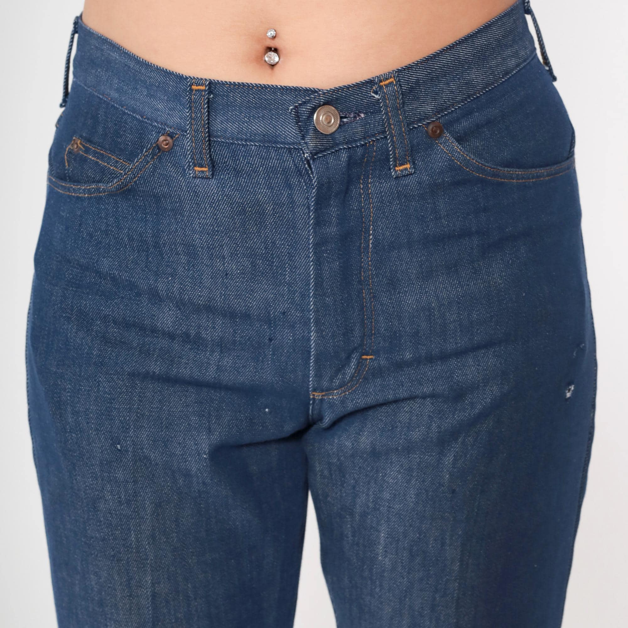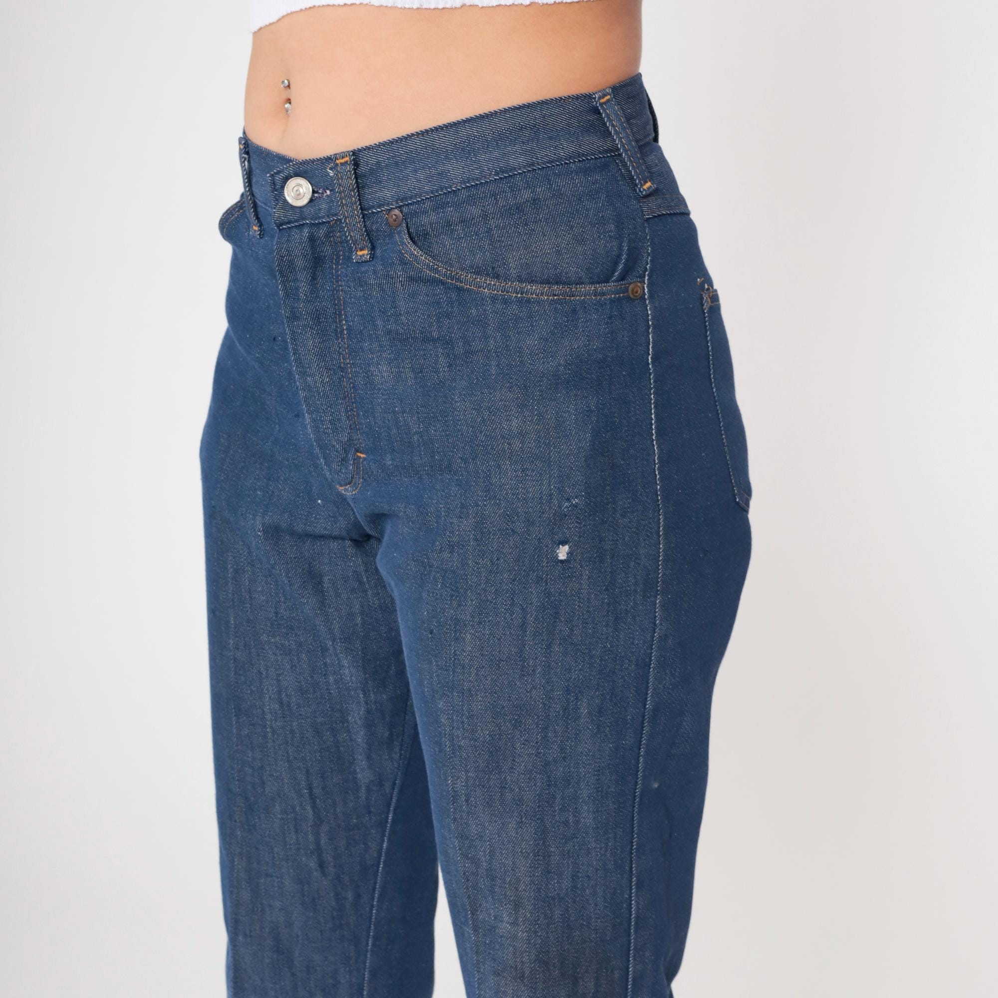Vintage denim was usually made without any stretch, unlike modern jeans. Check the measurements to ensure proper fit, and remember to give yourself a little wiggle room in the waist and hips, depending on your preferred fit.
