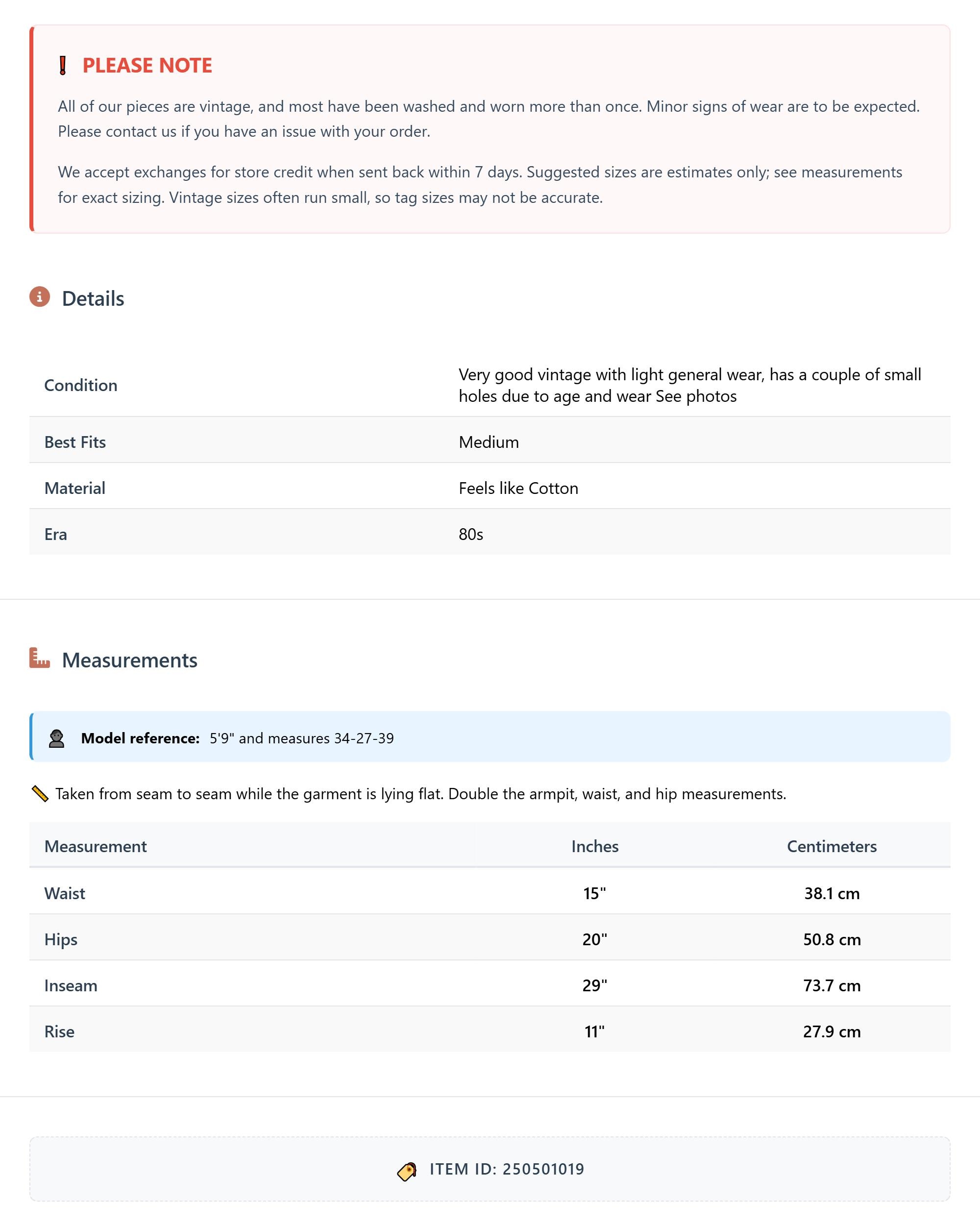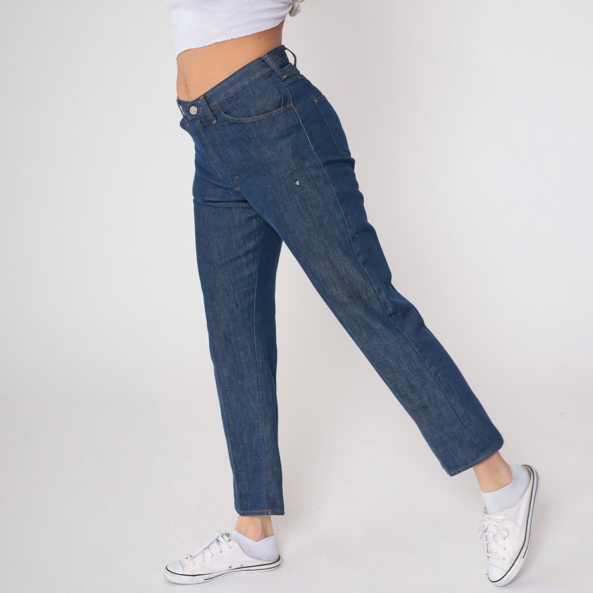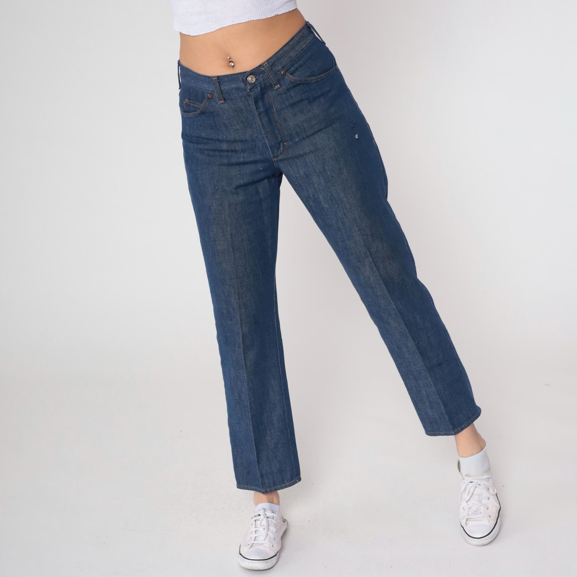 Vintage denim was usually made without any stretch, unlike modern jeans. Check the measurements to ensure proper fit, and remember to give yourself a little wiggle room in the waist and hips, depending on your preferred fit.