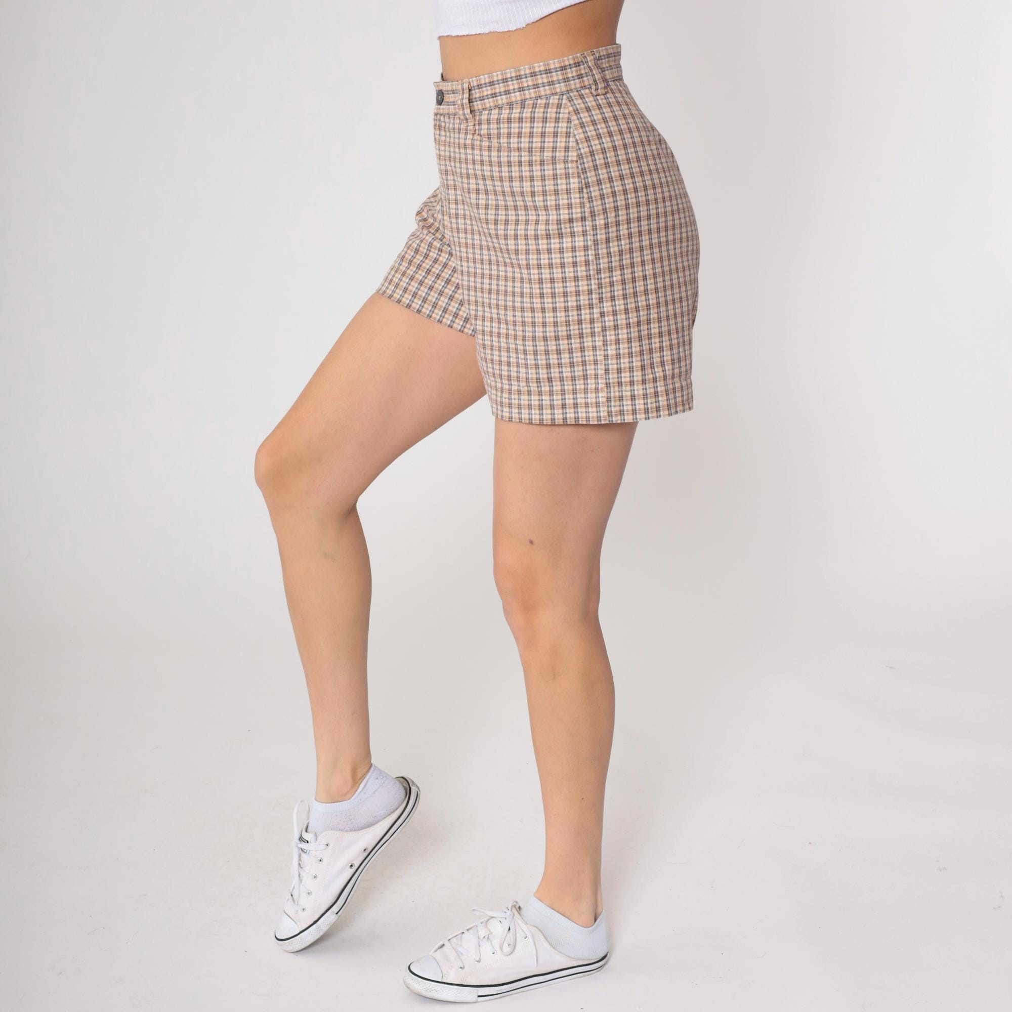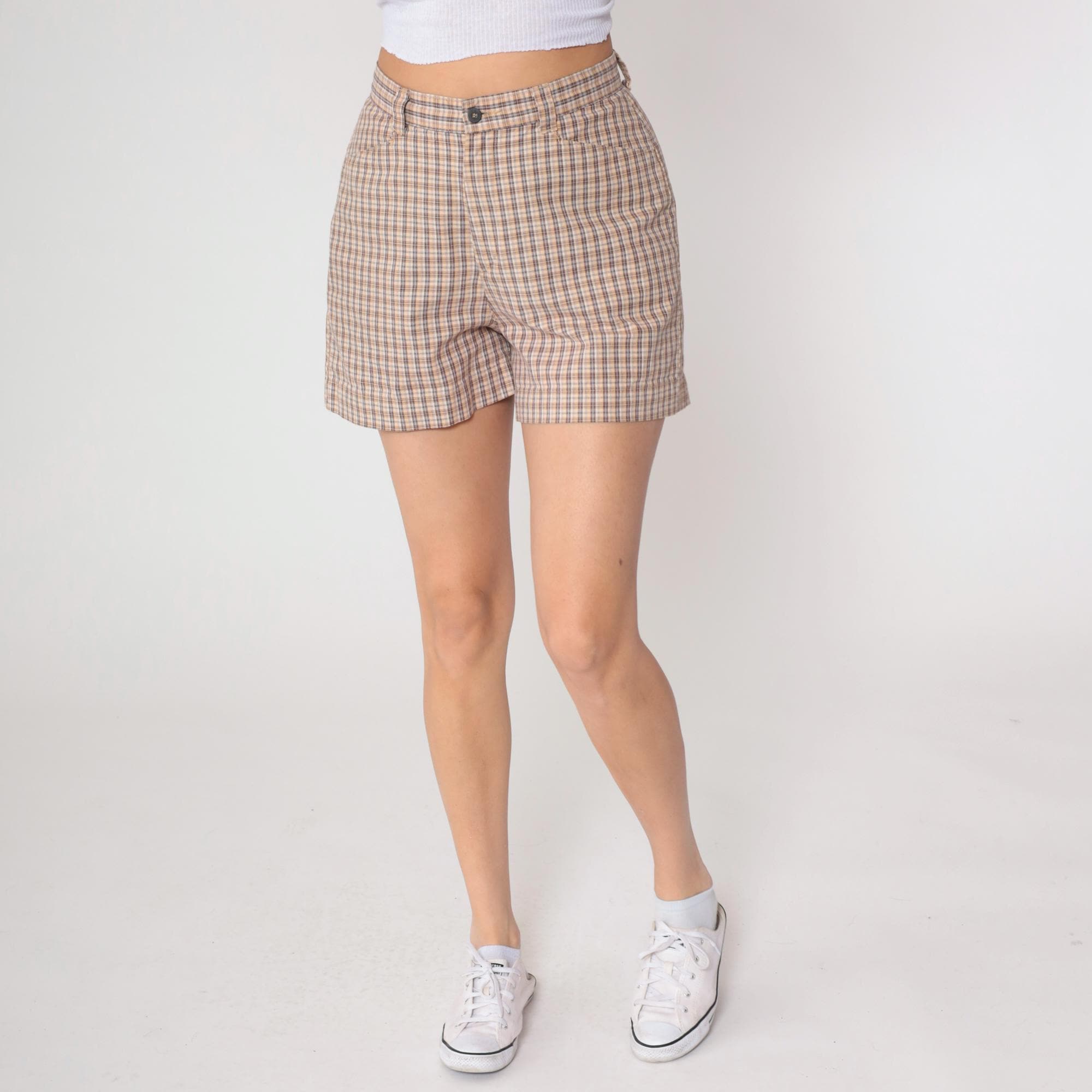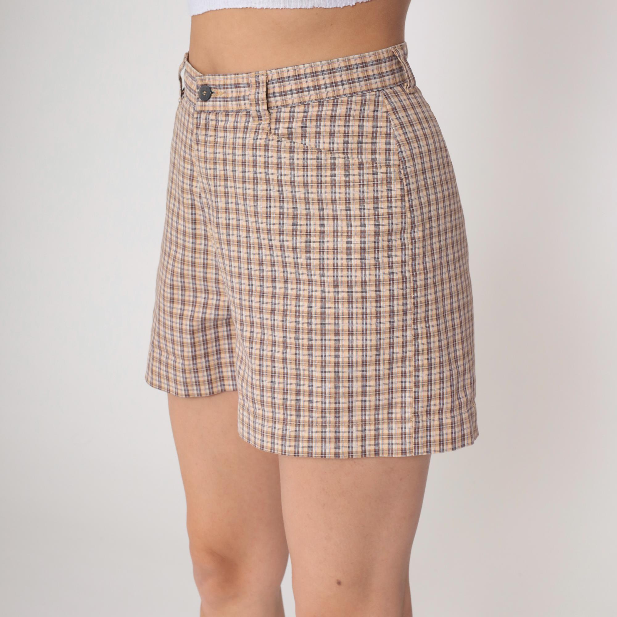 90s plaid shorts from Lee Casuals in beige, brown, and blue check pattern with high-waisted fit and button closure.