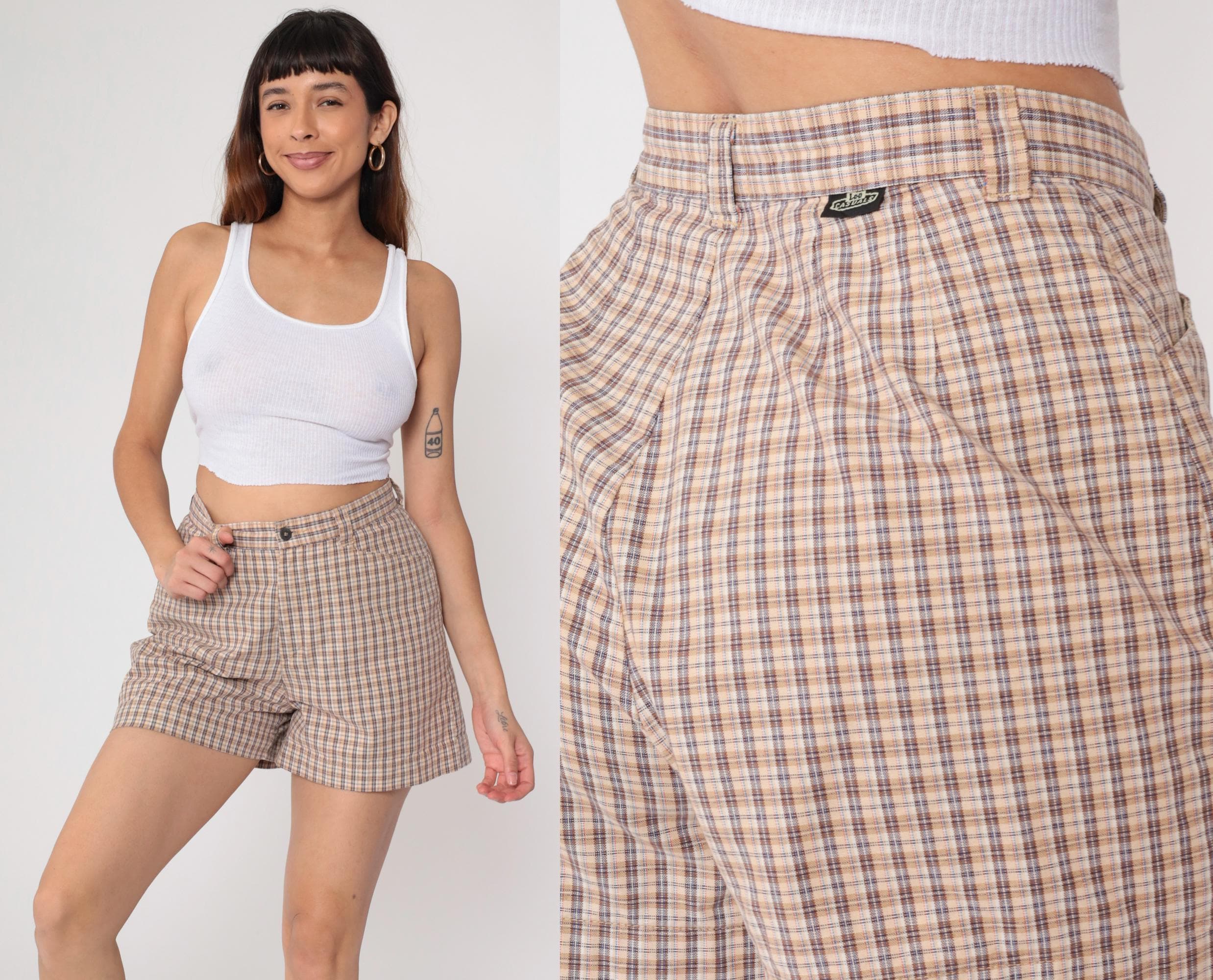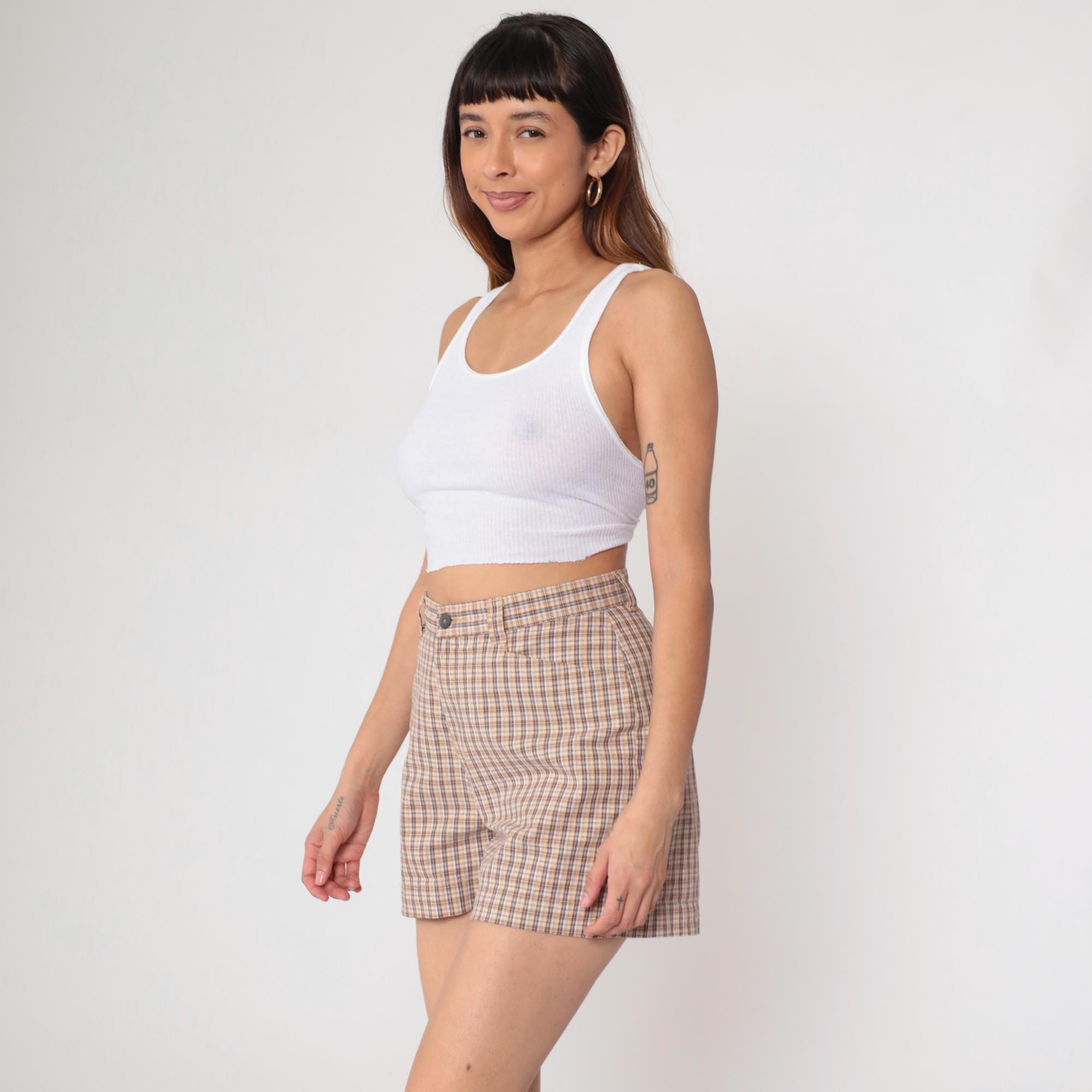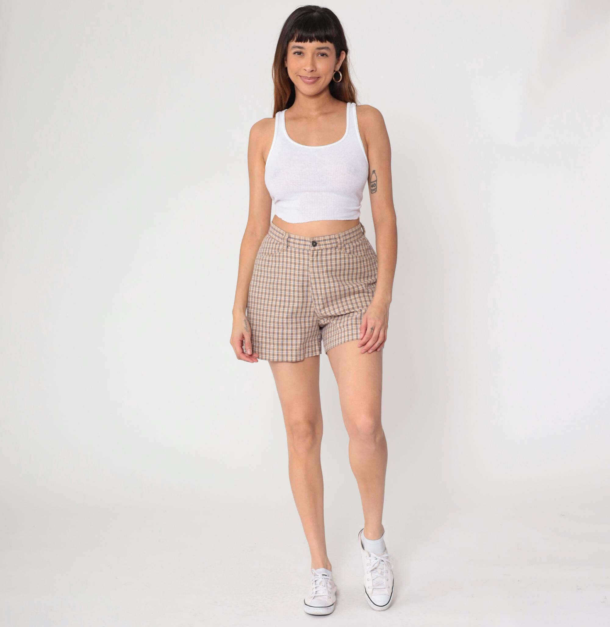 90s plaid shorts from Lee Casuals in beige, brown, and blue check pattern with high-waisted fit and button closure.