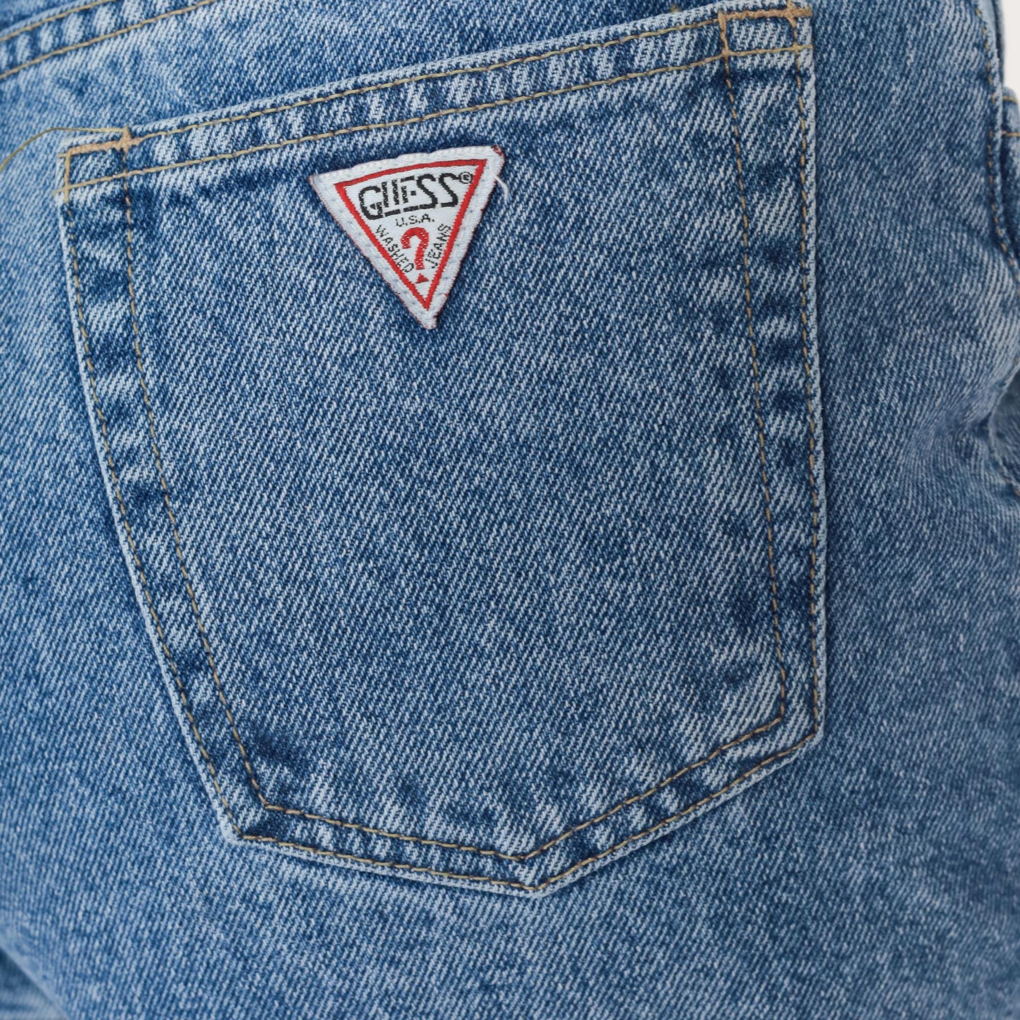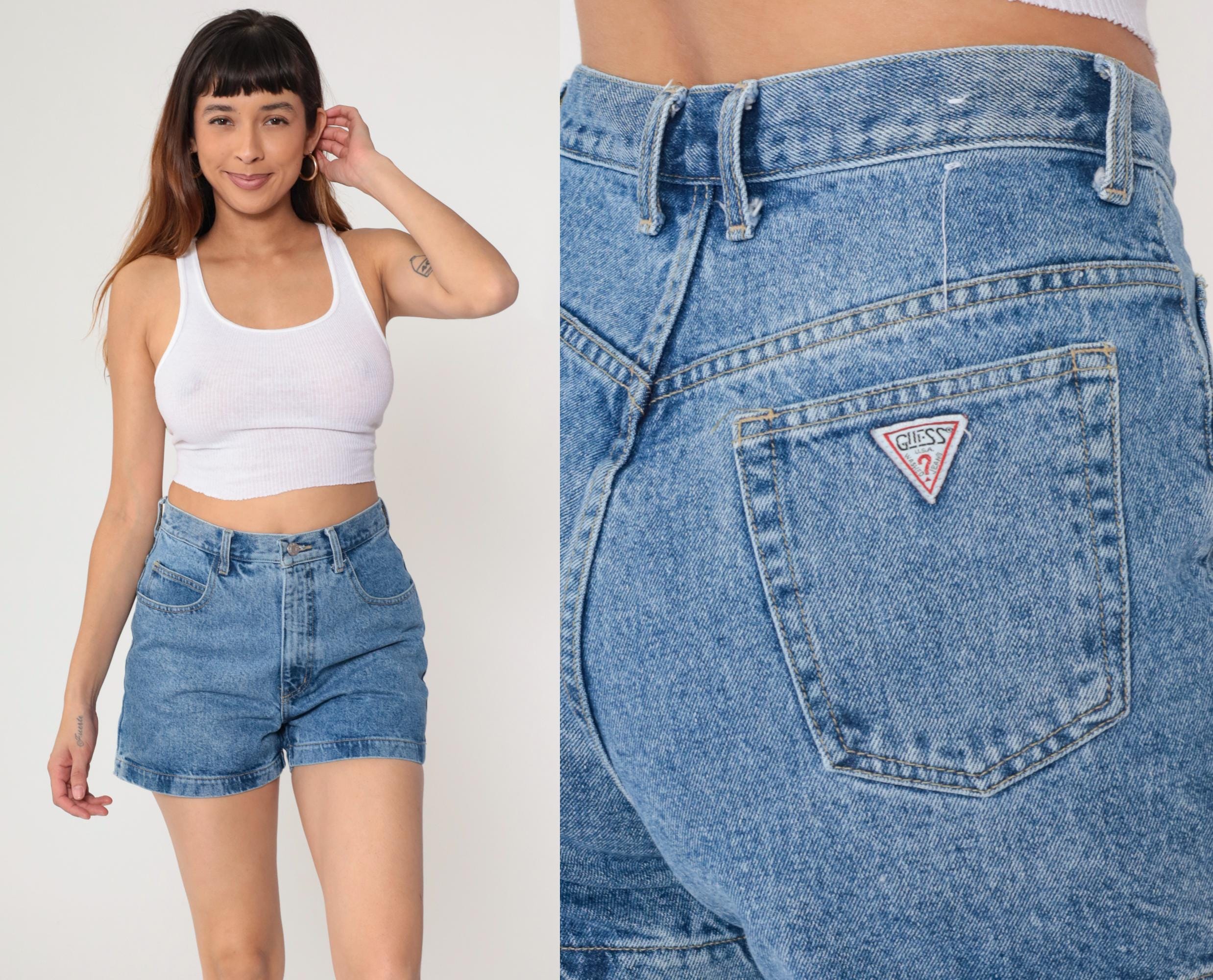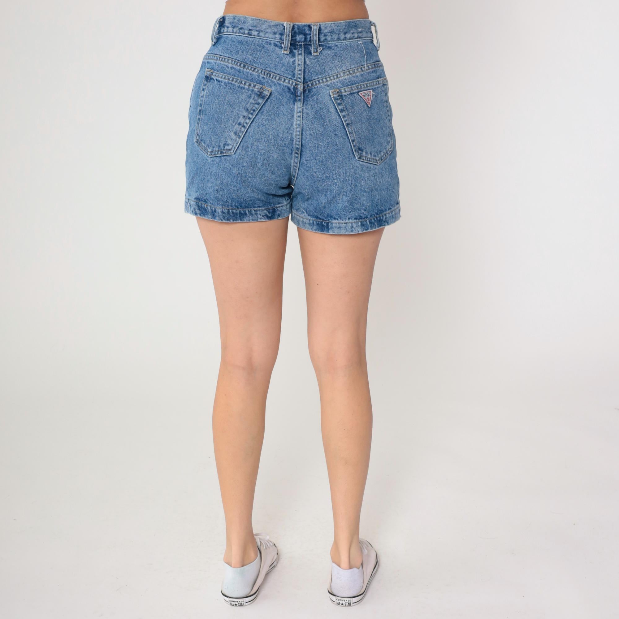 90s high-waisted denim shorts from Guess Jeans in light blue wash with button fly closure and rolled hems. Triangle Guess logo patch on back right pocket, front hip pockets, back patch pockets.