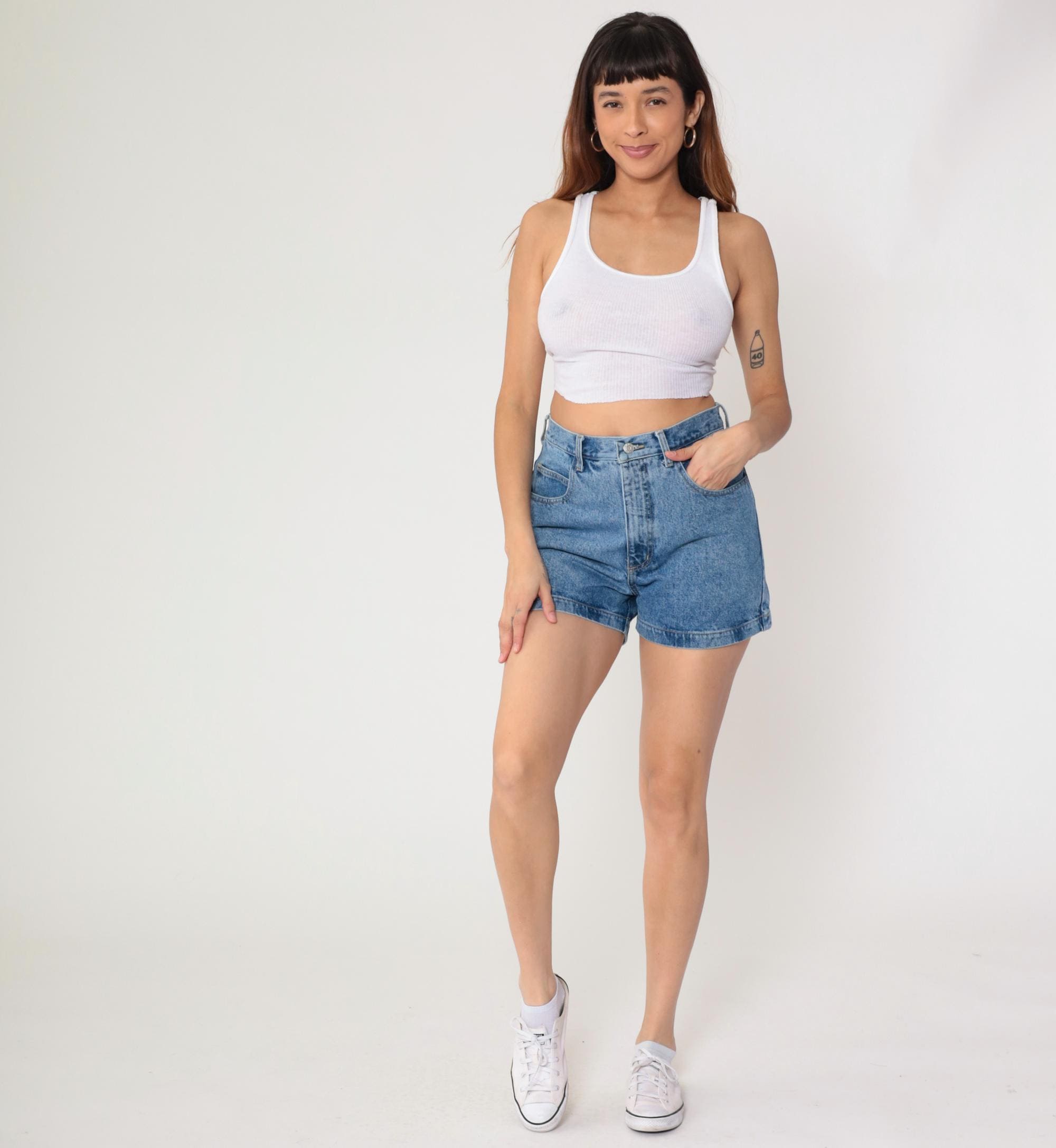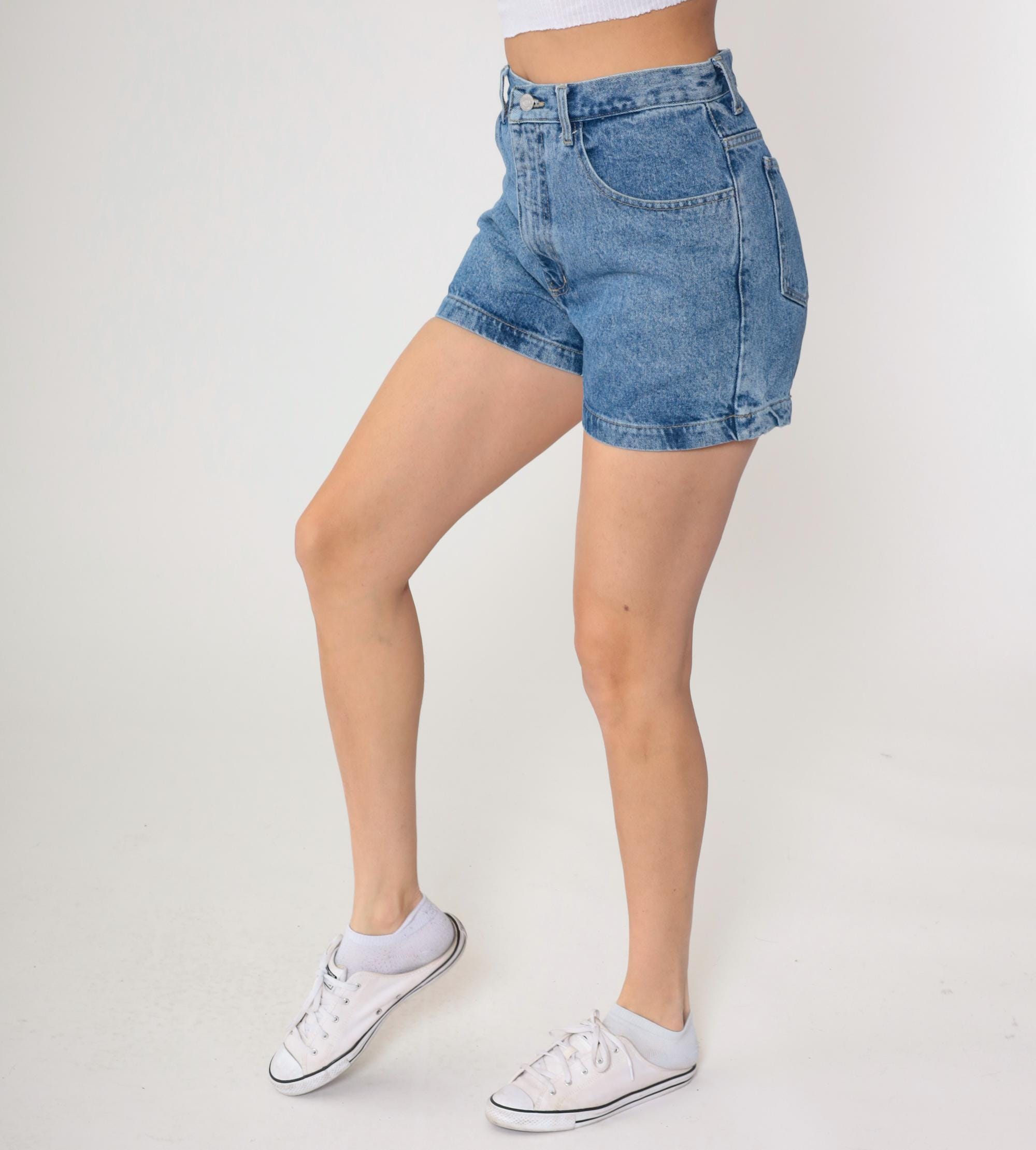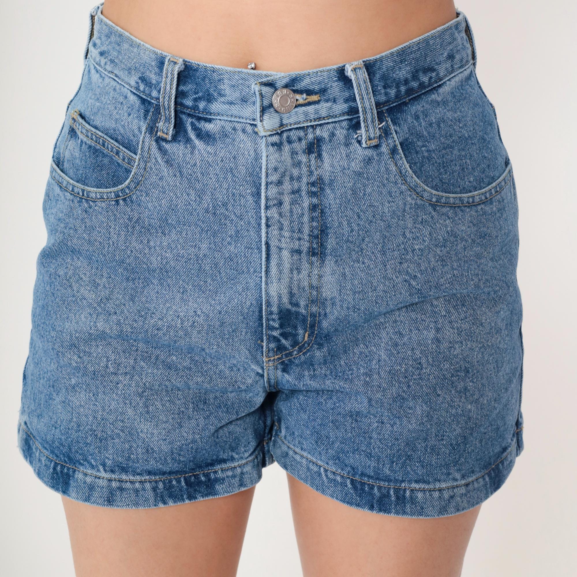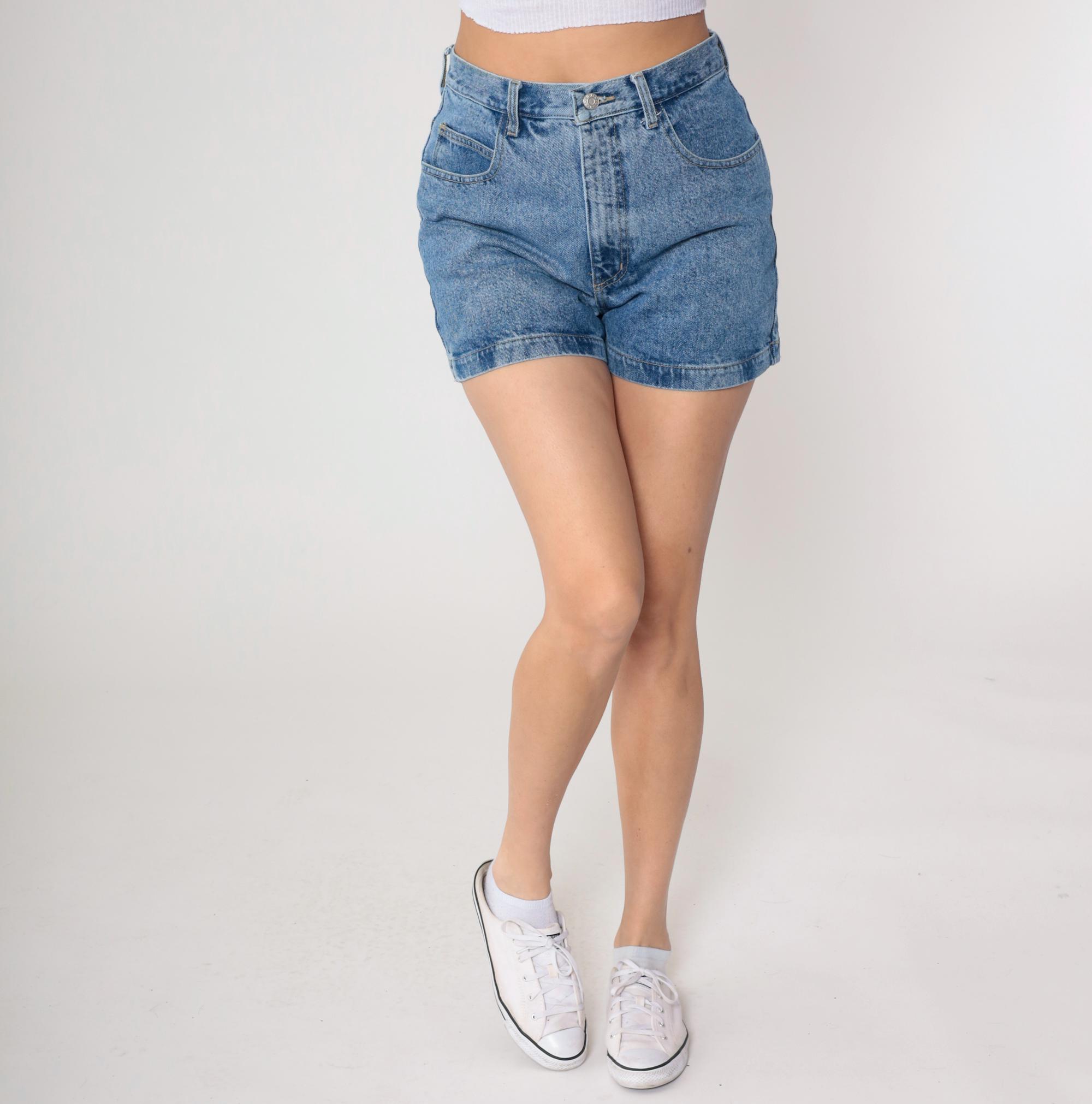 90s high-waisted denim shorts from Guess Jeans in light blue wash with button fly closure and rolled hems. Triangle Guess logo patch on back right pocket, front hip pockets, back patch pockets.