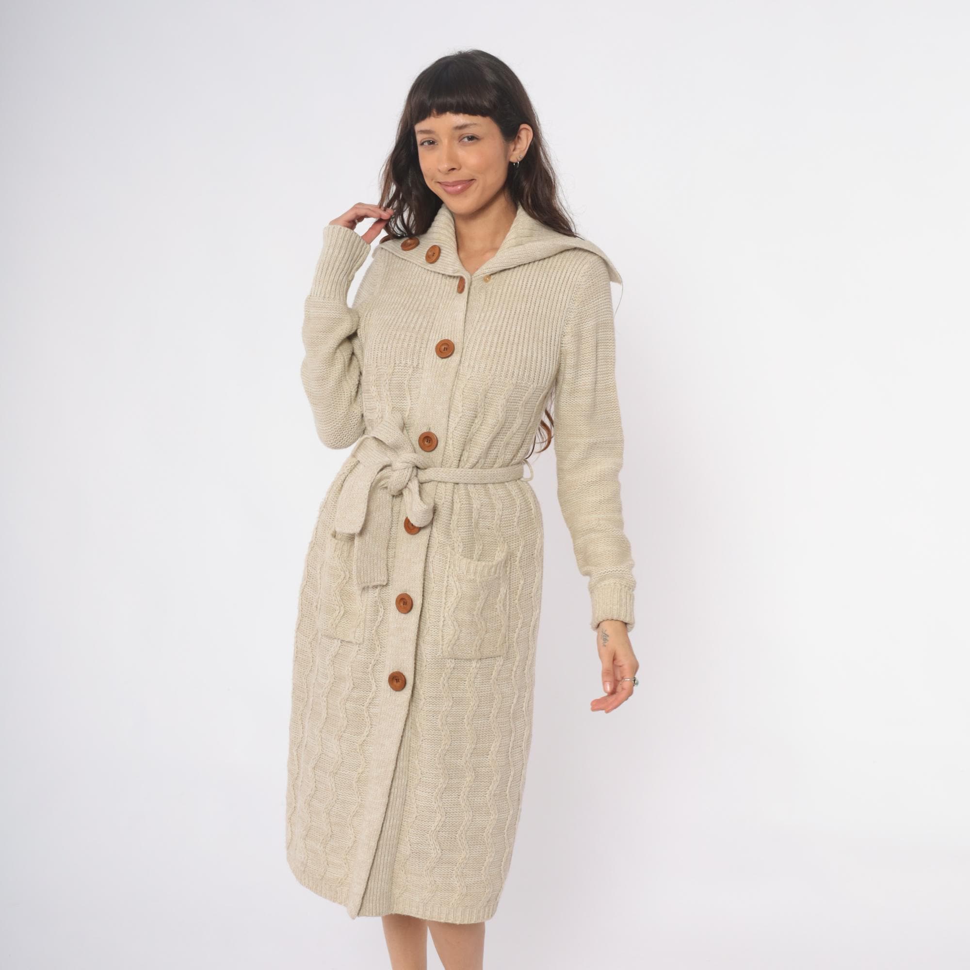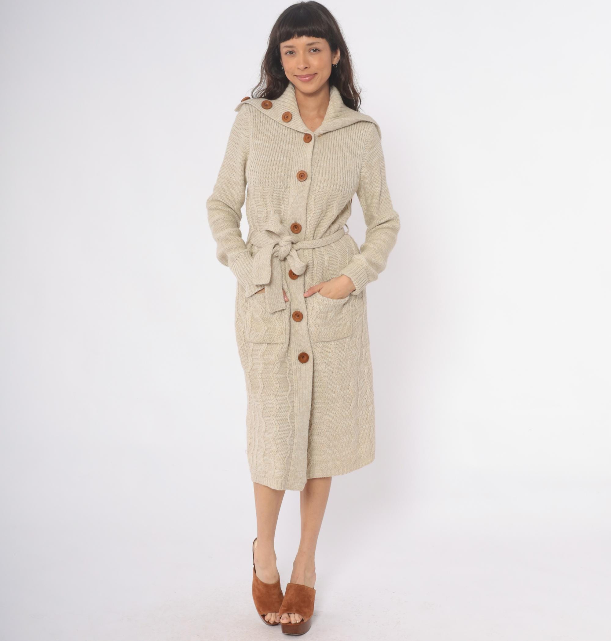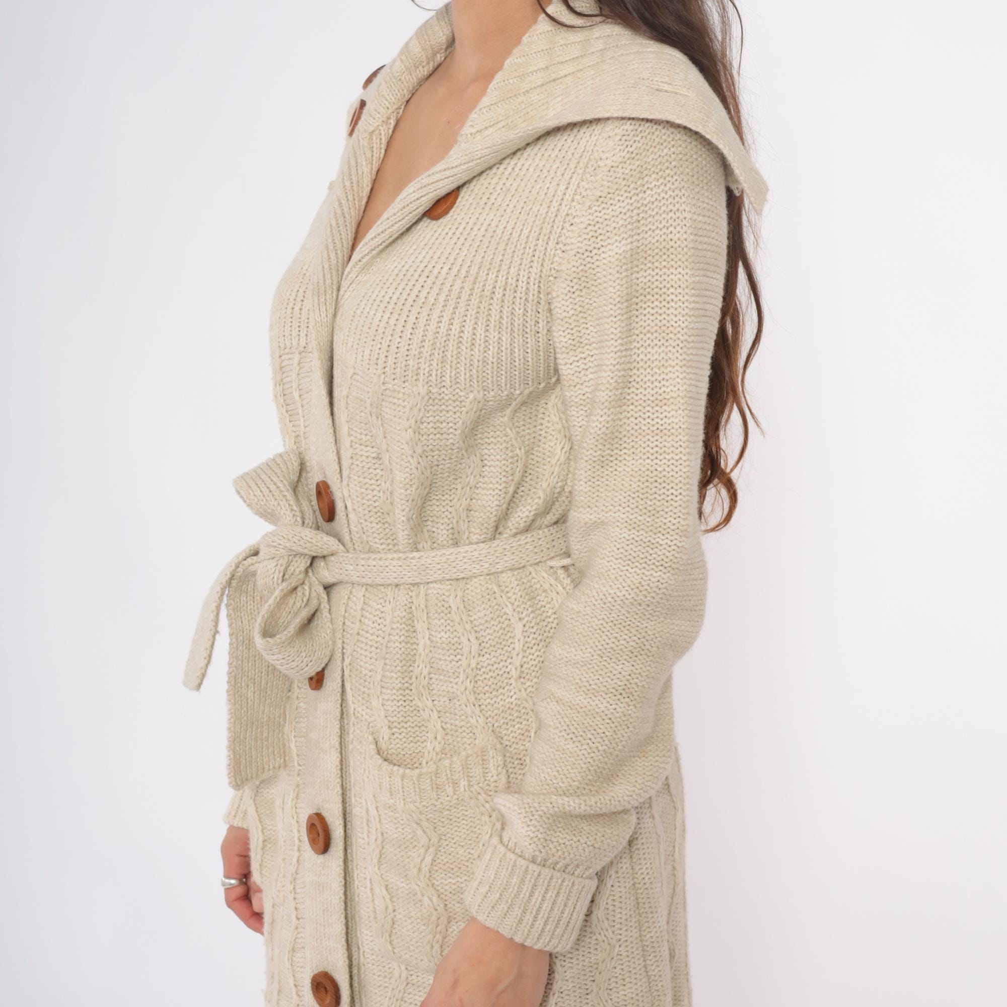 70s cream cable knit cardigan robe from dawn international with wide shawl collar, brown wooden buttons, and matching tie belt. Long sleeves with ribbed cuffs, two patch pockets at hips, cable knit pattern throughout. Shawl collar features decorative button detail at each side.