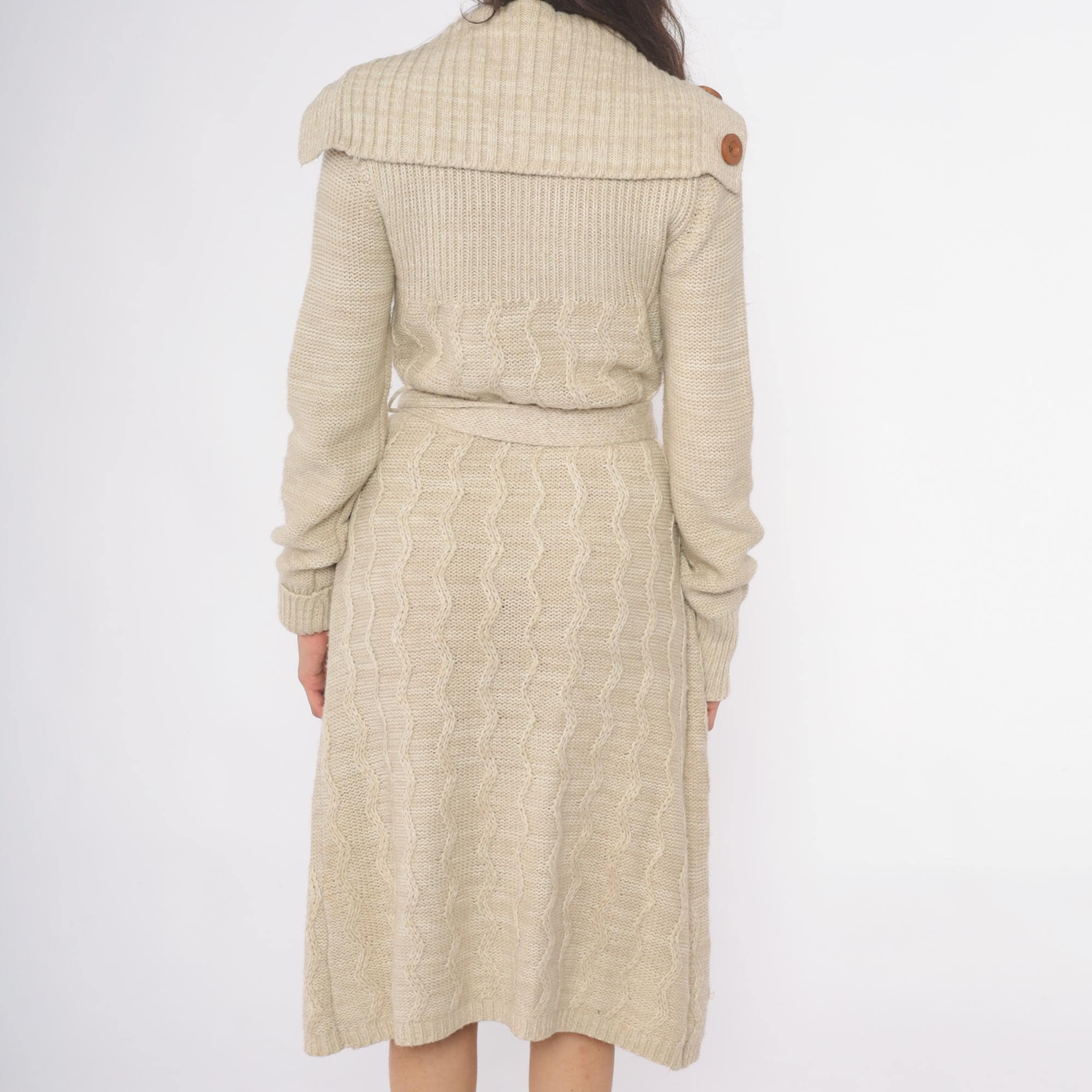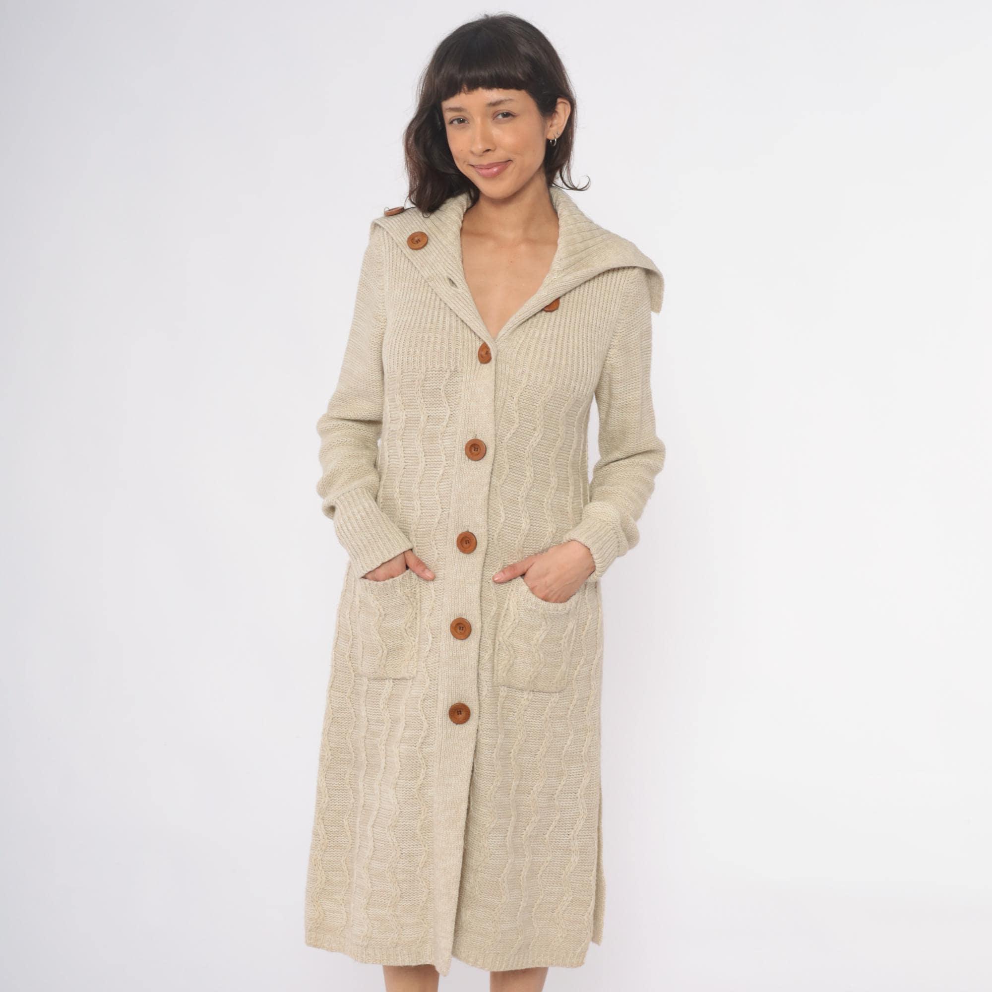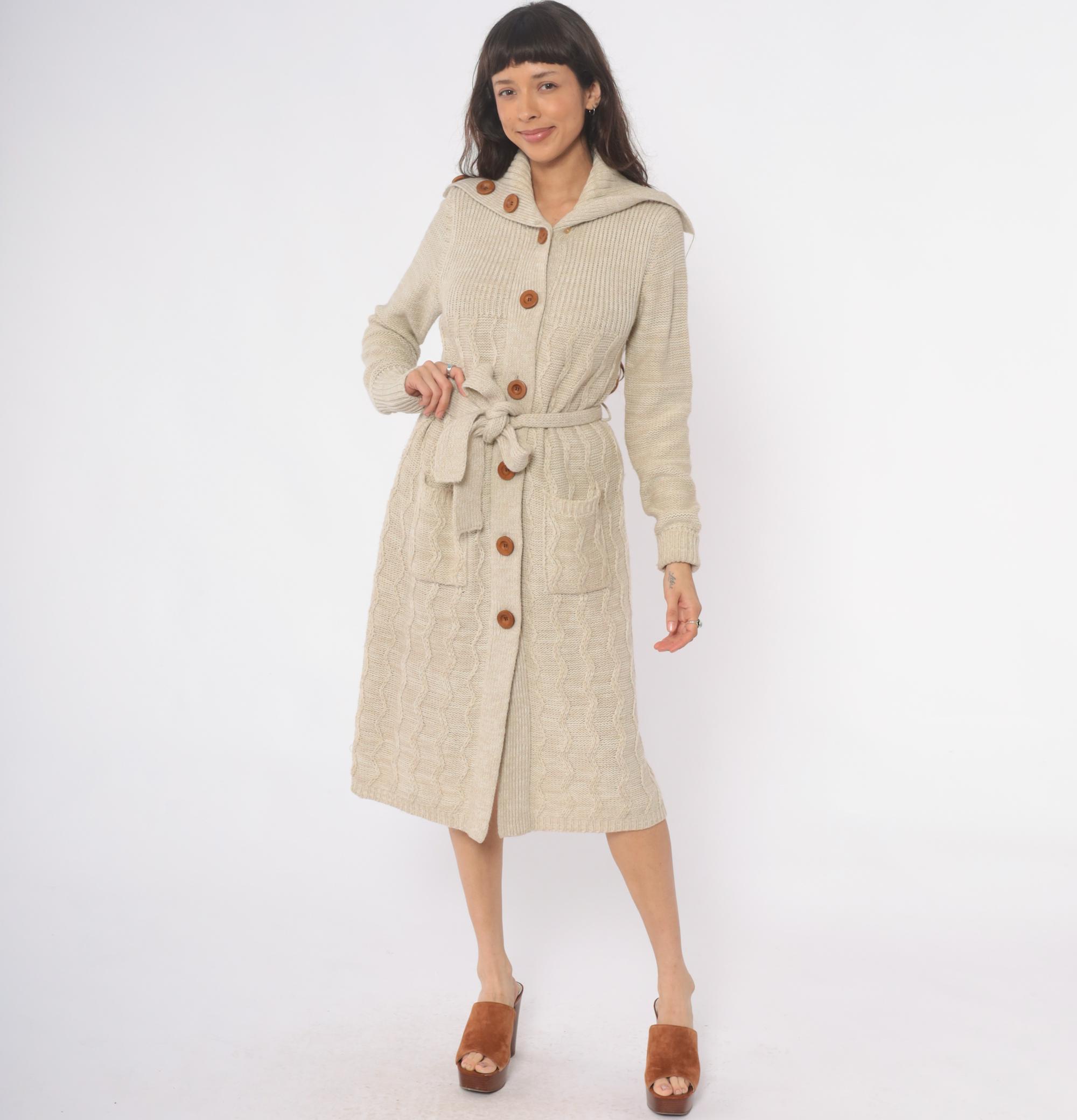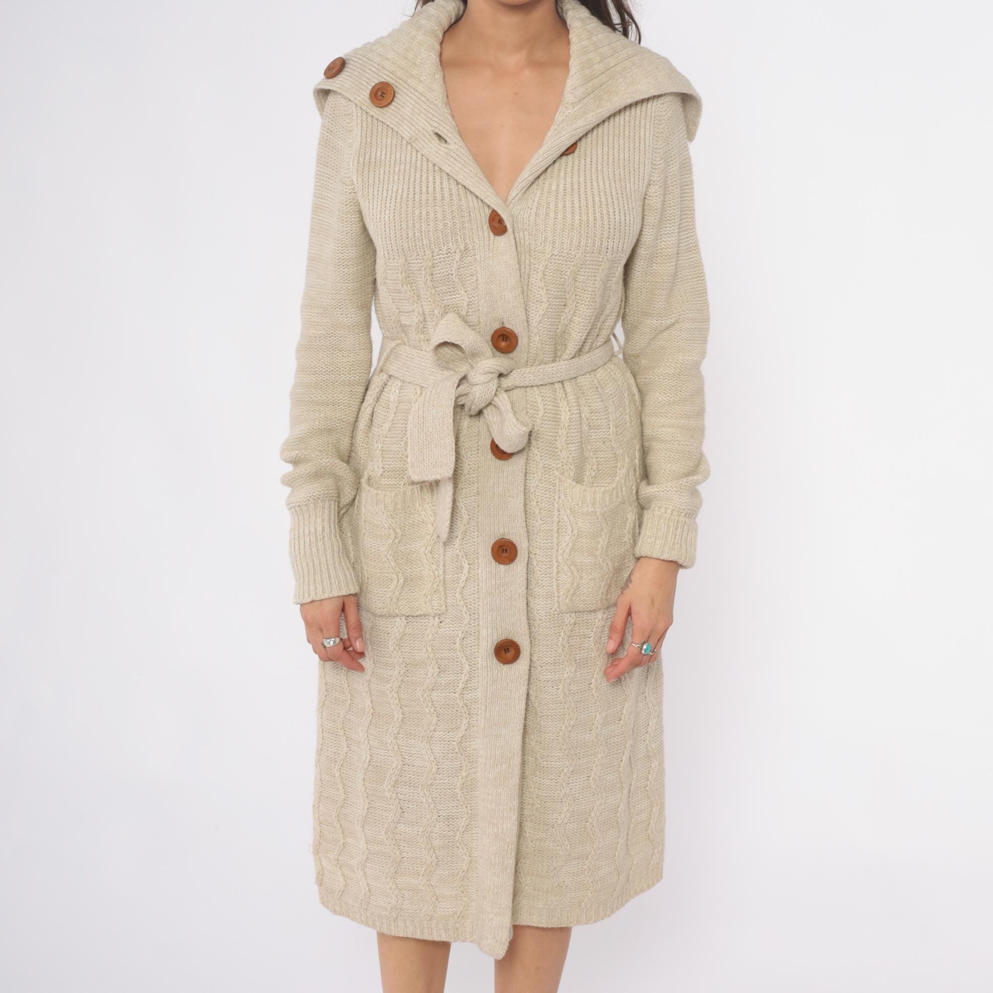 70s cream cable knit cardigan robe from dawn international with wide shawl collar, brown wooden buttons, and matching tie belt. Long sleeves with ribbed cuffs, two patch pockets at hips, cable knit pattern throughout. Shawl collar features decorative button detail at each side.